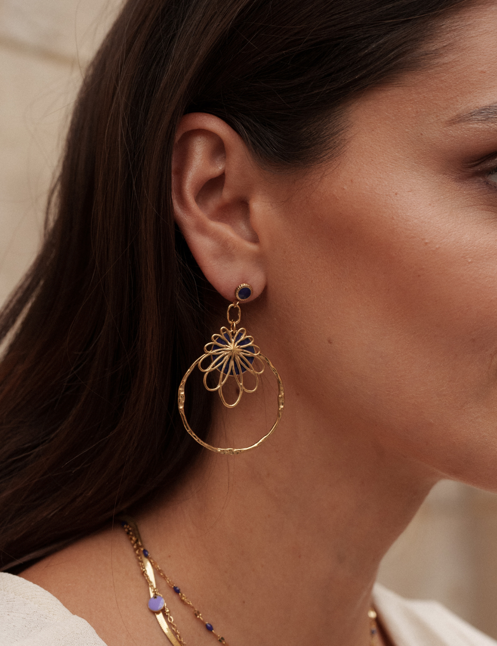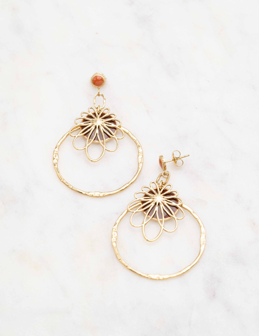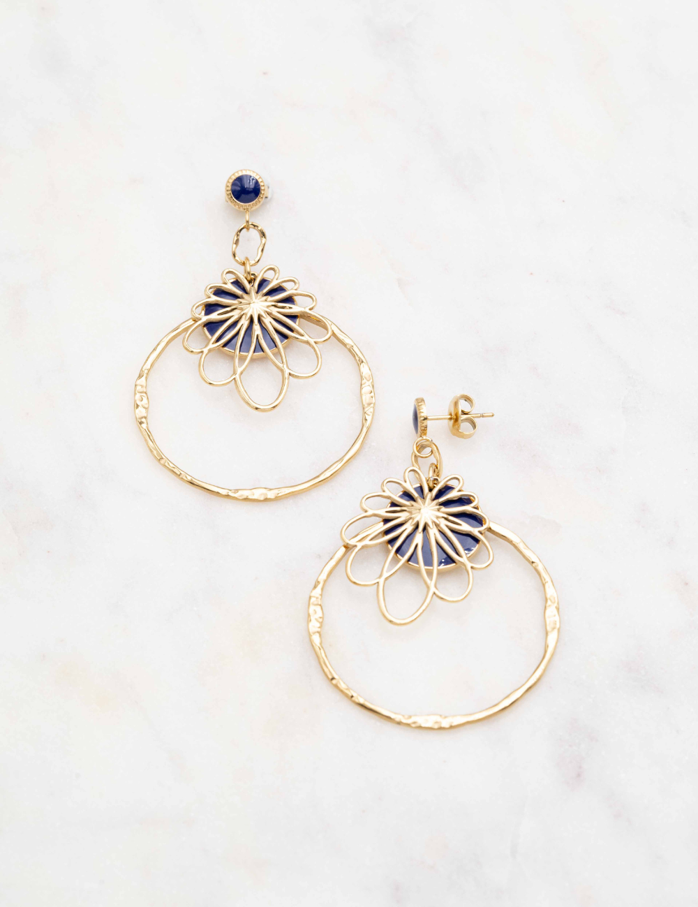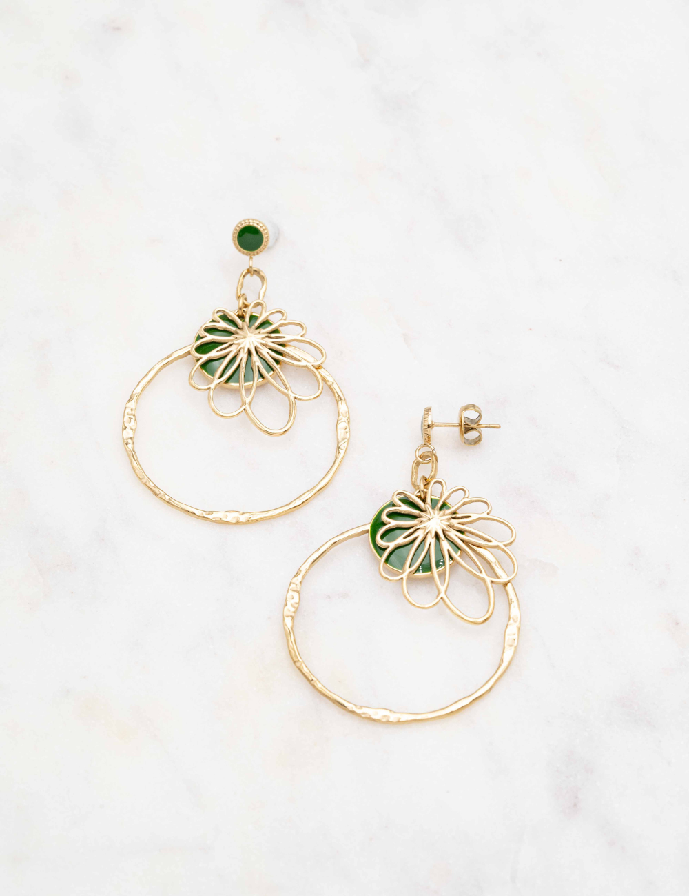 Boucles d'oreilles à puce composées d'une pièce ronde émaillée colorée et d'une pièce graphique effet floral et d'un anneau martelé.