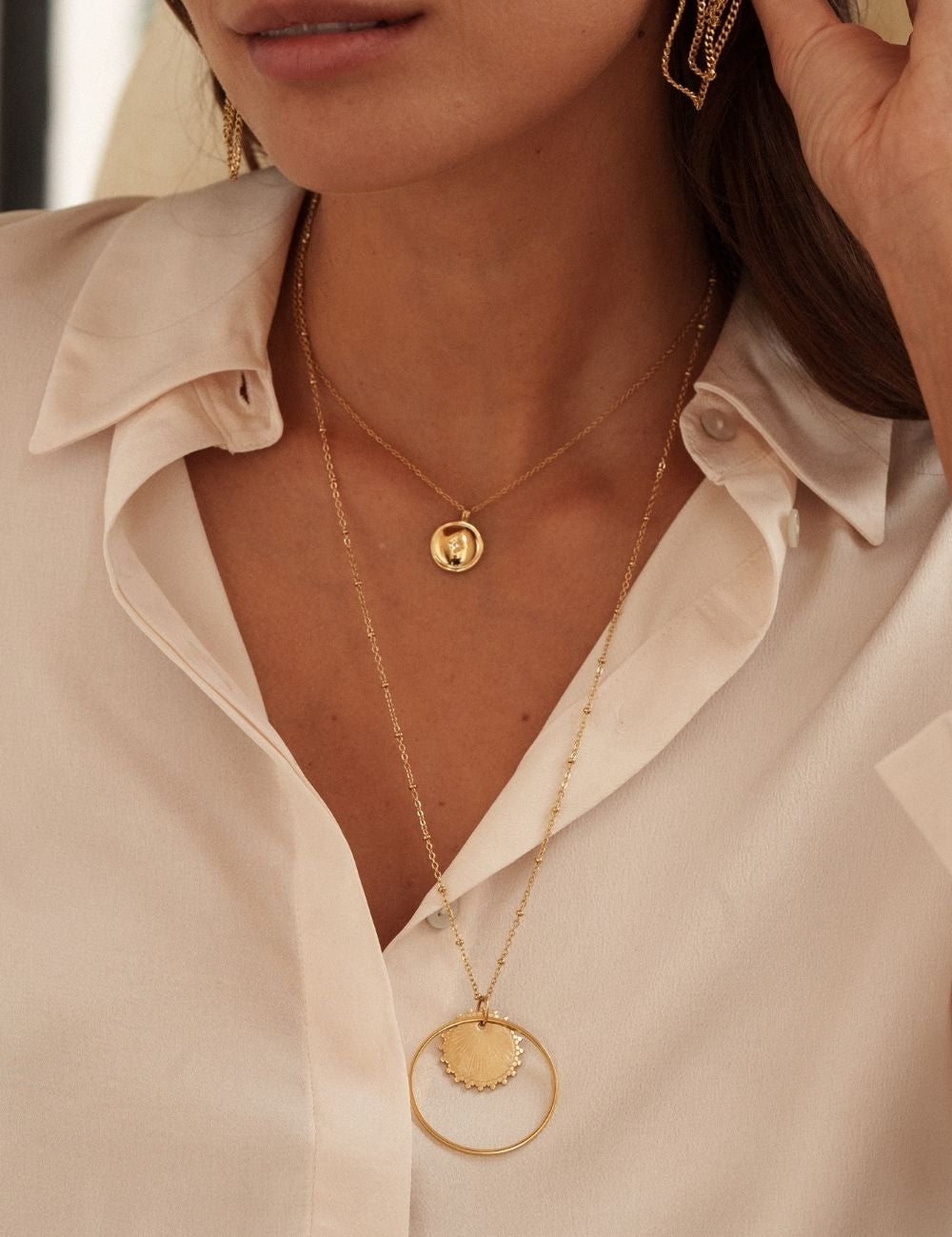 Collier réglable type sautoir composé d'un pendant graphique rond ajouré et d'un anneau.