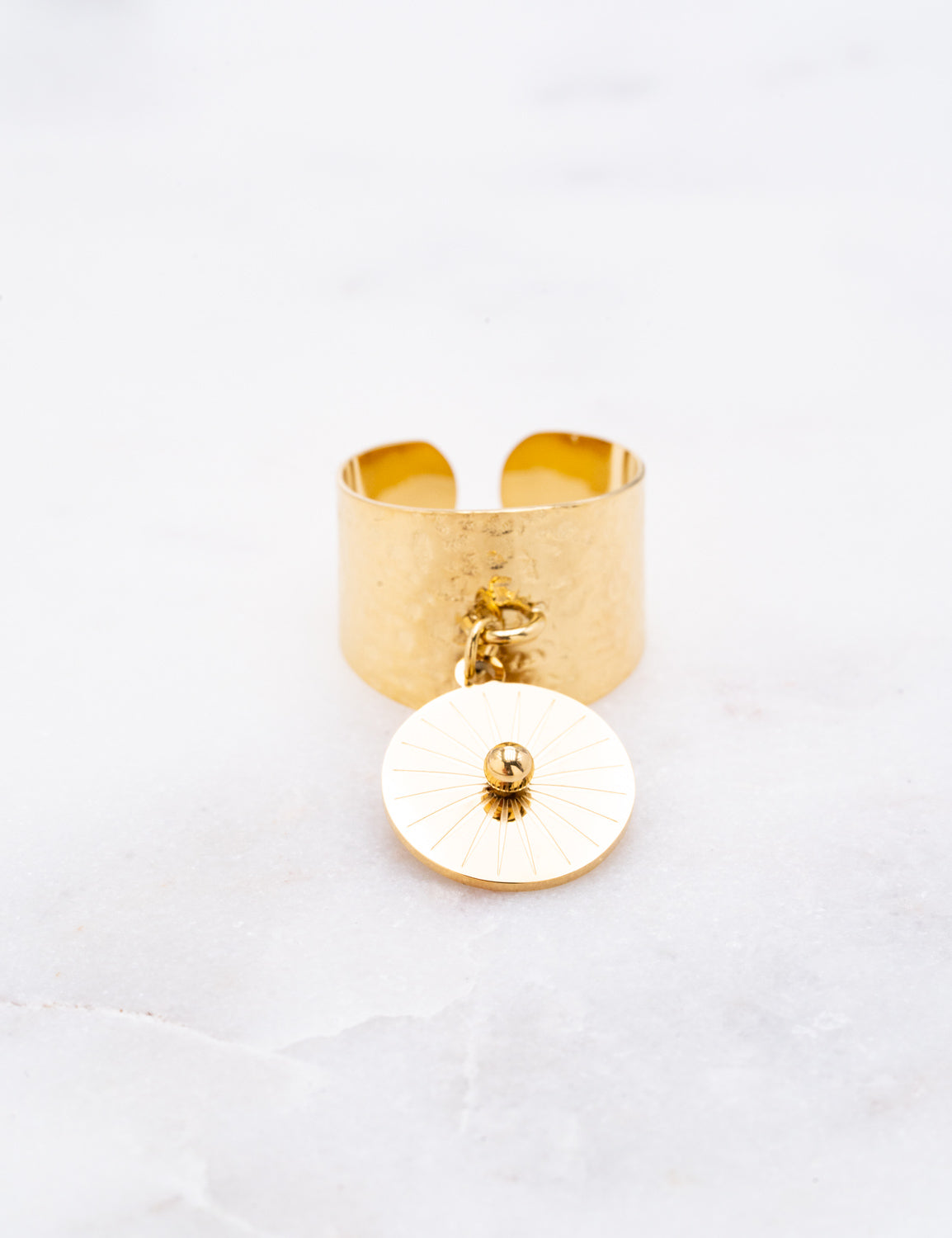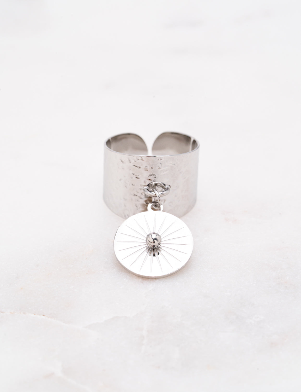 Bague ajustable martelée composée d'une pampille au motif étoilé gravé et petite boule centrale.