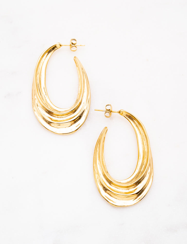 Boucles d'oreilles graphiques type créoles à puce texturées effet brossé. Fermoir papillon.