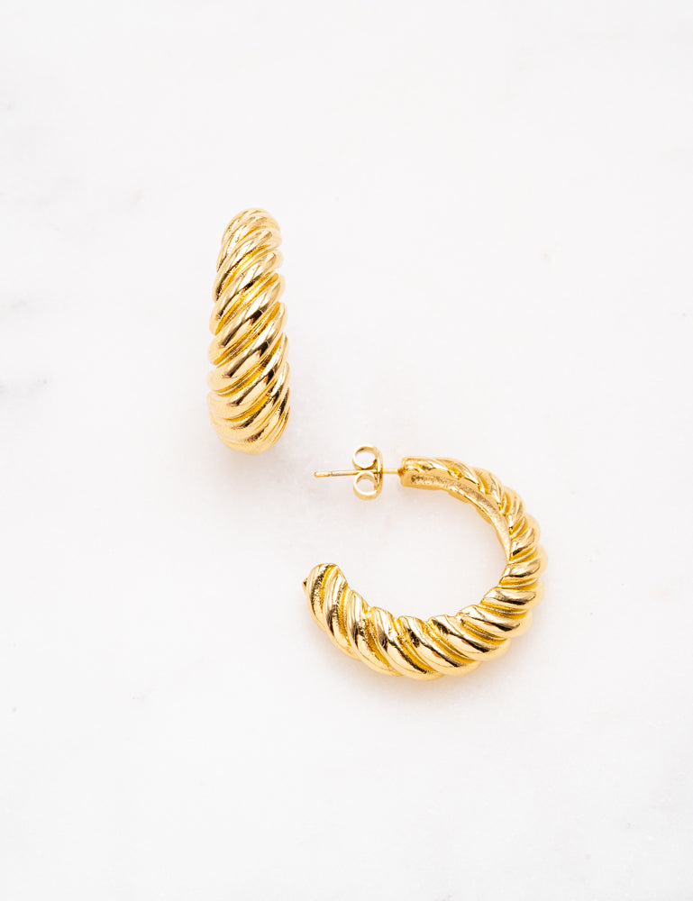 Boucles d'oreilles graphiques type créoles à puce texturées effet torsadé. Fermoir papillon.