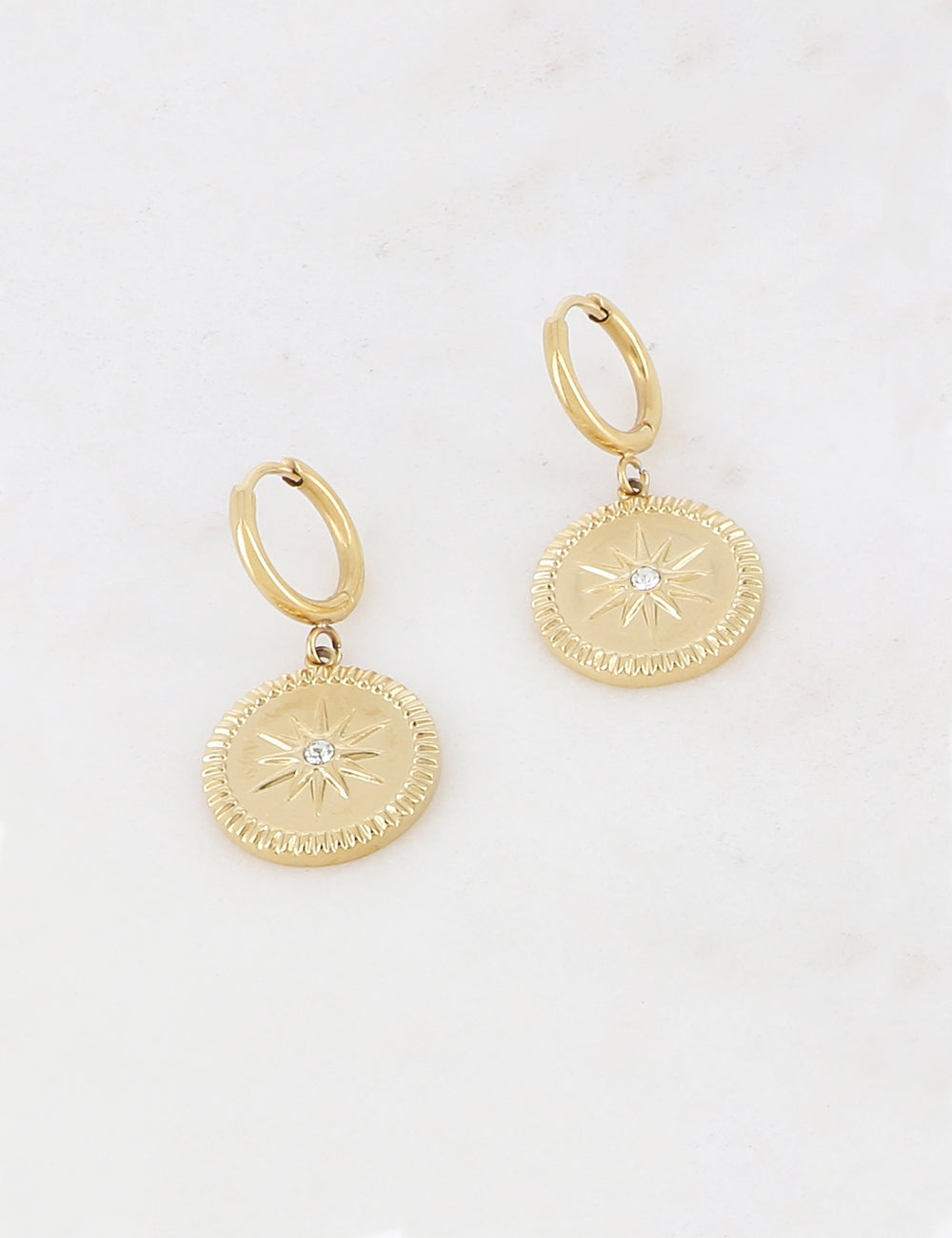 Boucles d'oreilles type créoles composées d'un pendant graphique avec un motif étoilé serti d'un strass. Fermoir charnière.