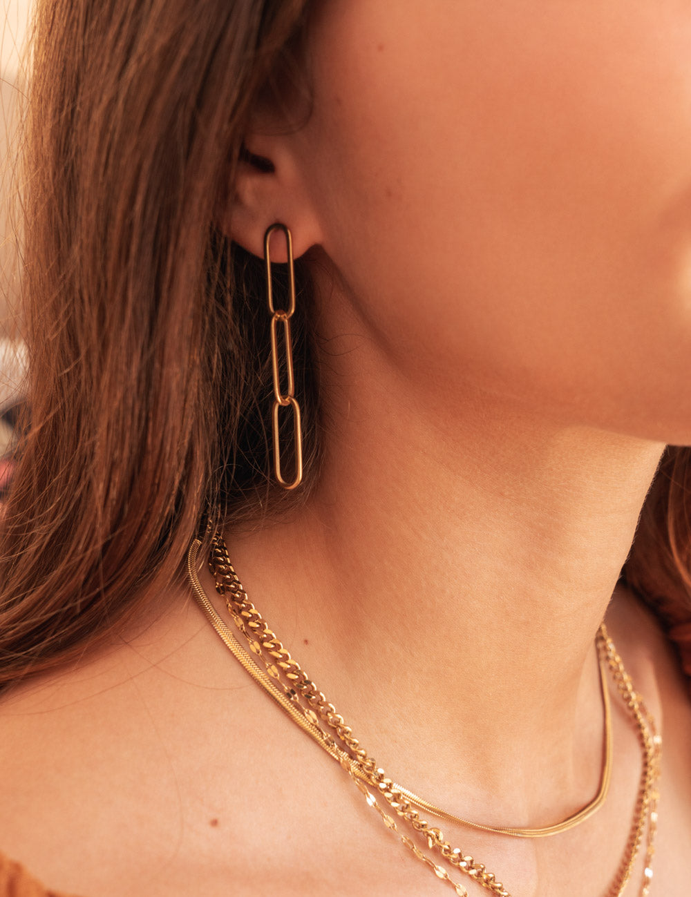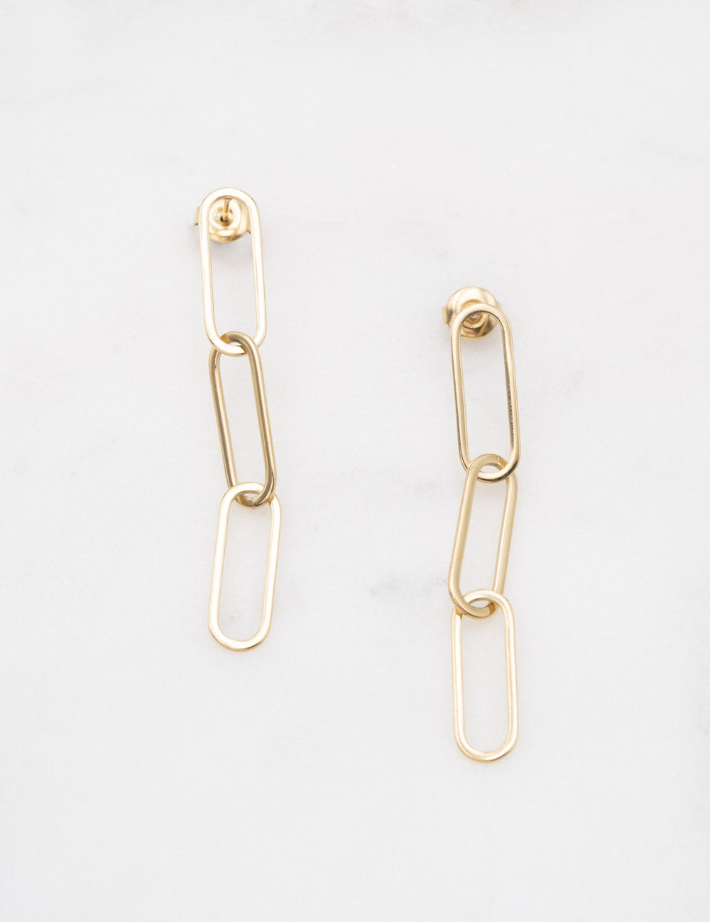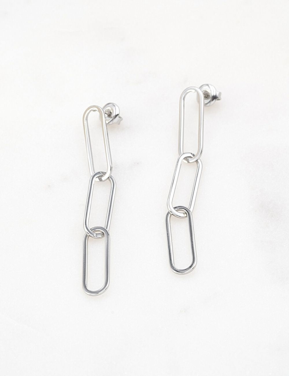 Boucles d'oreilles à puce graphiques et minimalistes avec cascade de maillons. Fermoir papillon.