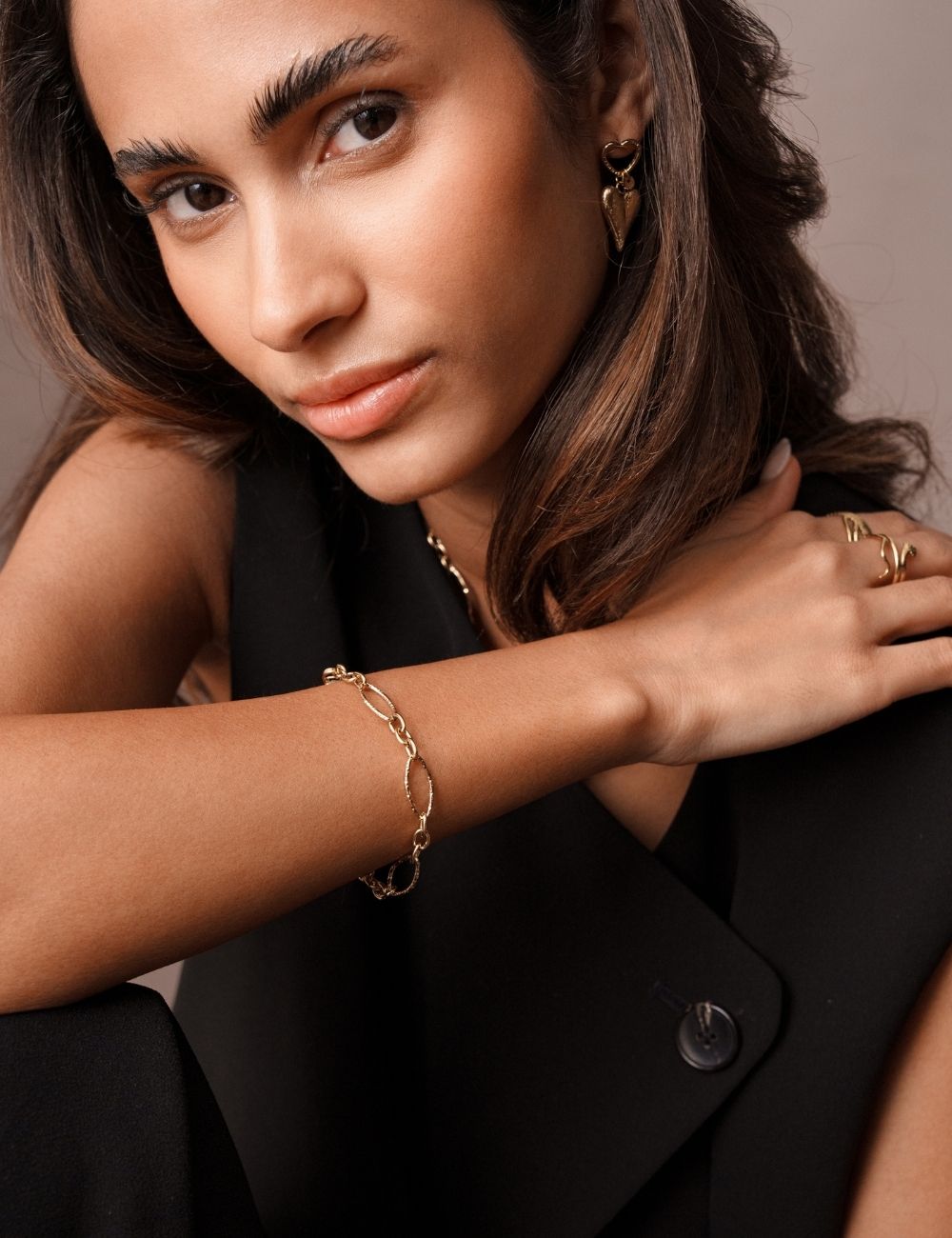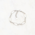 Bracelet réglable sur chaîne composé de maillons alternés ovales dentelés et texturés.