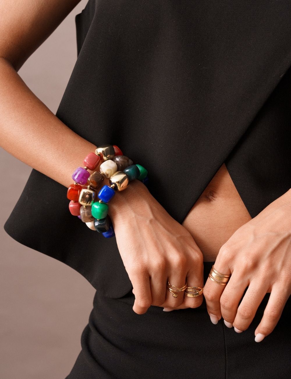 Bracelet élastique composé d'un enfilage de perles en résine acétate et d'une perle métallique.
