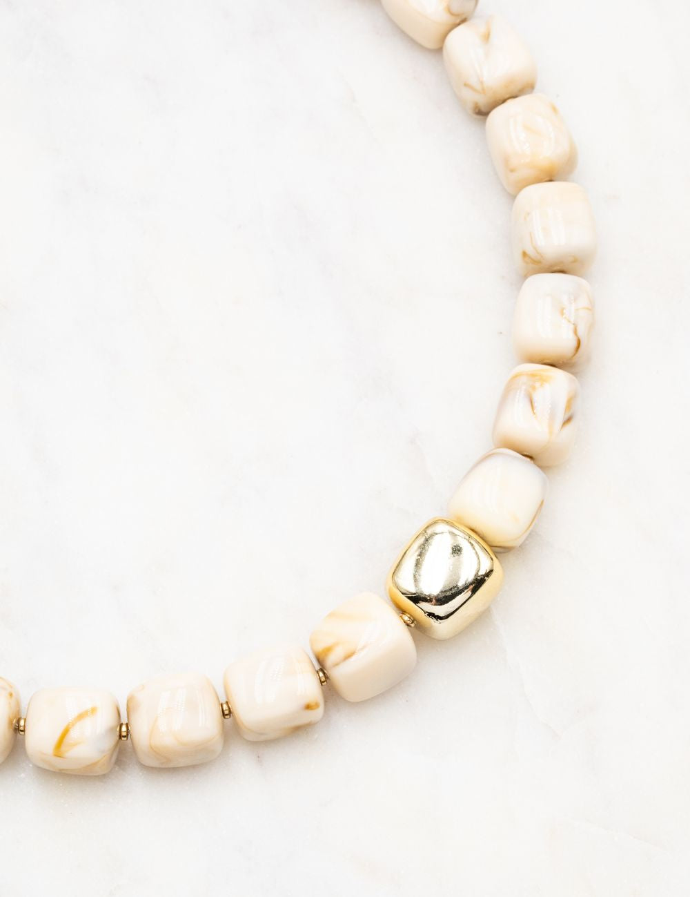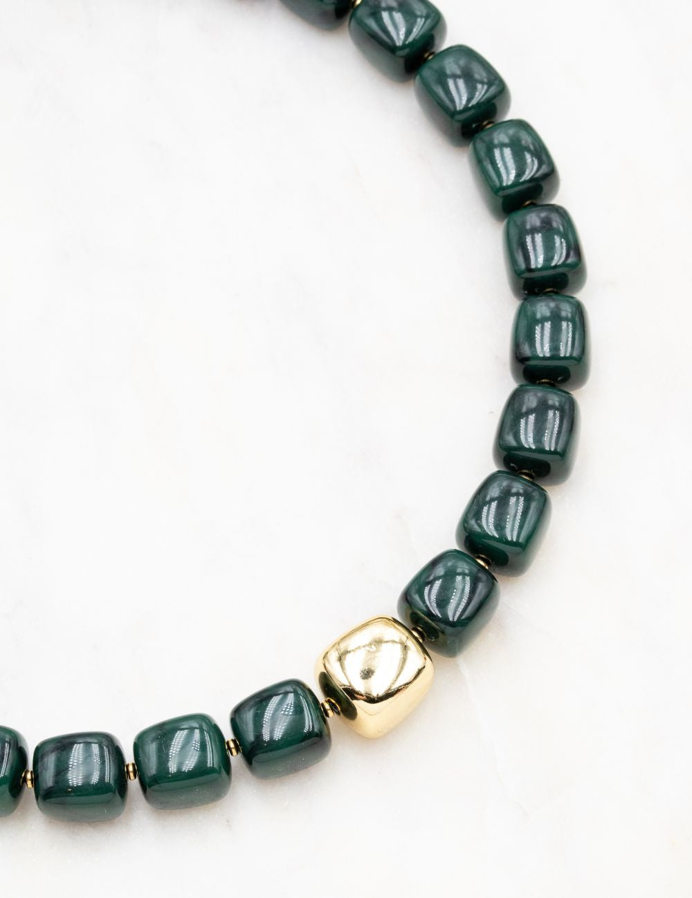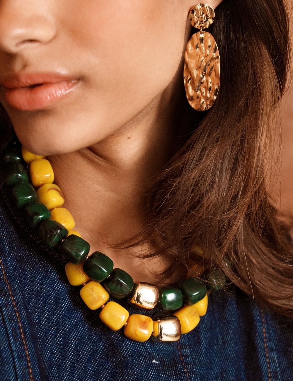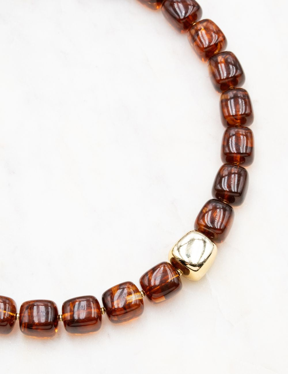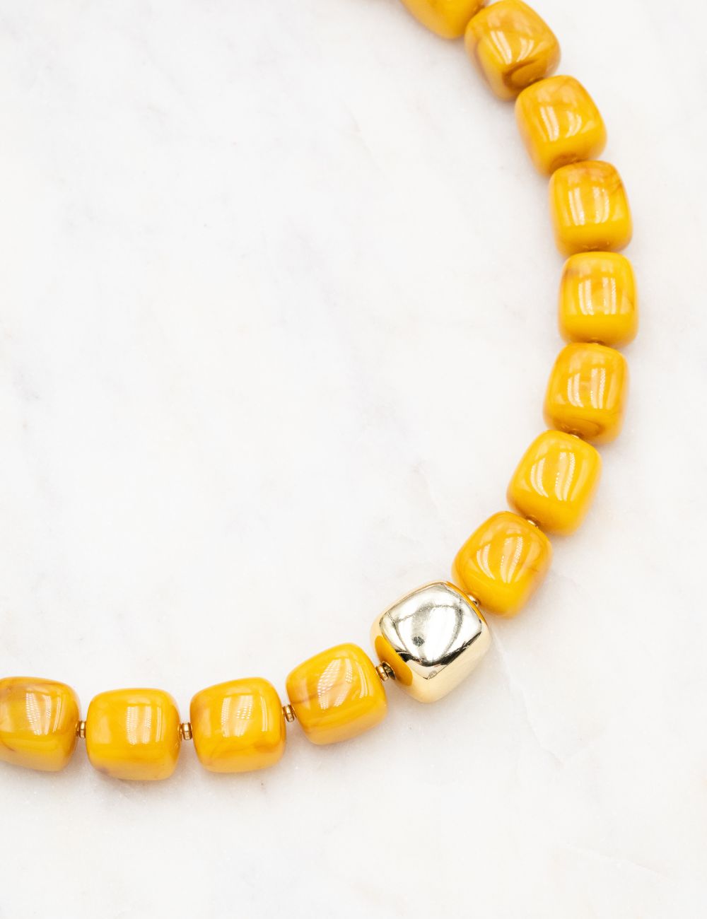 Collier sur chaîne orné de perles en résine acétate et d'une perle métallique.