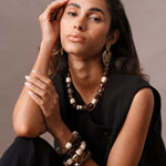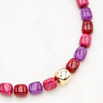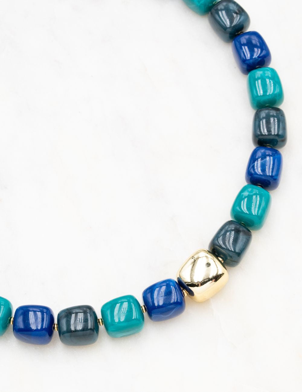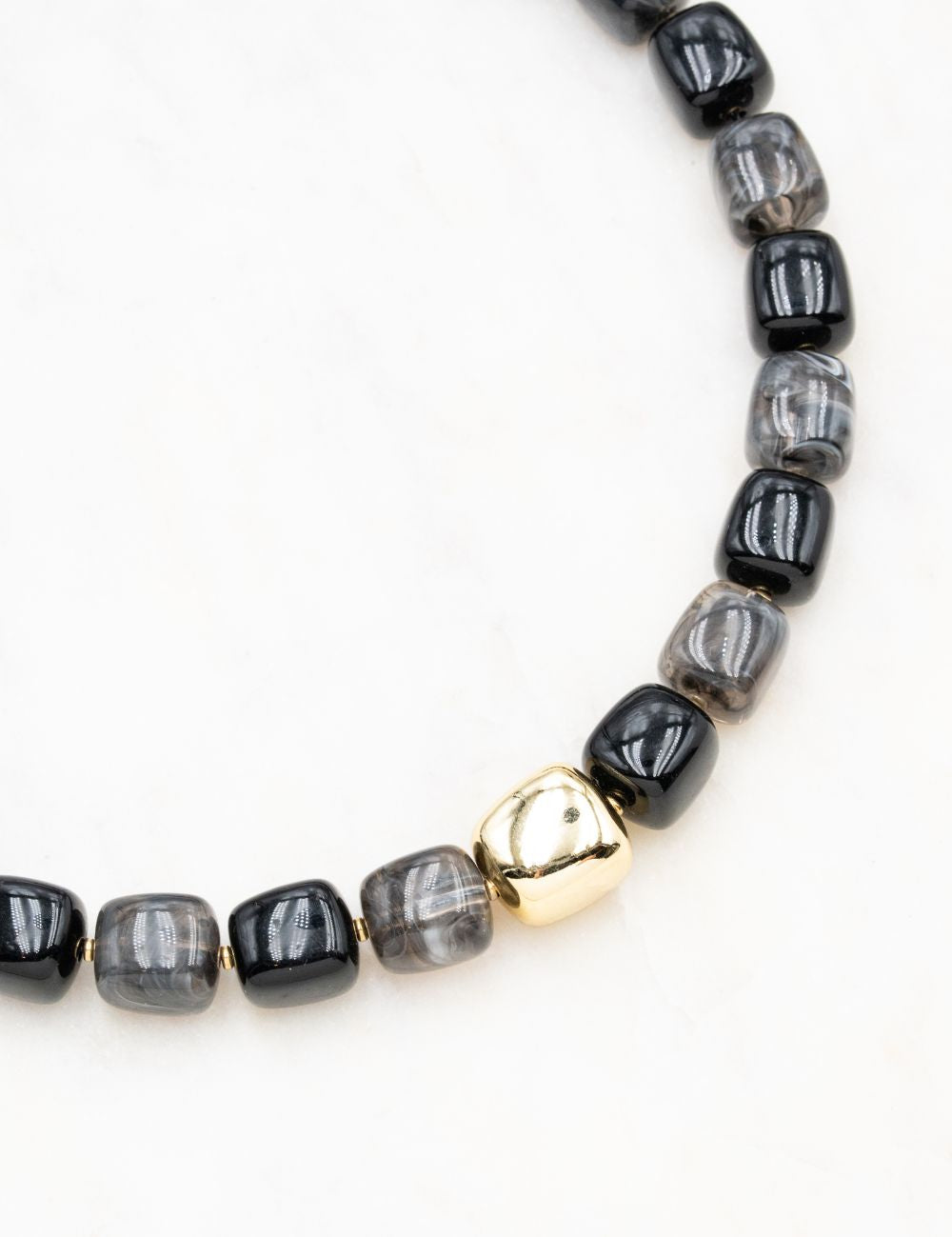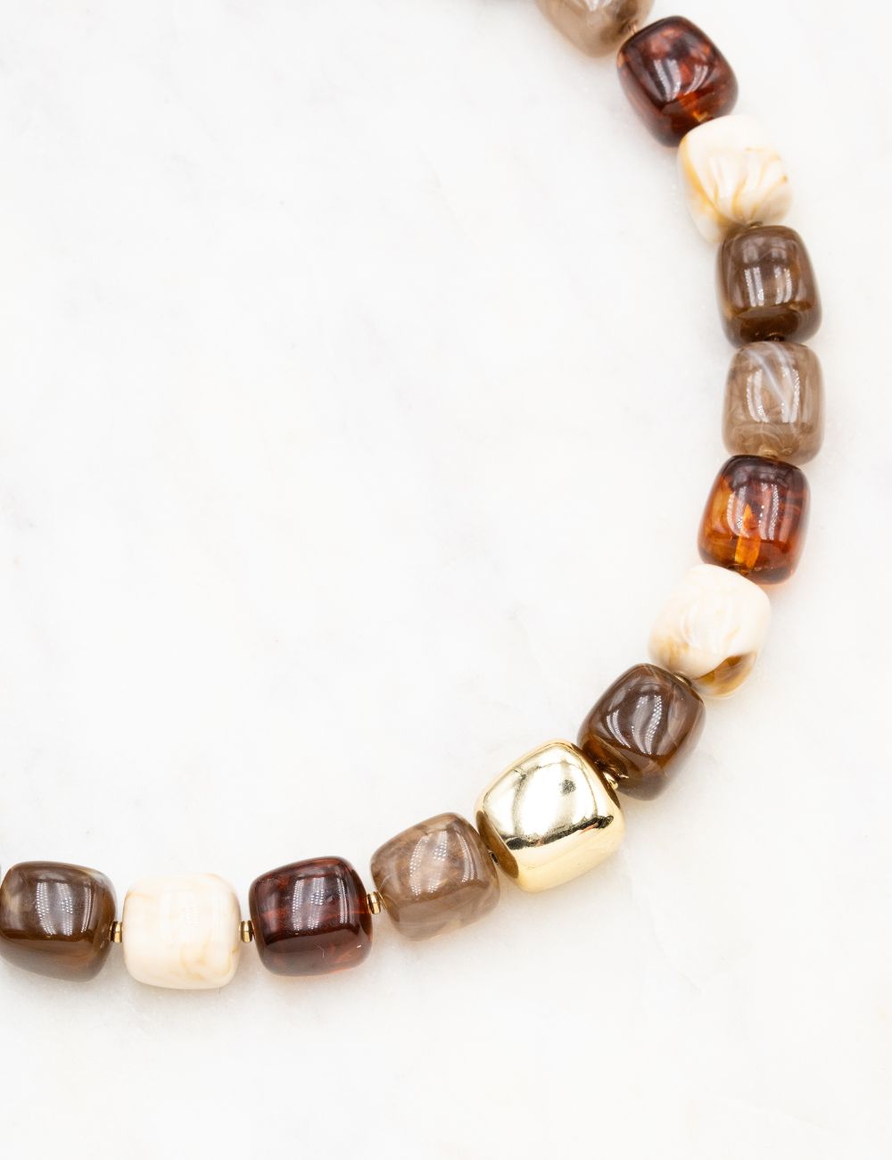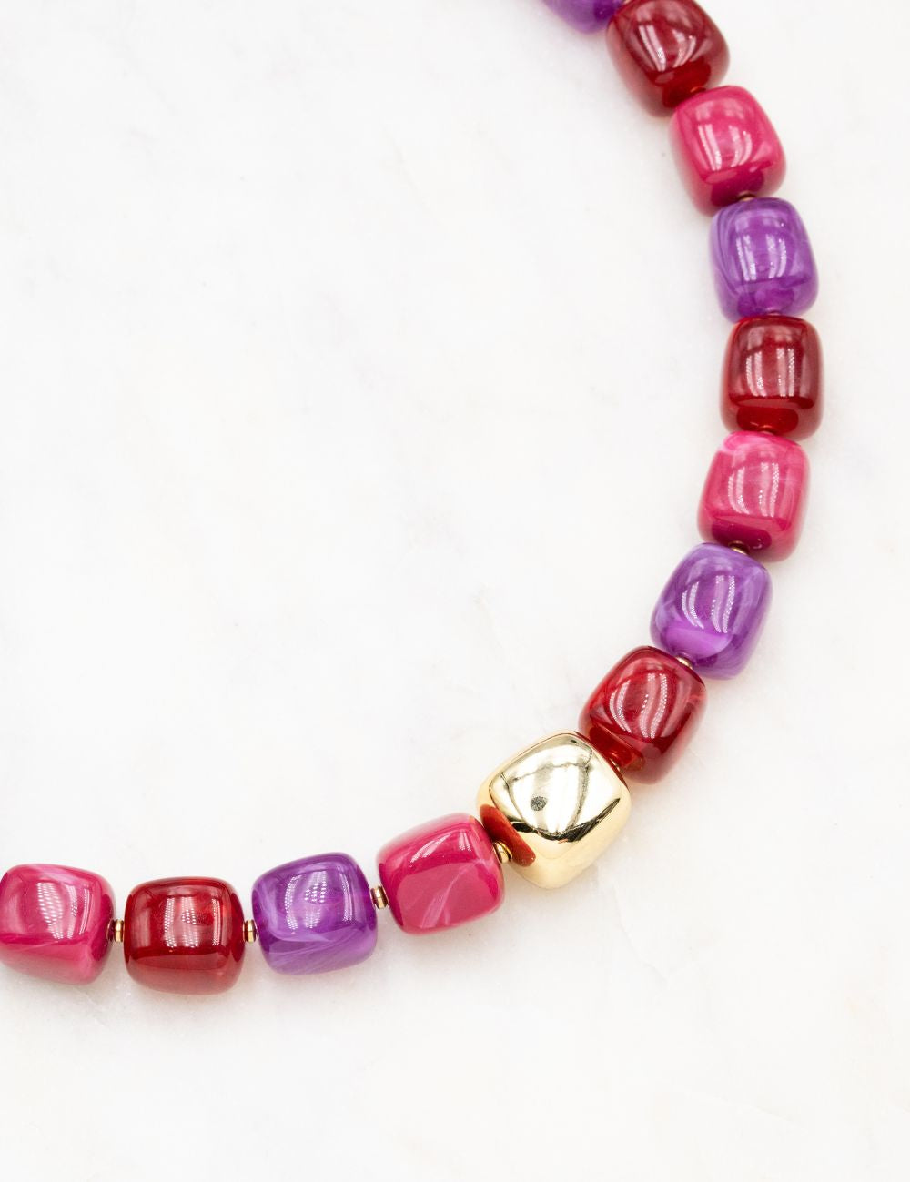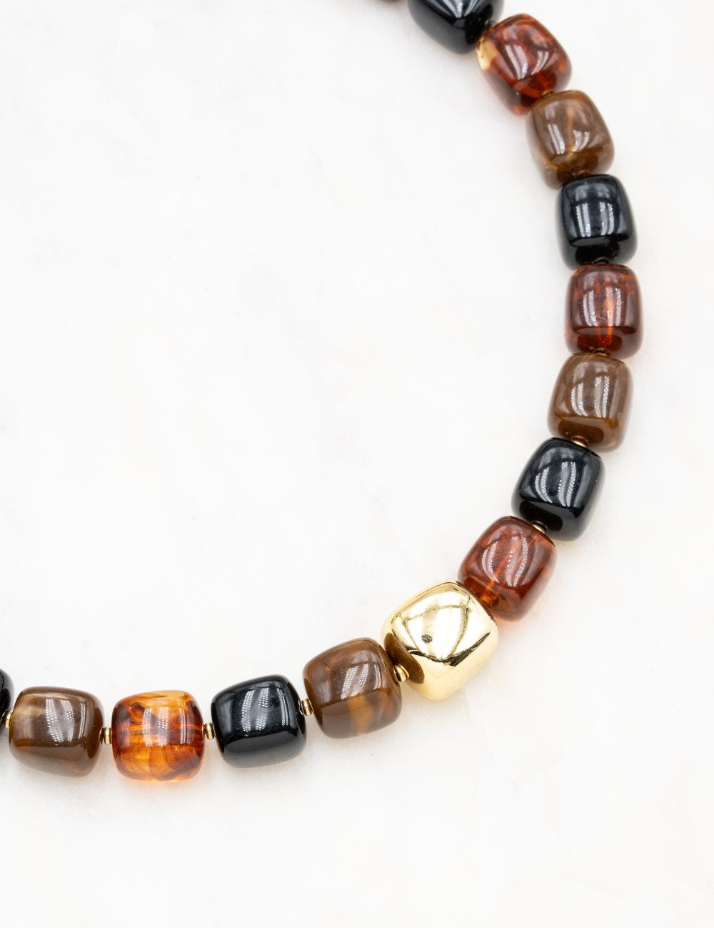 Collier sur chaîne orné de perles en résine acétate et d'une perle métallique.
