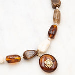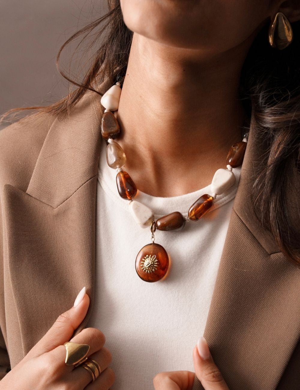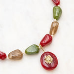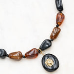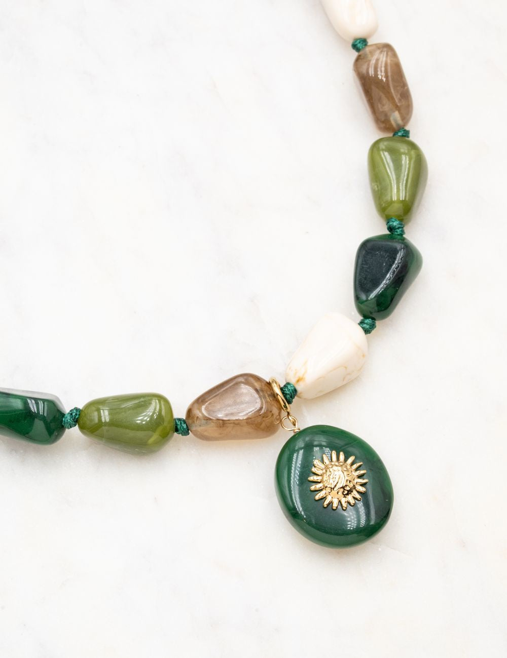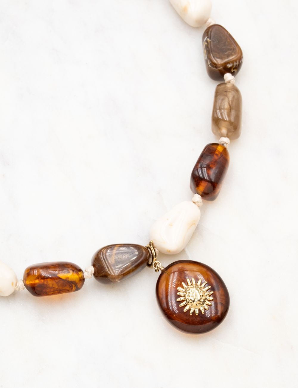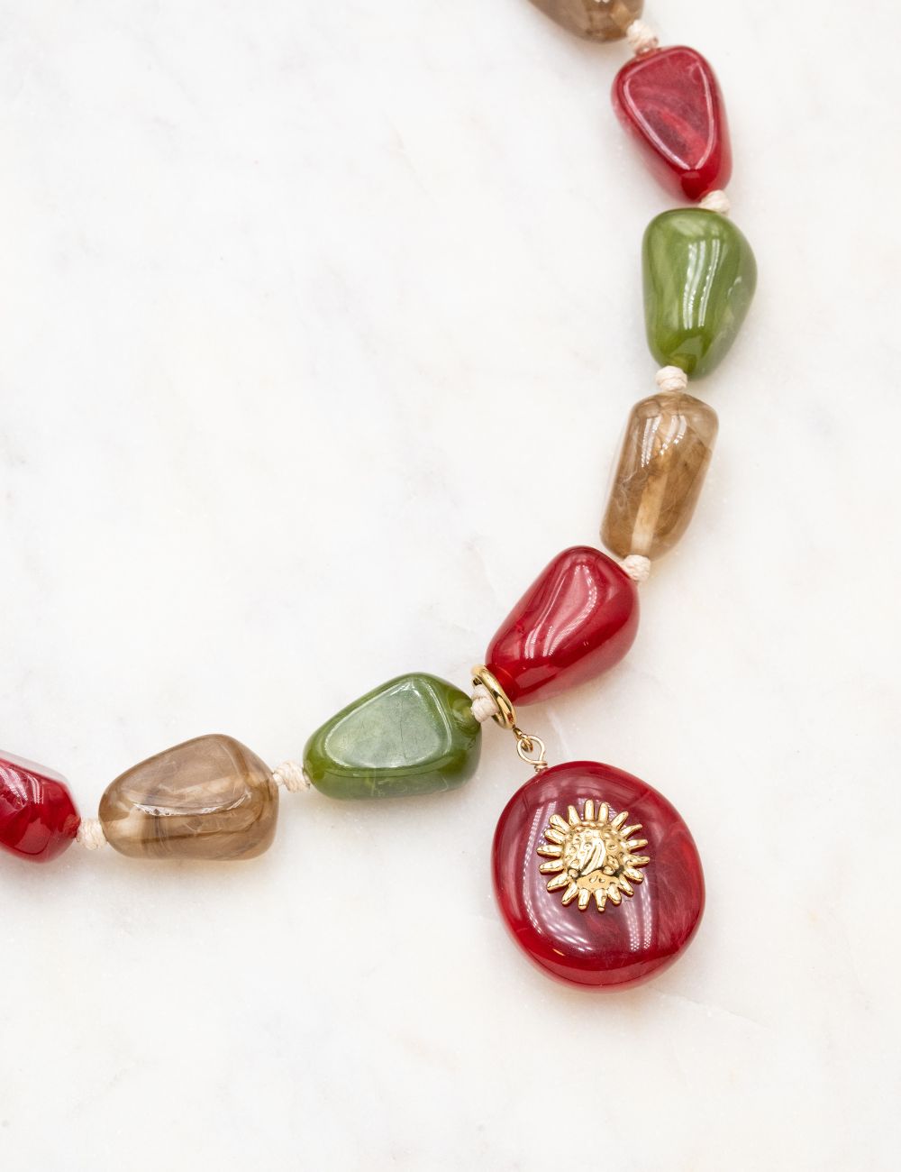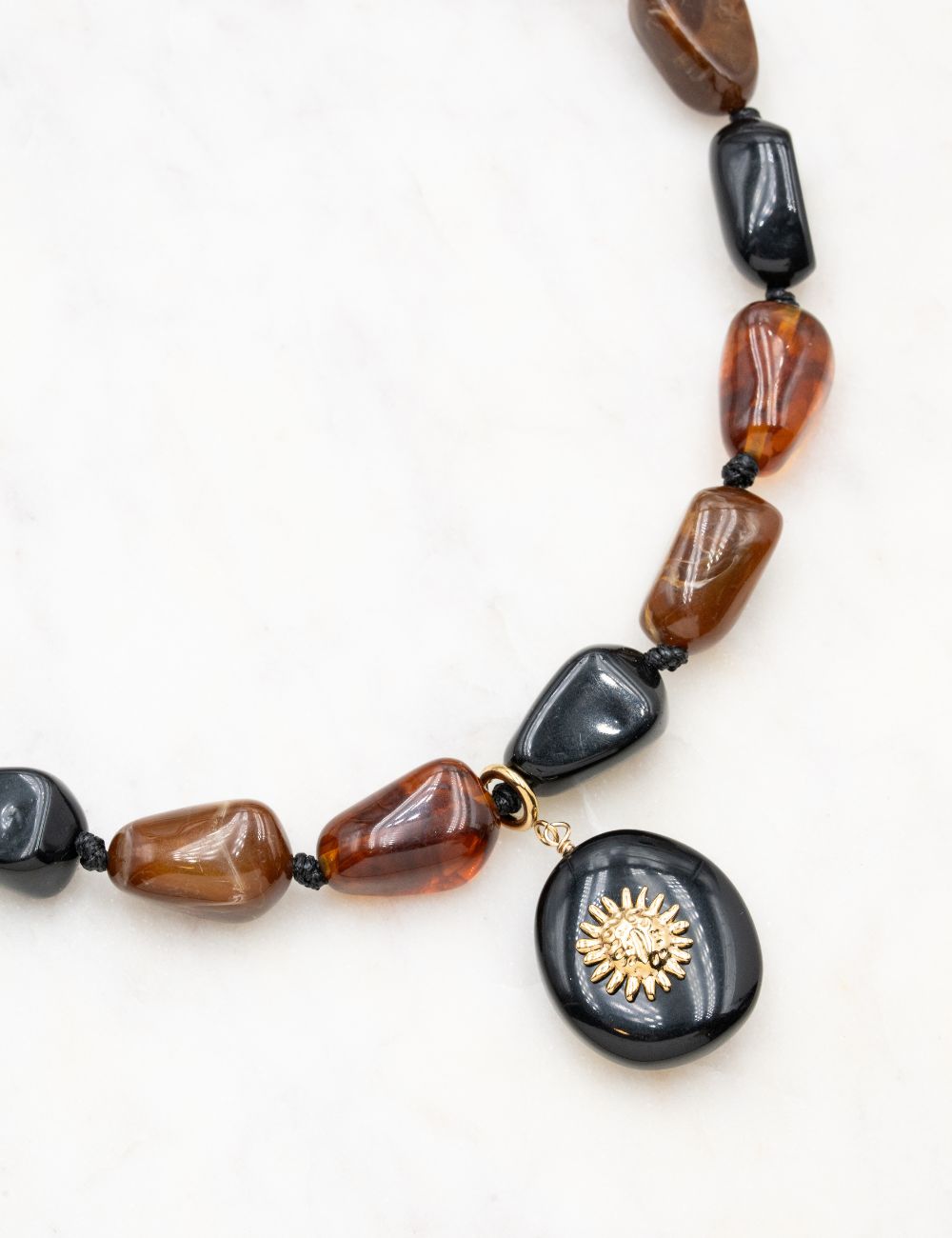 Collier sur cordon réglable composé d'un enfilage de perles en résine acétate colorée et d'un pendentif en résine orné d'un motif végétal tournesol.