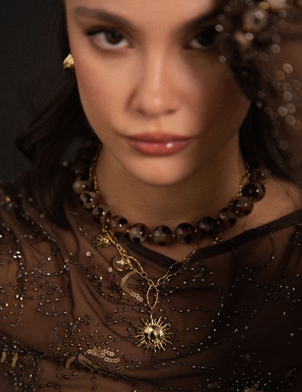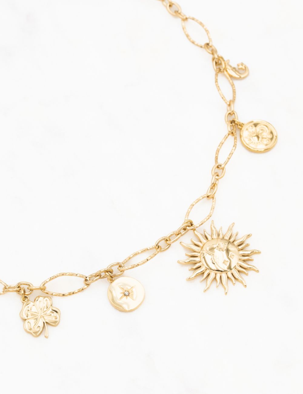 Collier réglable sur chaîne maillons (lisses et texturés) orné de plusieurs pampilles (trêfle, solaire, lune,...) .