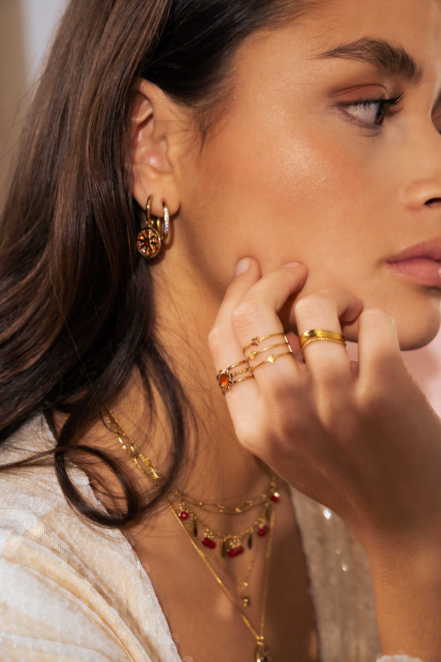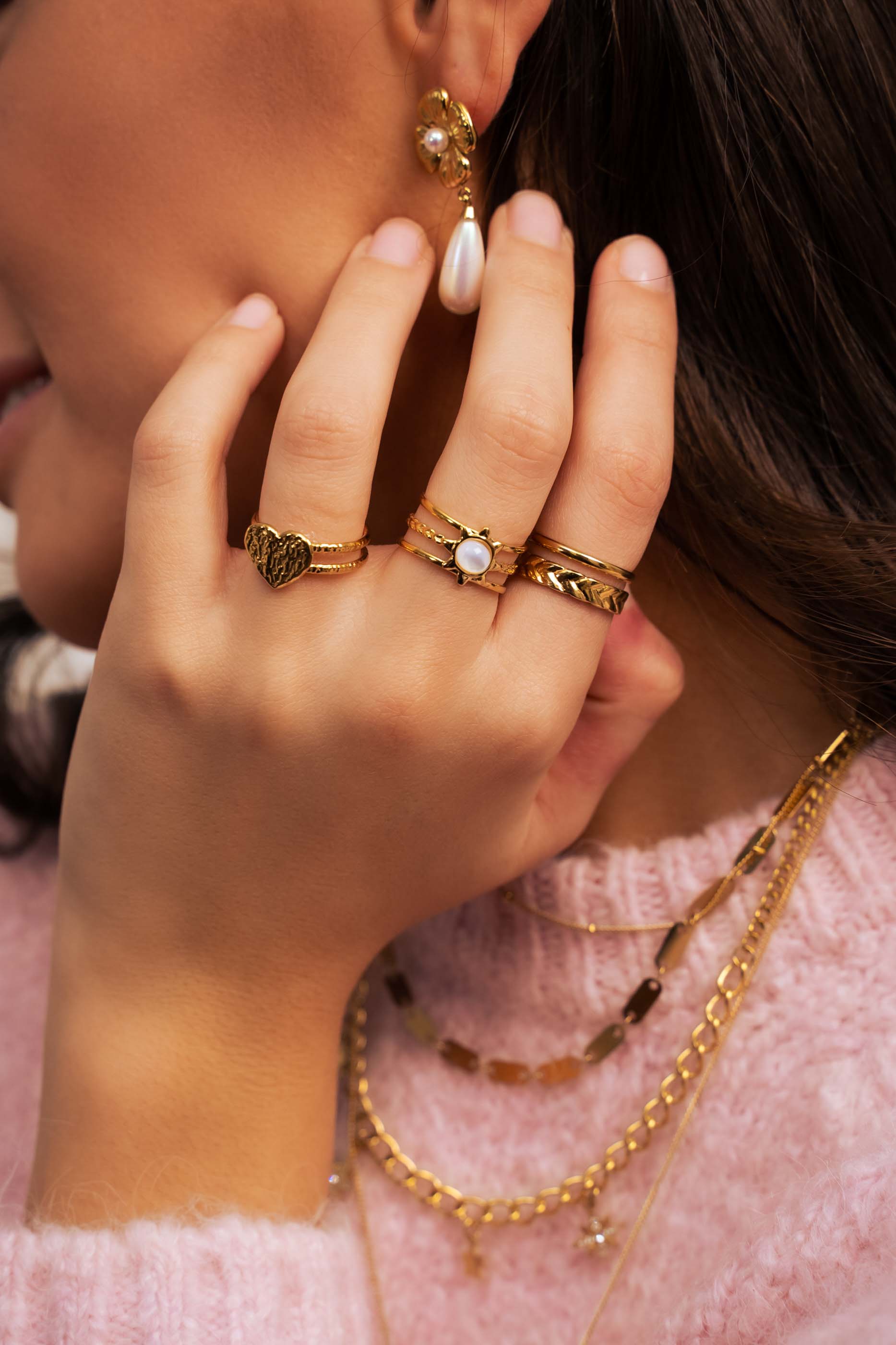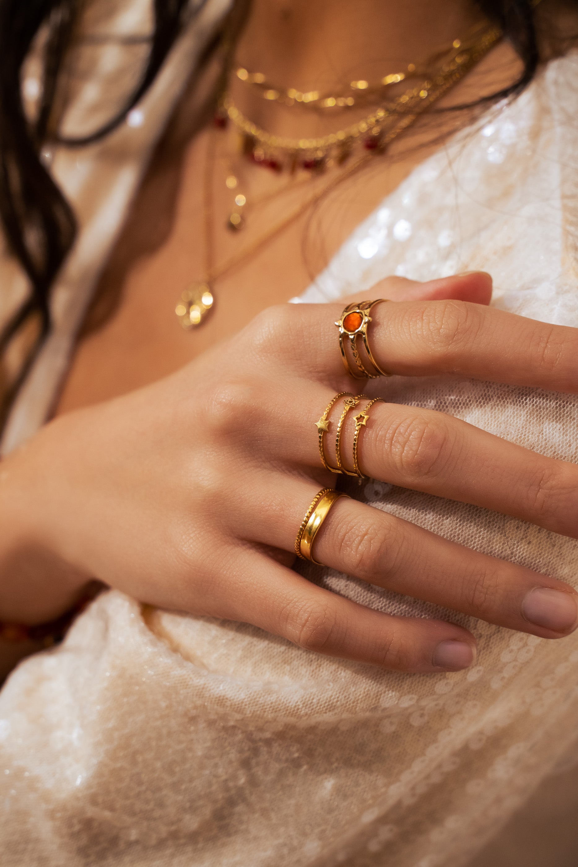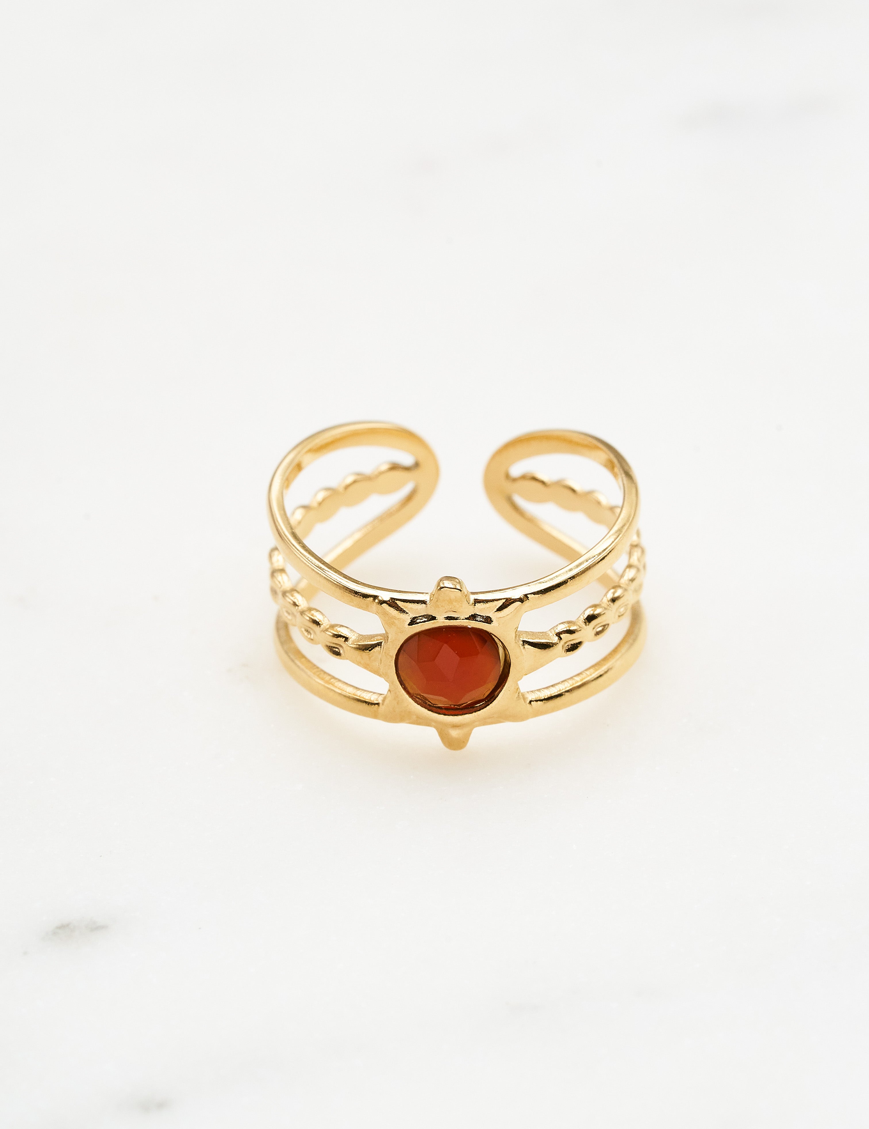 Bague ajustable multirangs composée d'une pièce au motif étoilée sertie d'une pierre naturelle .