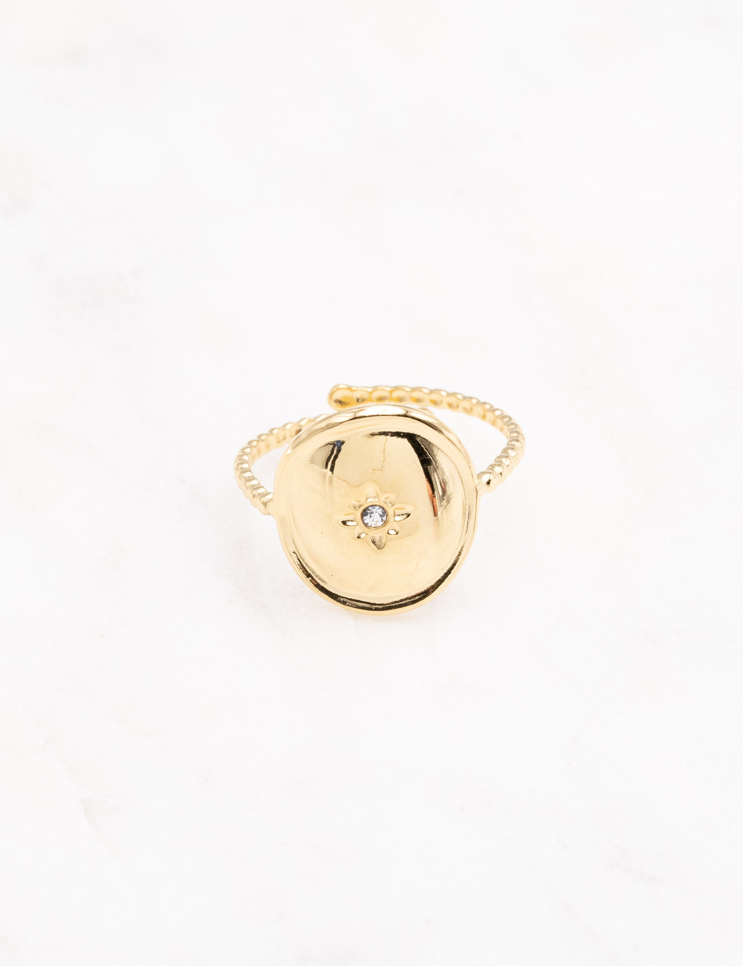 Bague fine ajustable avec une pièce ronde au motif étoile ornée d'un strass zirconium.