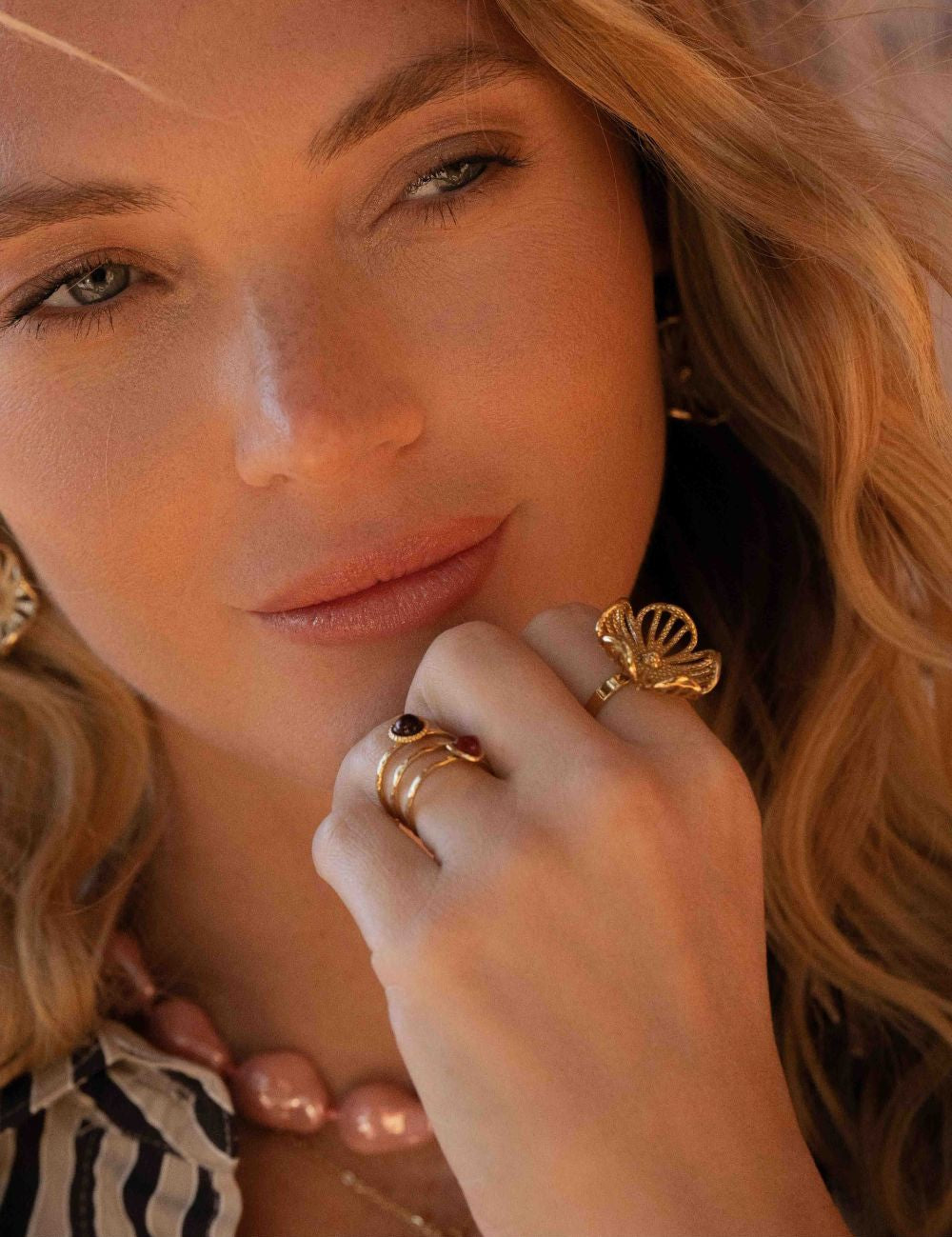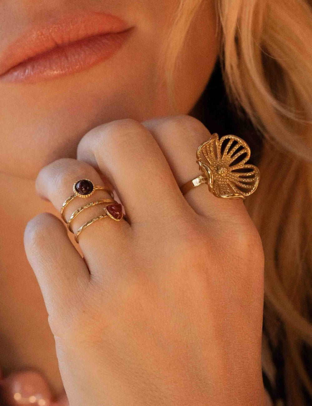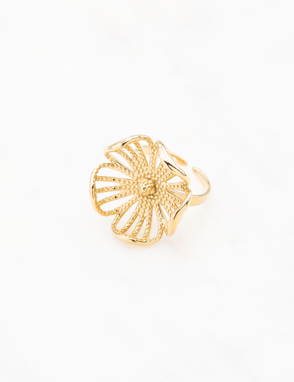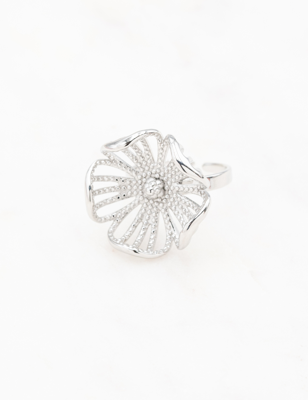 Bague ajustable composée d'une pièce formant une fleur ajourée et texturée.