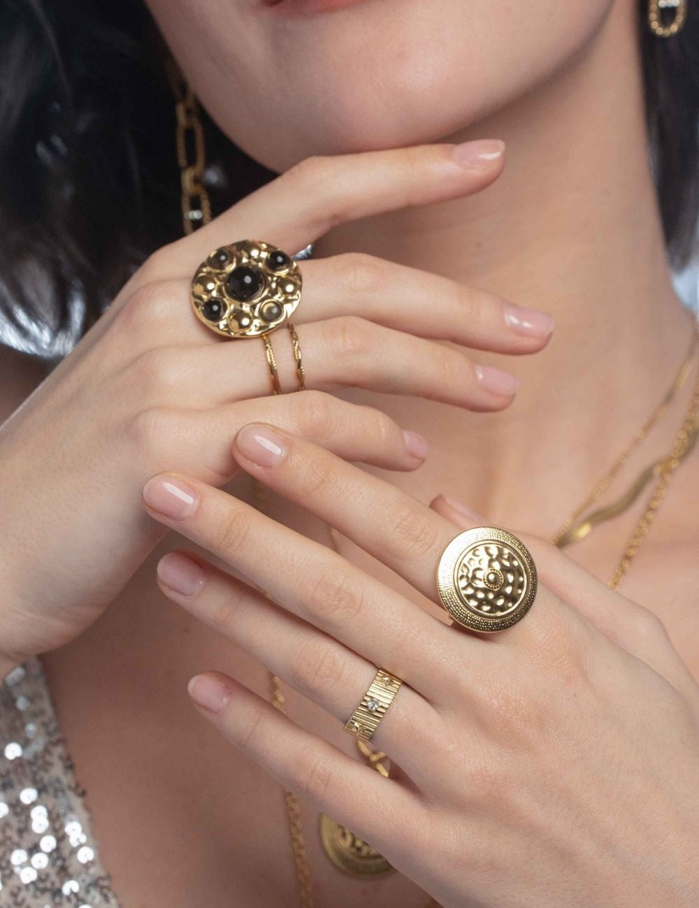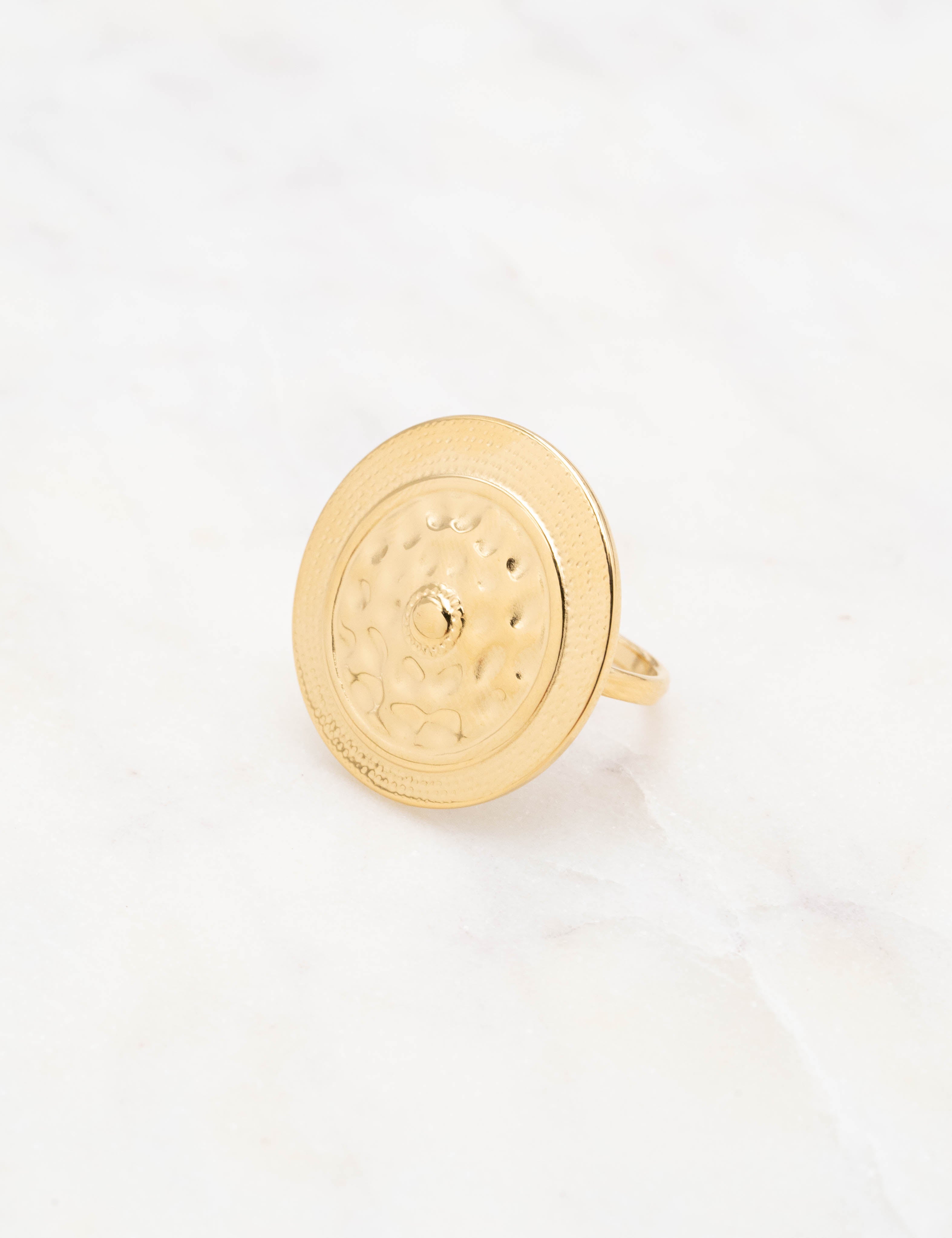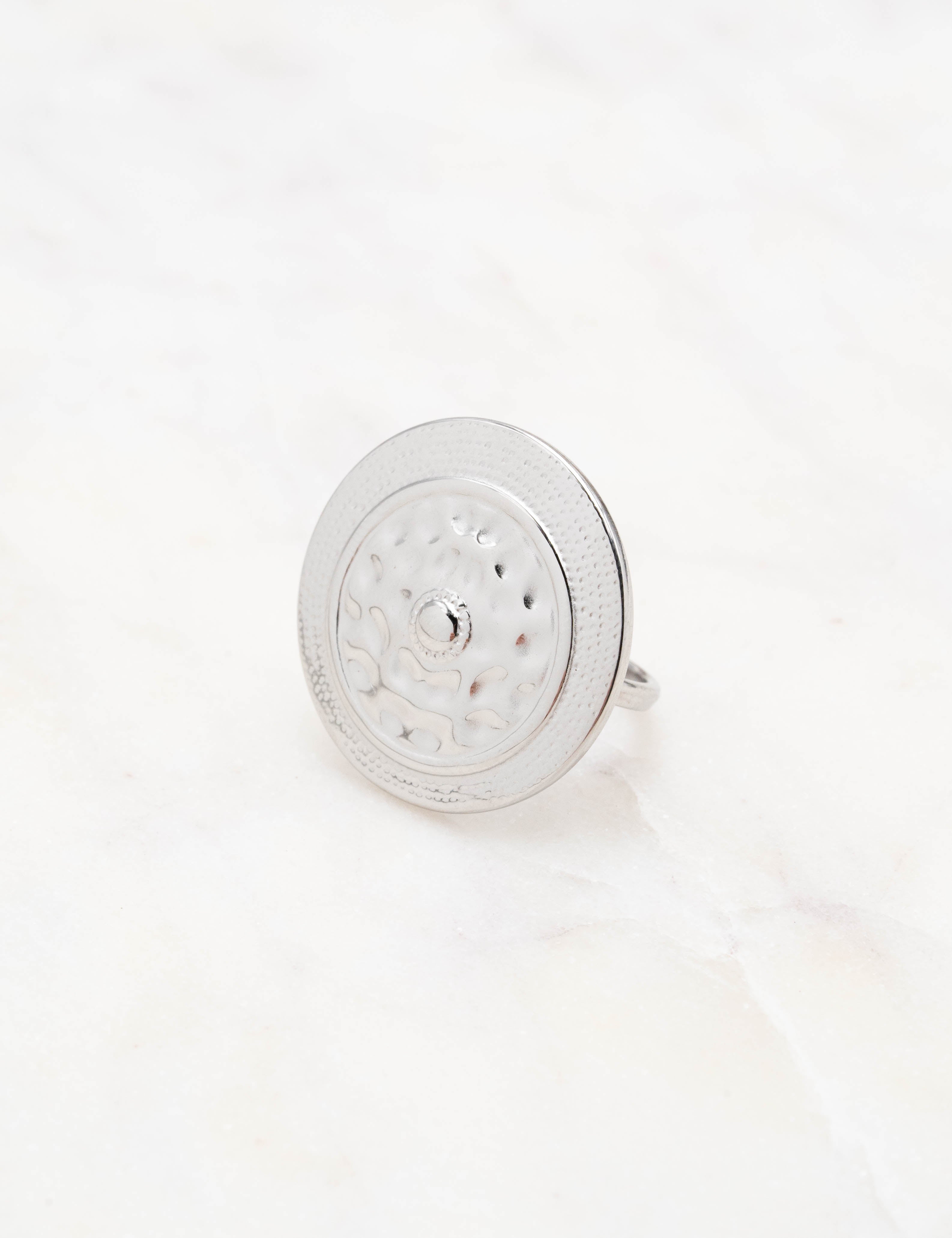 Bague ajustable composée d'une pièce ronde martelée.
