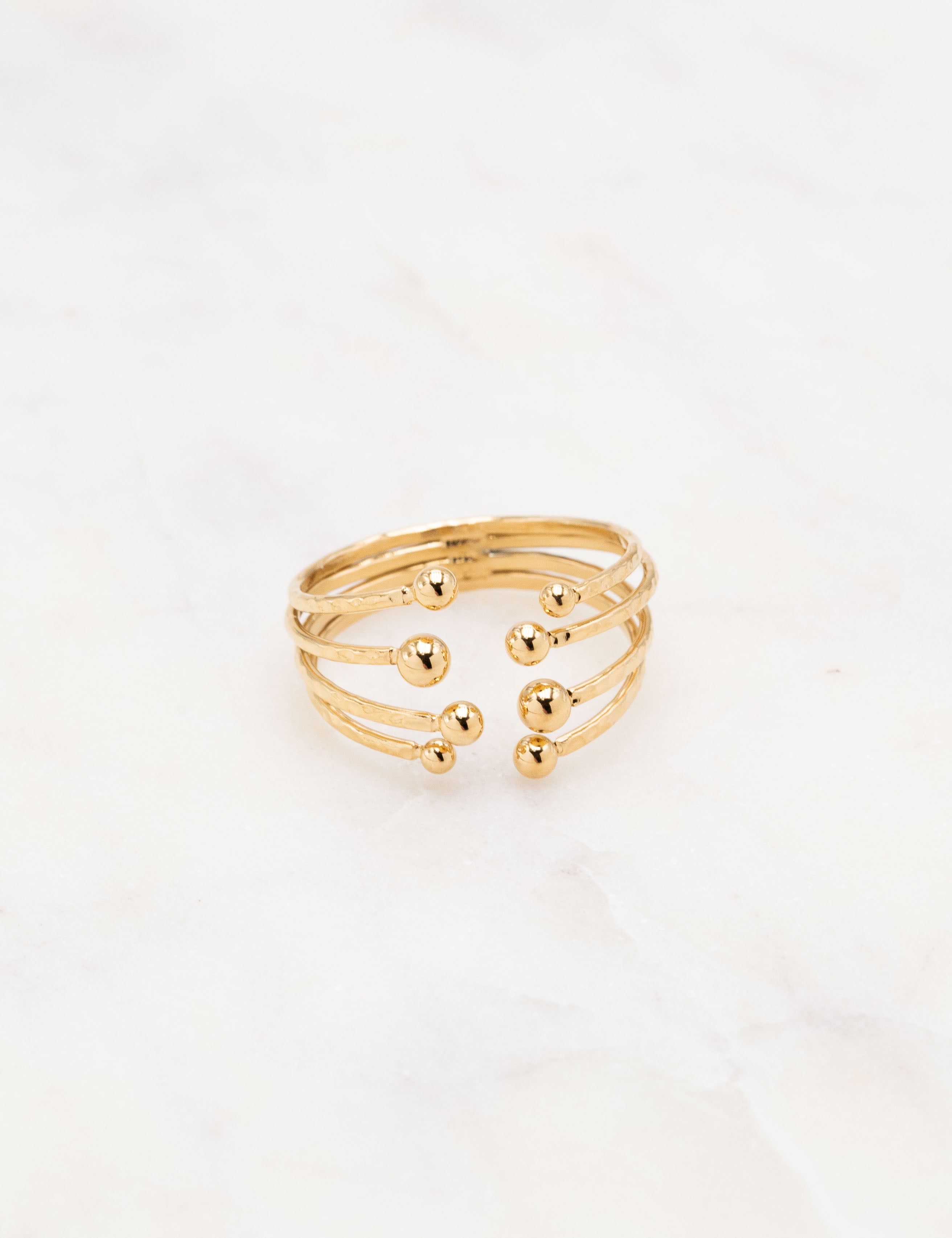 Bague graphique ajustable, ouverte par le devant composée de quatre rangs texturés avec une finition géométrique (boule).