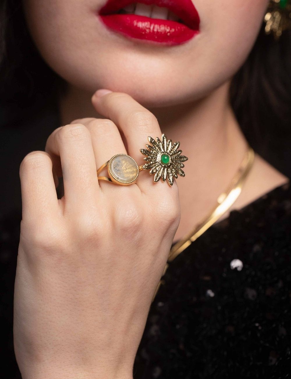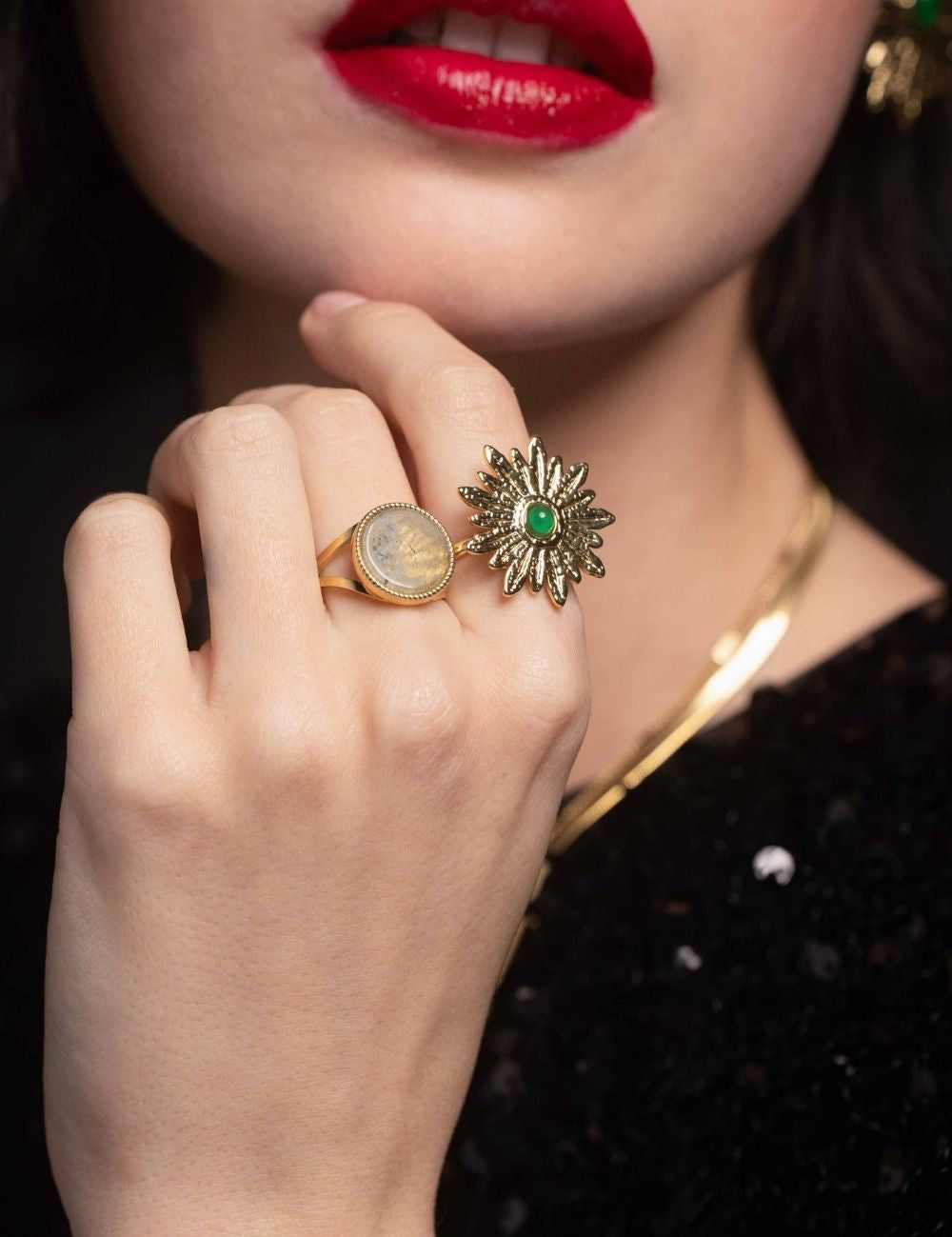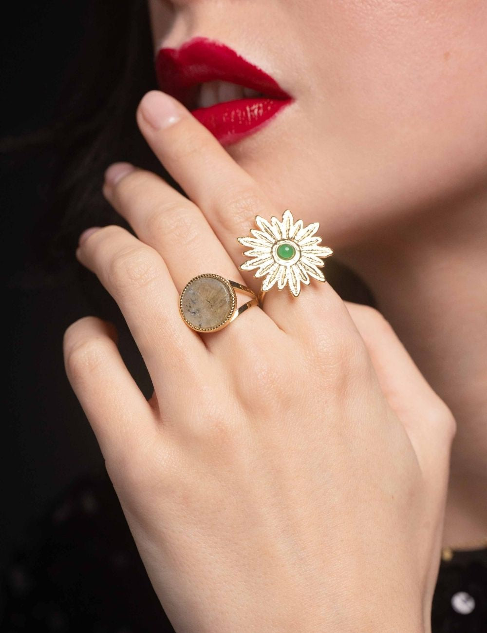Bague ajustable graphique composée d'une pièce au motif floral texturé et ornée d'une pierre naturelle.