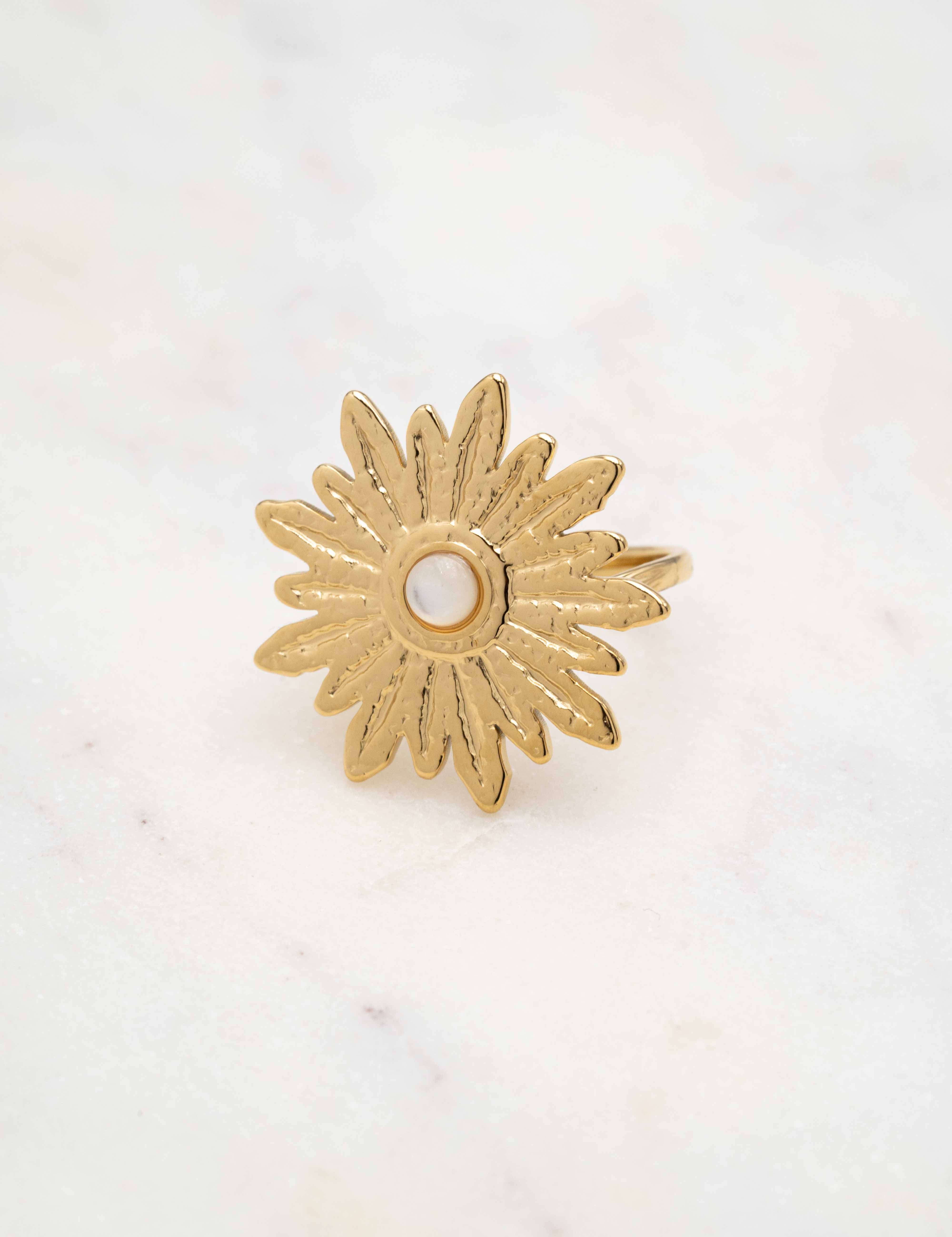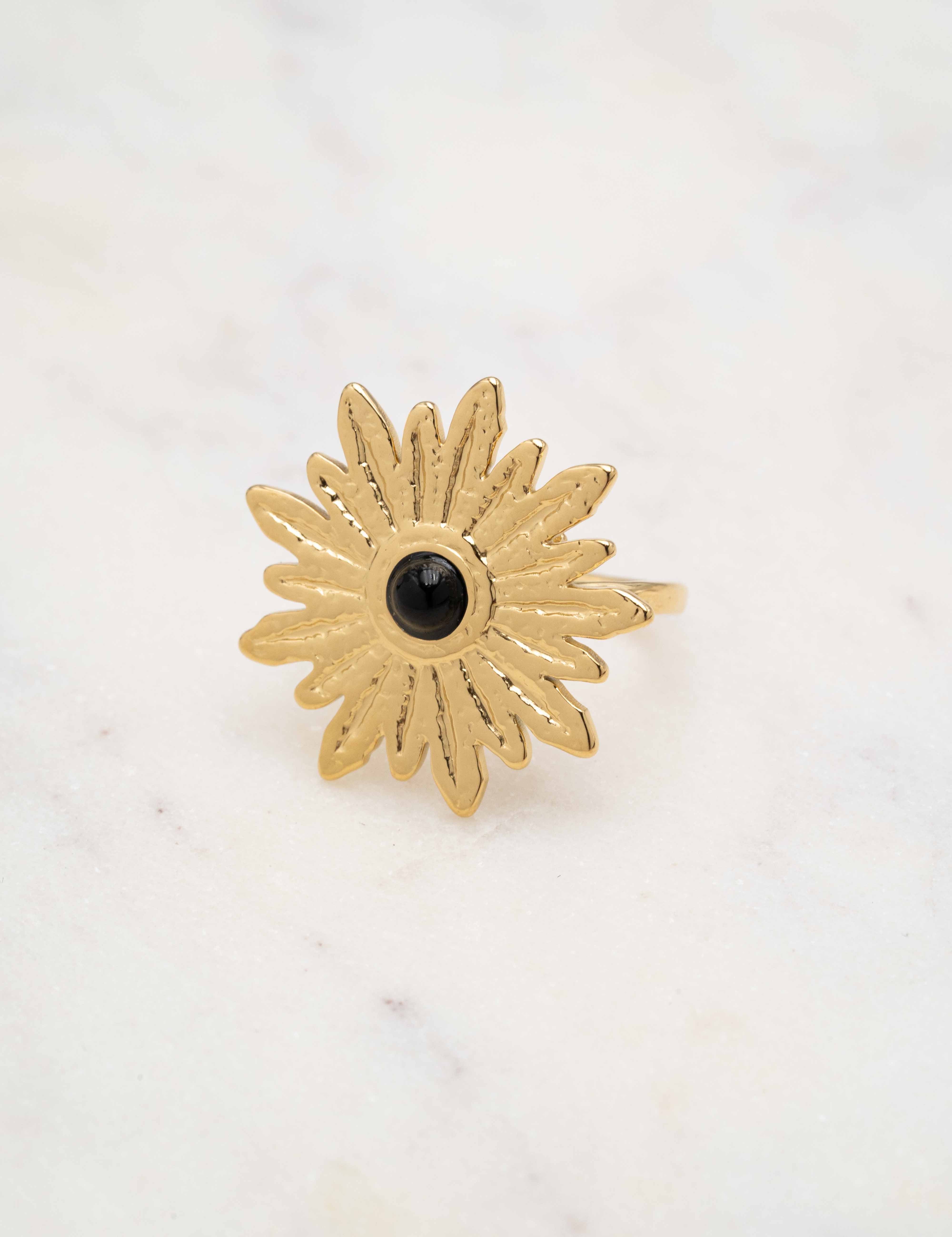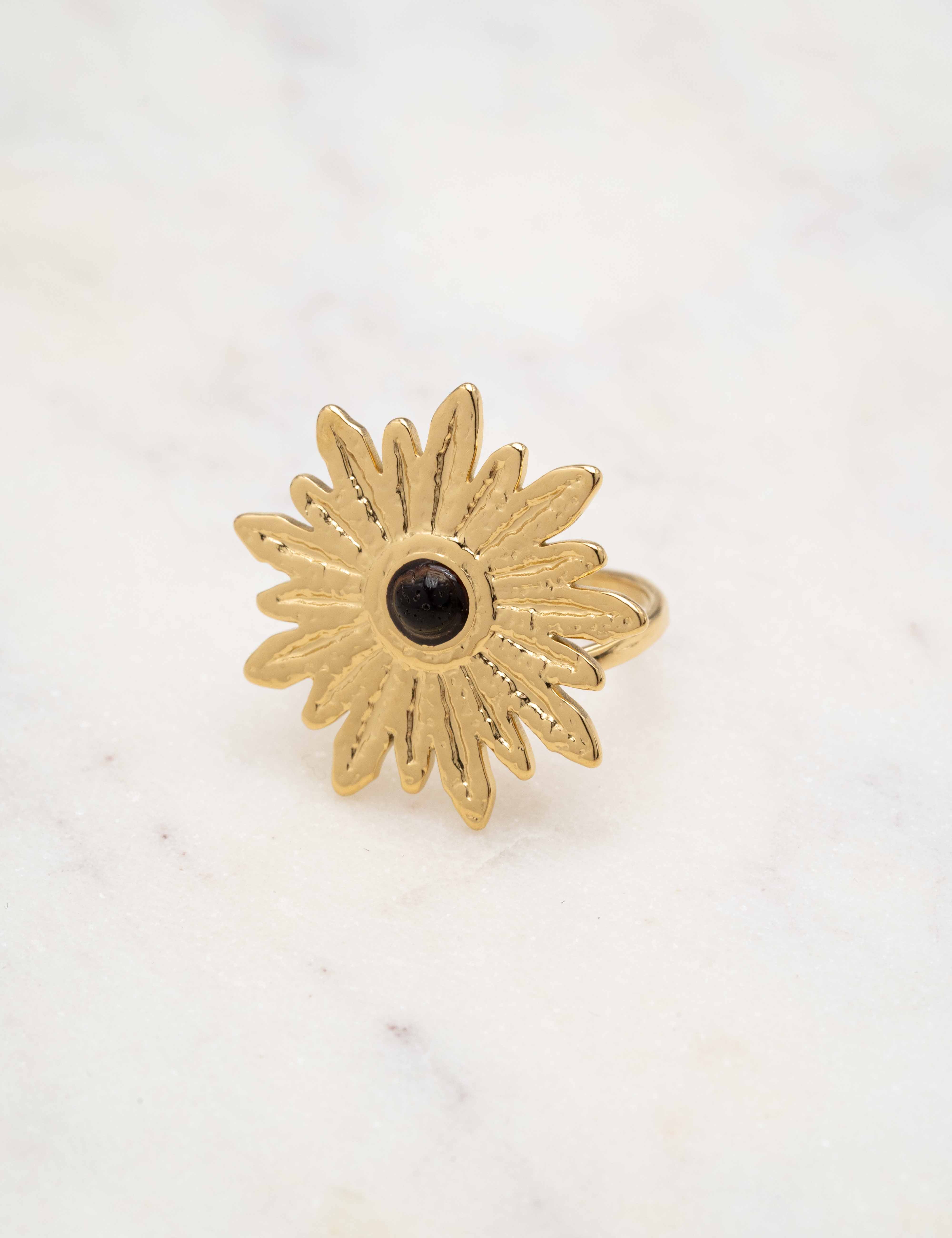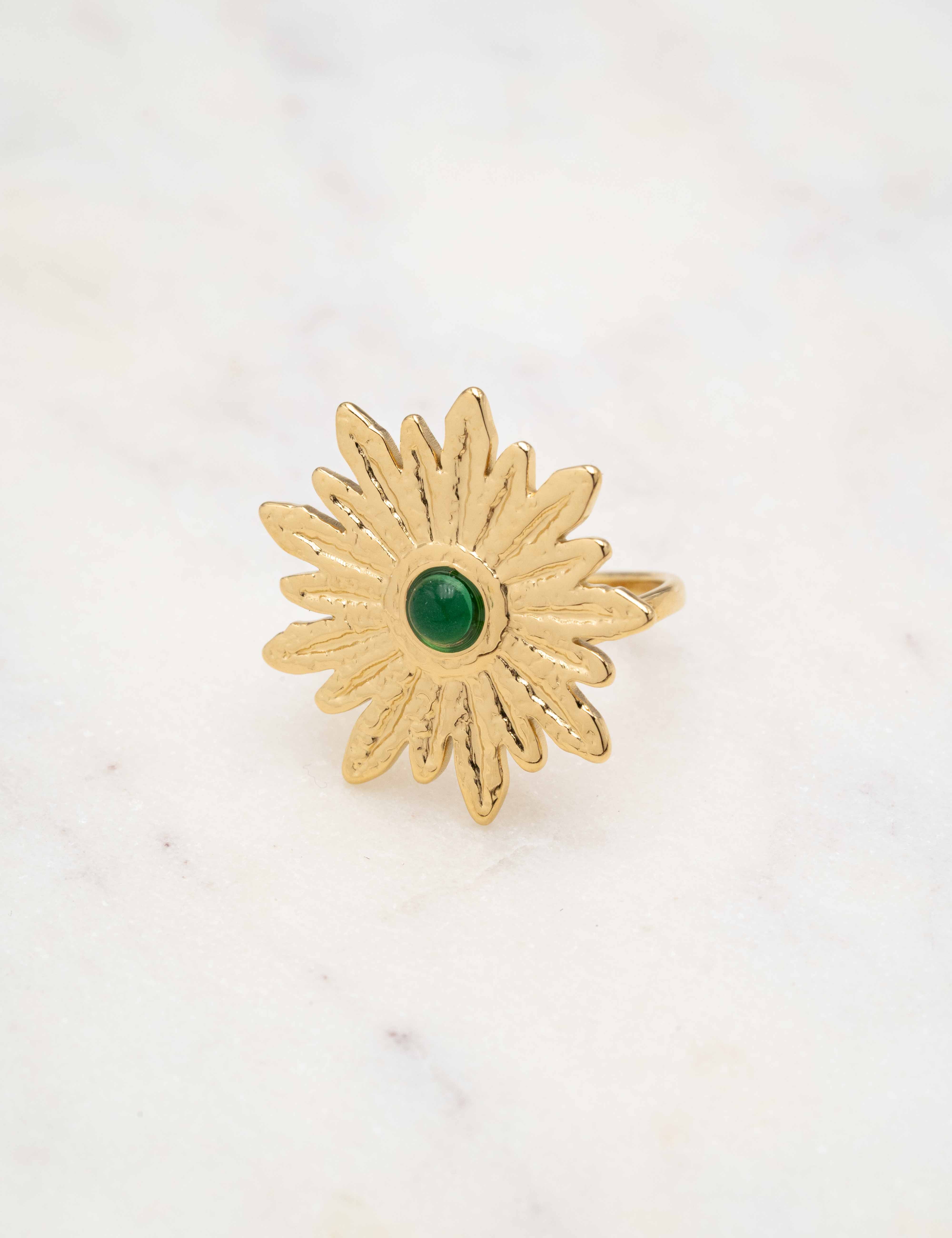 Bague ajustable graphique composée d'une pièce au motif floral texturé et ornée d'une pierre naturelle.
