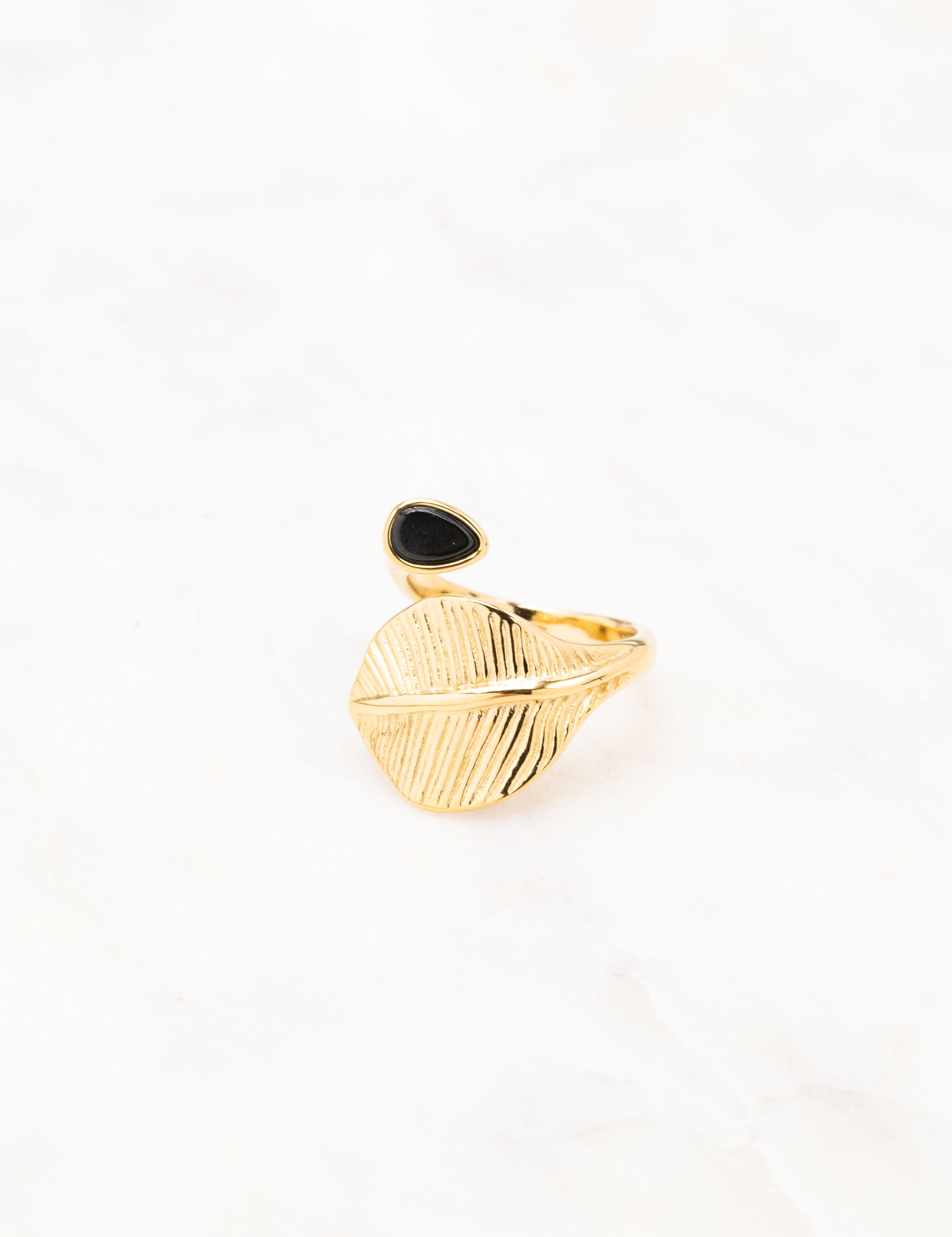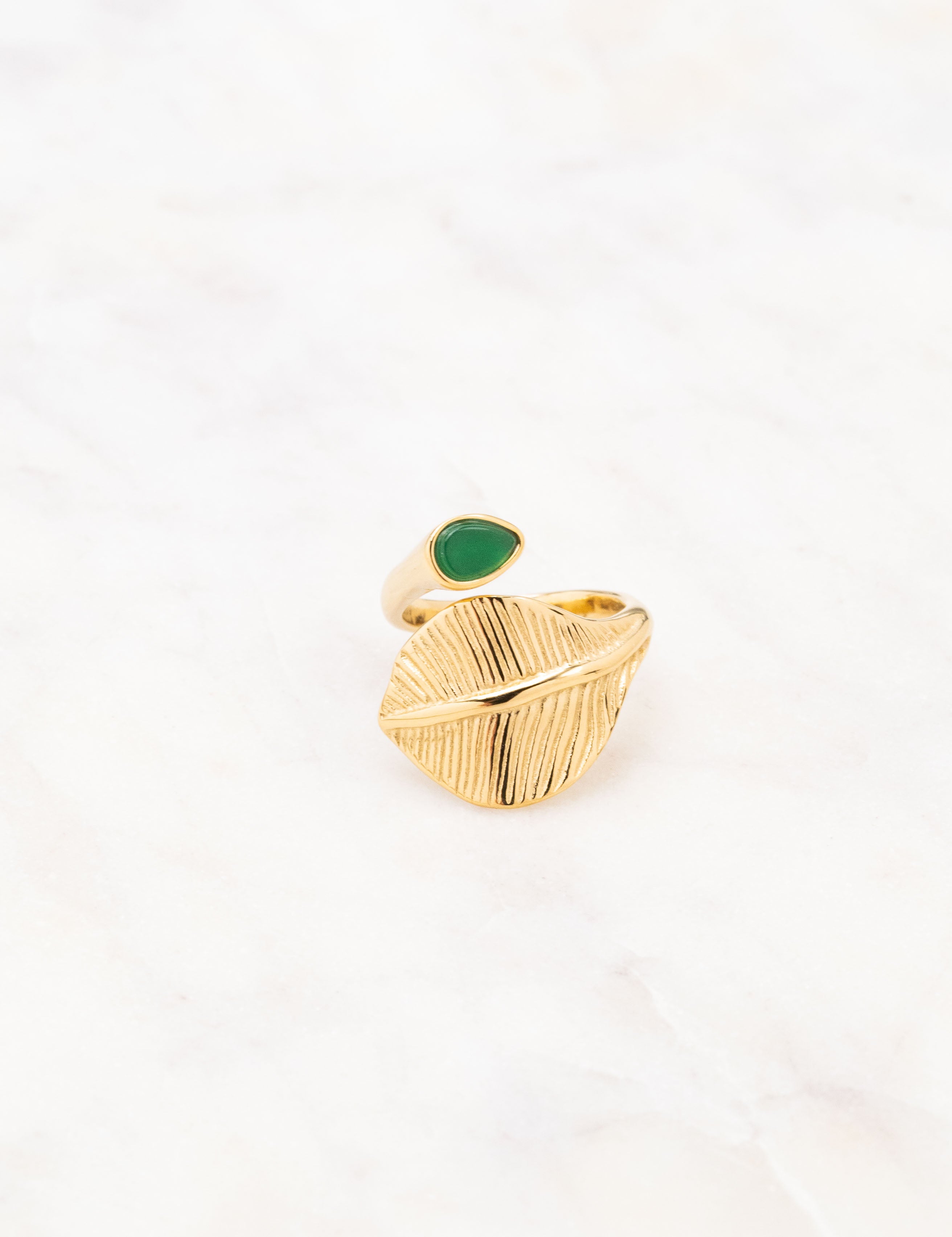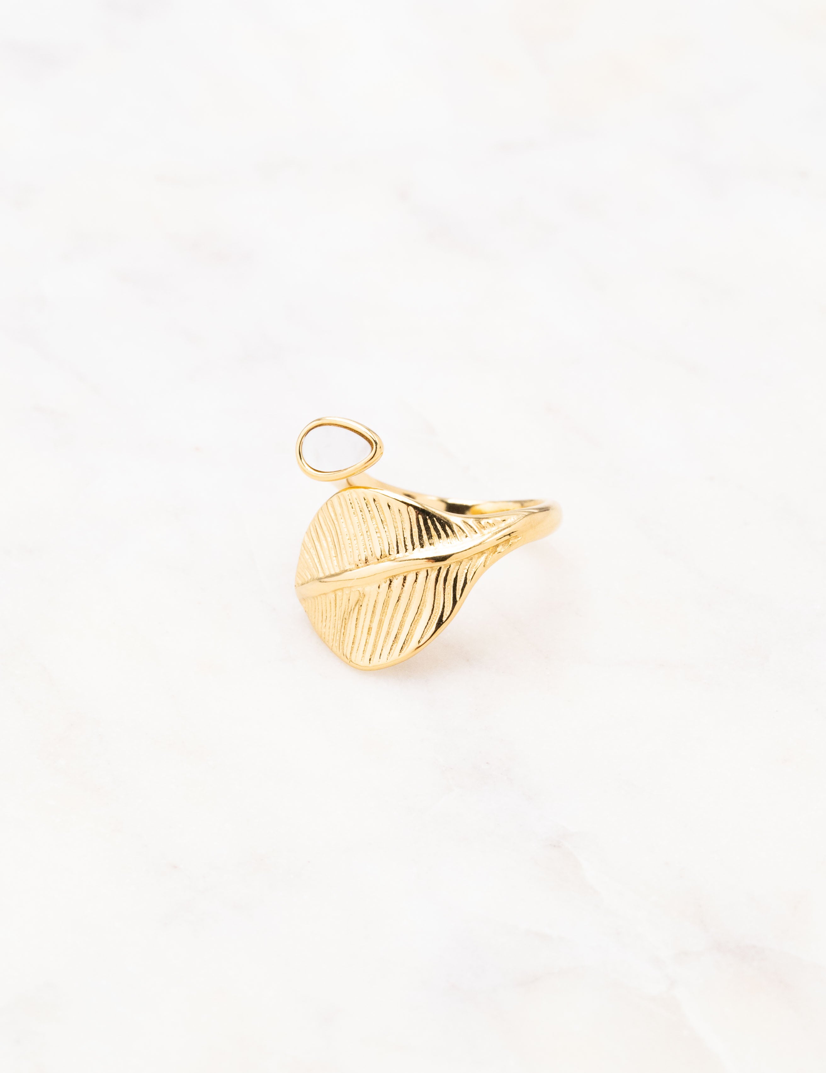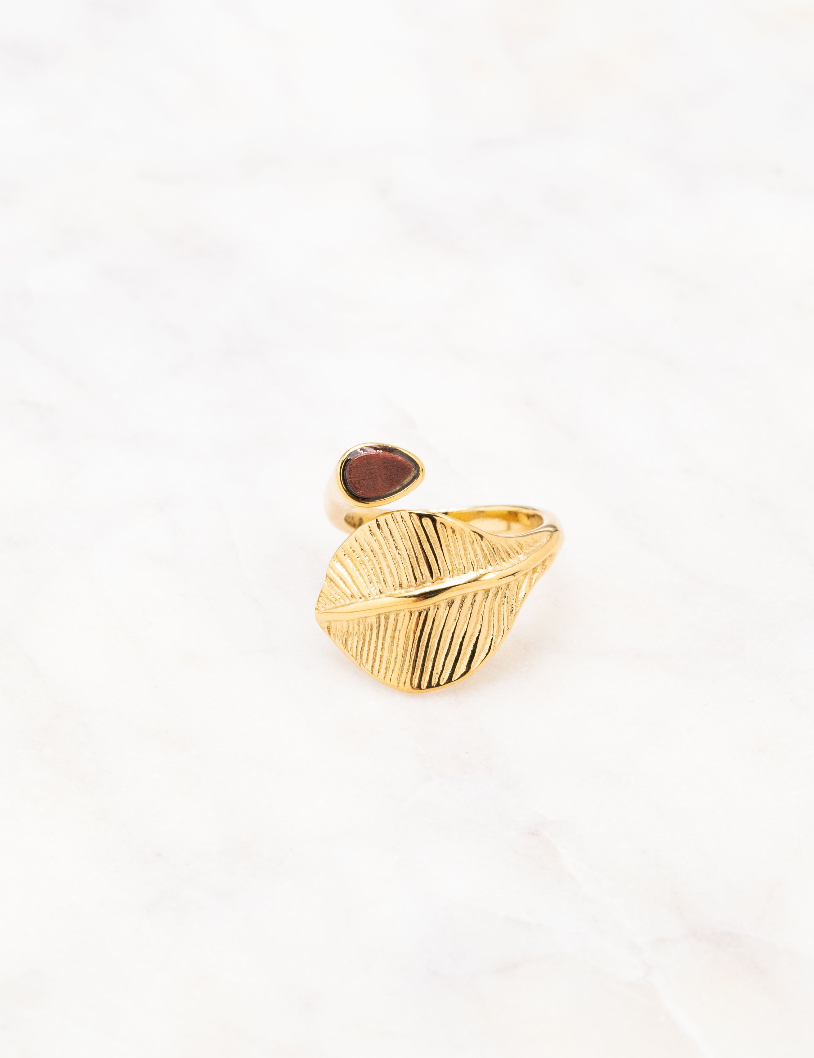 Bague graphique ajustable composée d'une feuille et sertie d'une pierre naturelle.