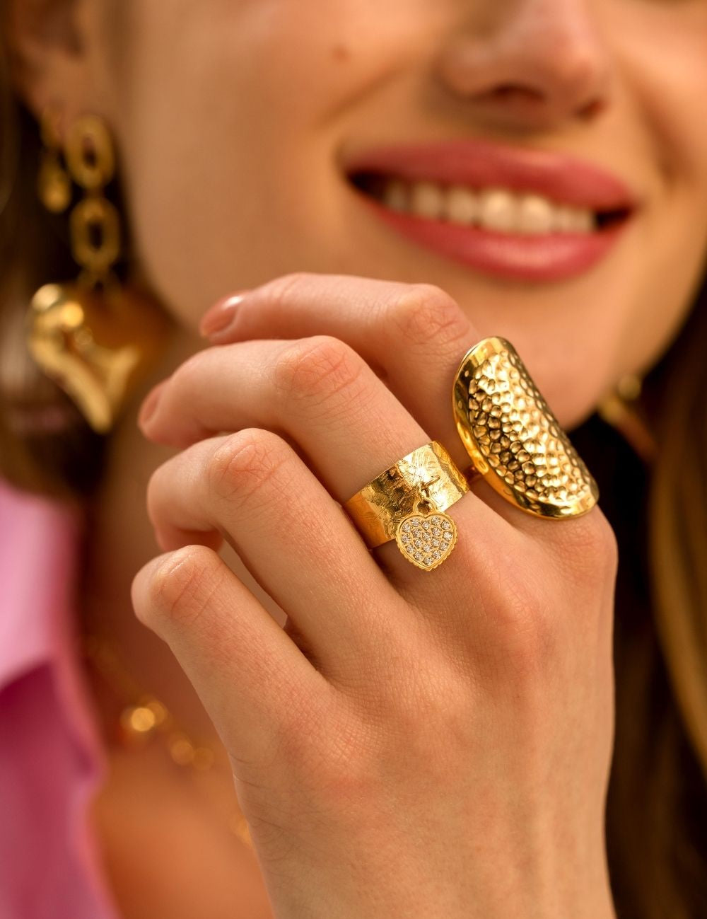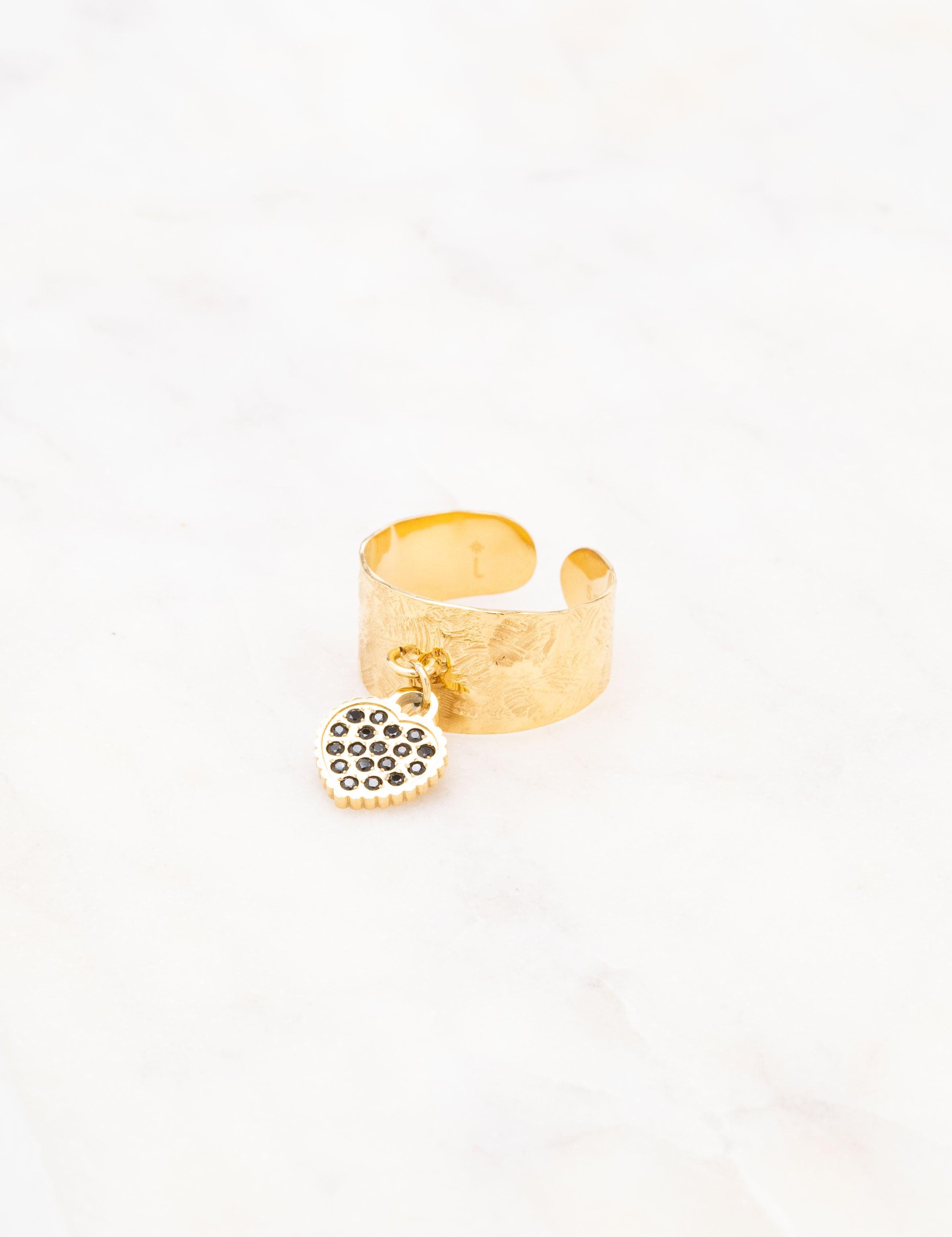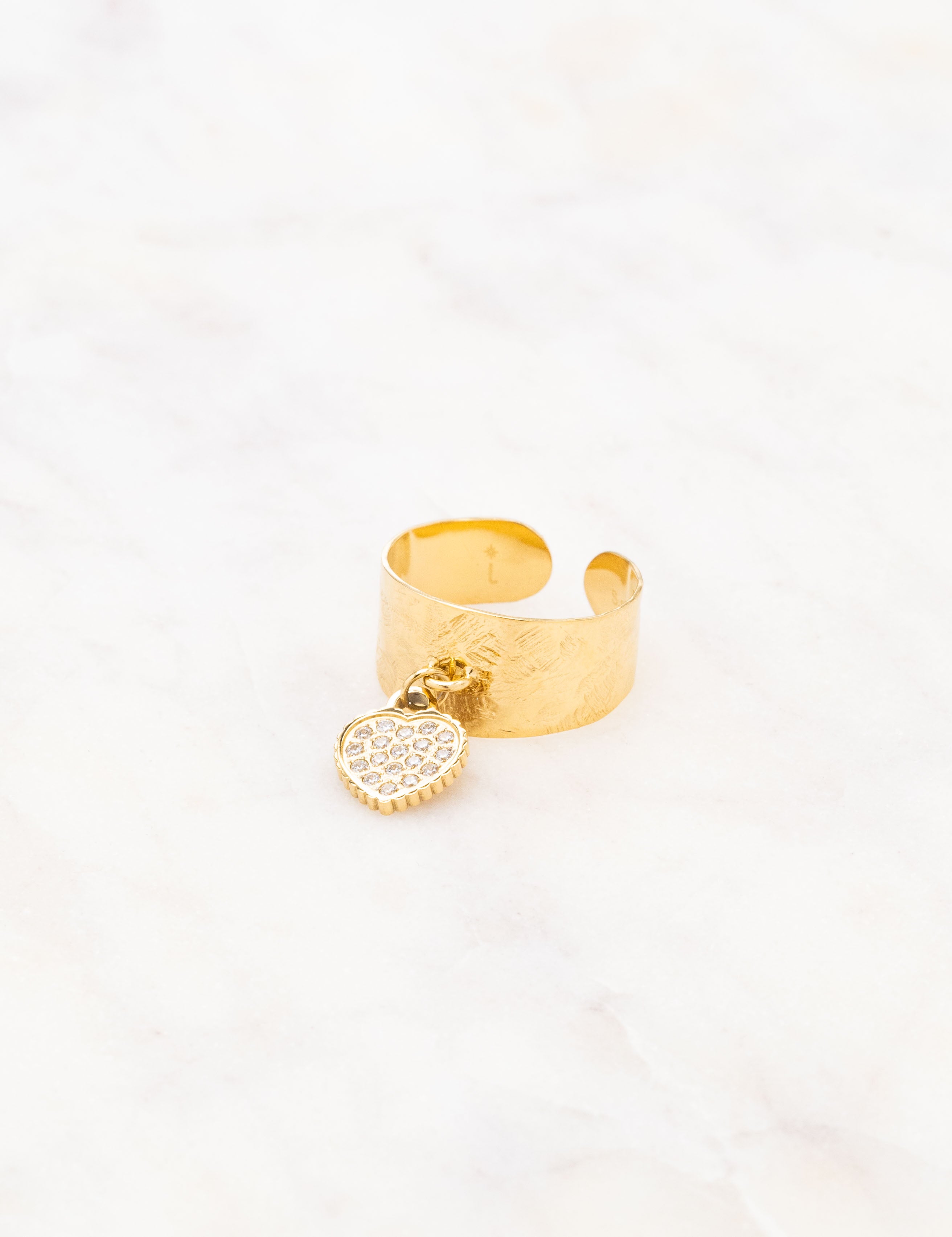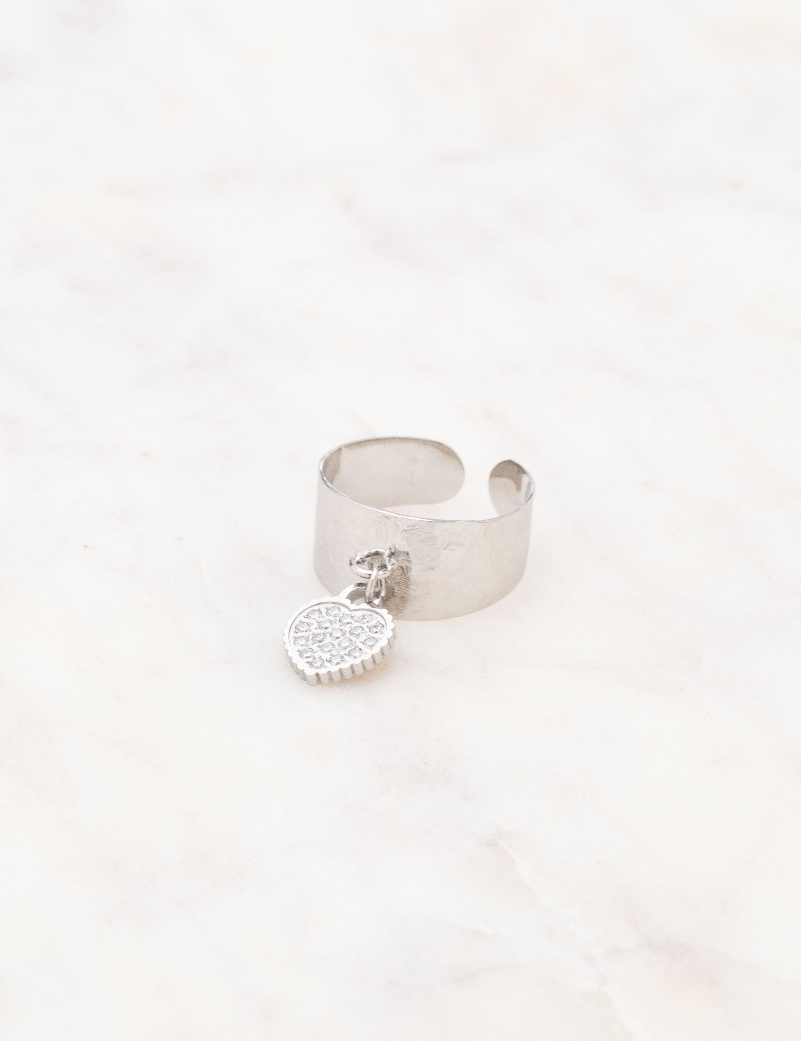 Bague ajustable martelée composée d'une pampille coeur ornée de strass.