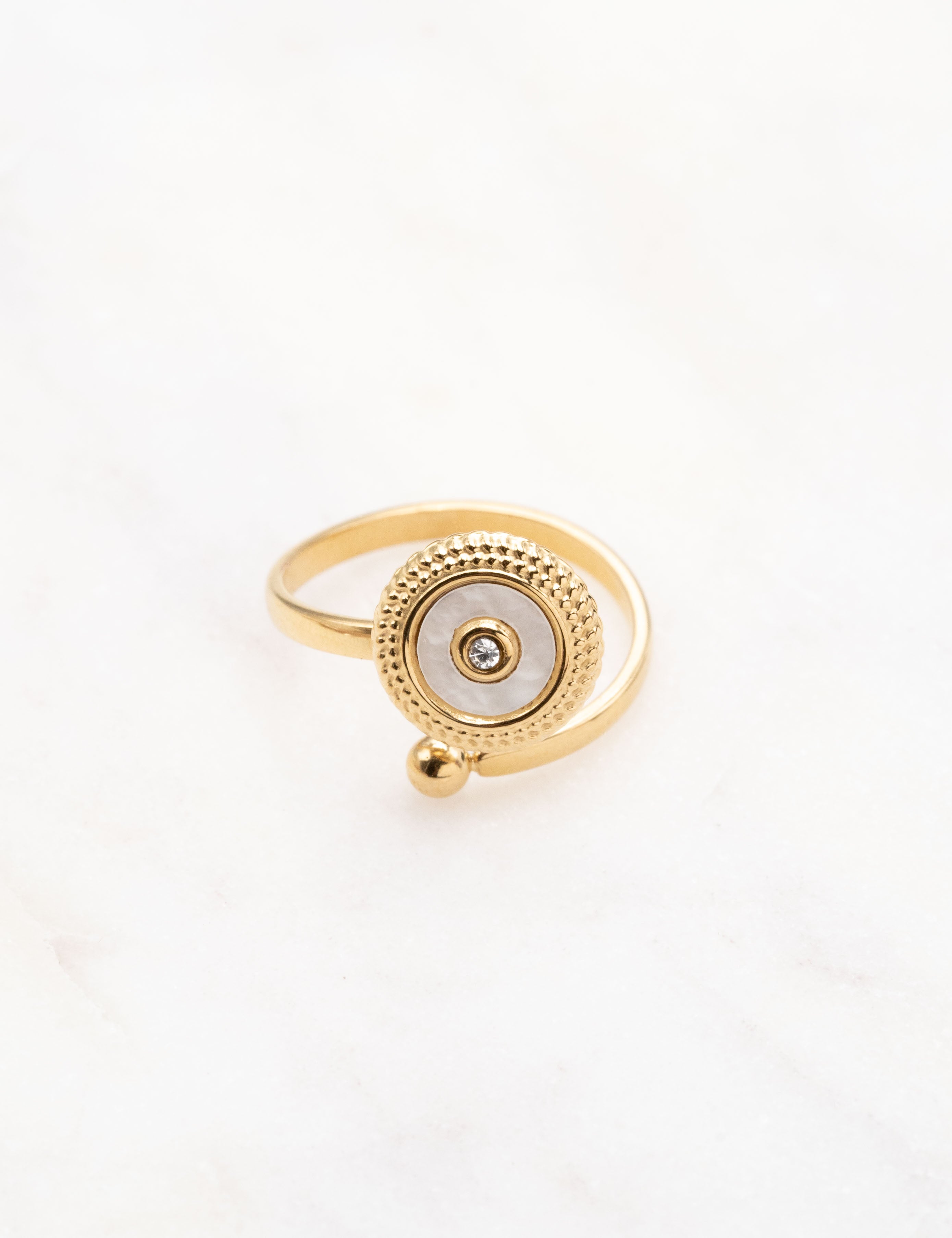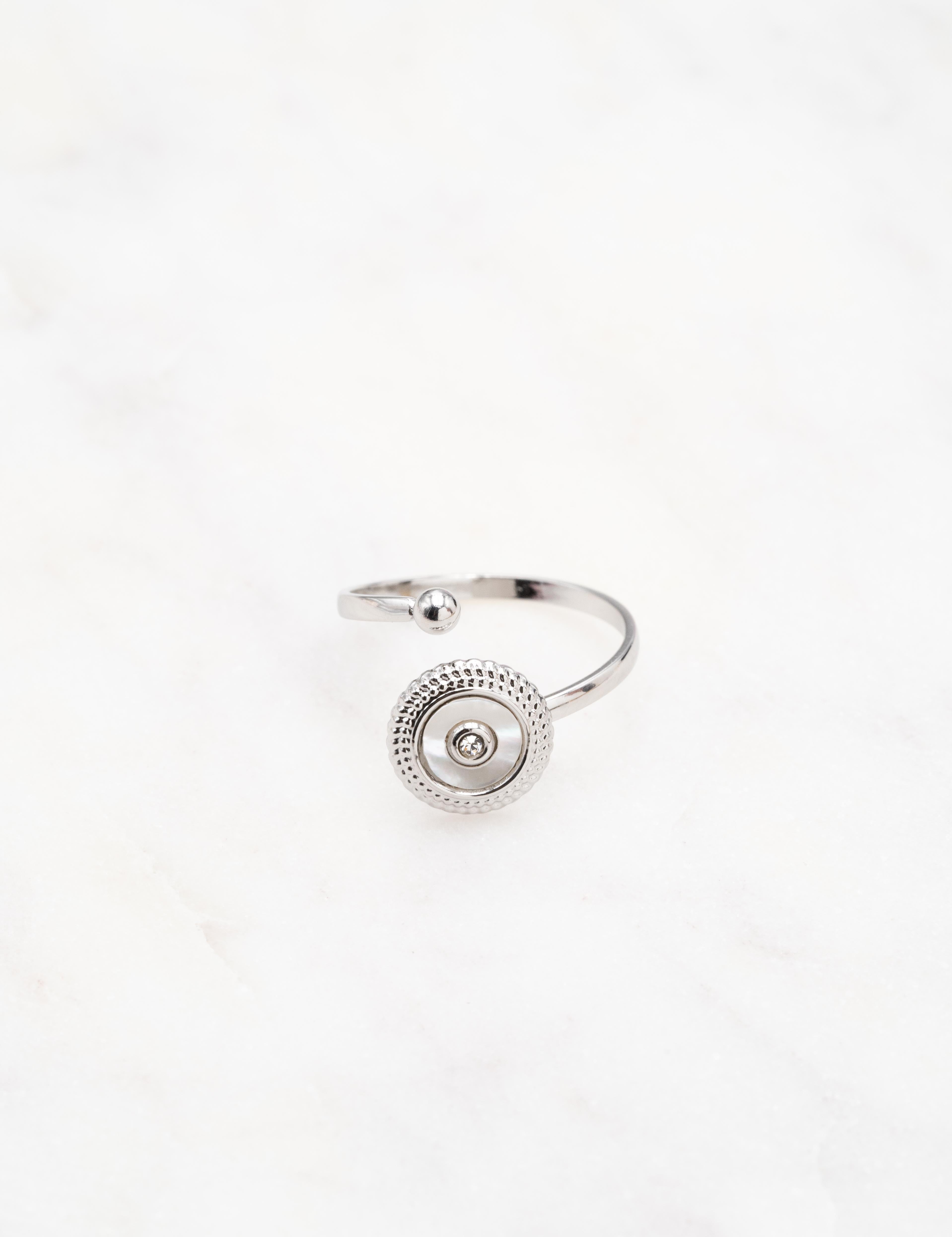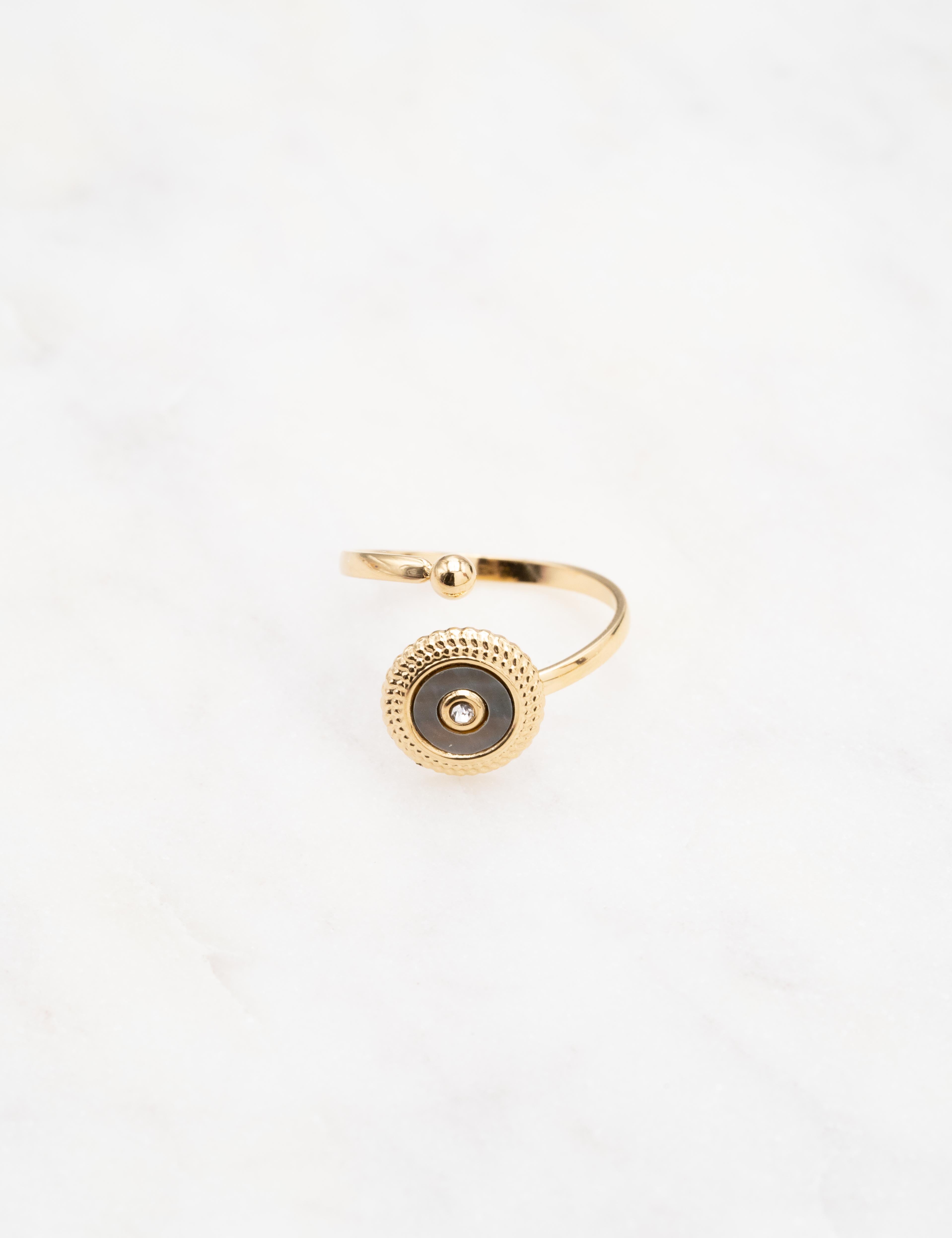 Bague ajustable composée d'une pièce ronde ornée d'une pierre naturelle et d'un strass.