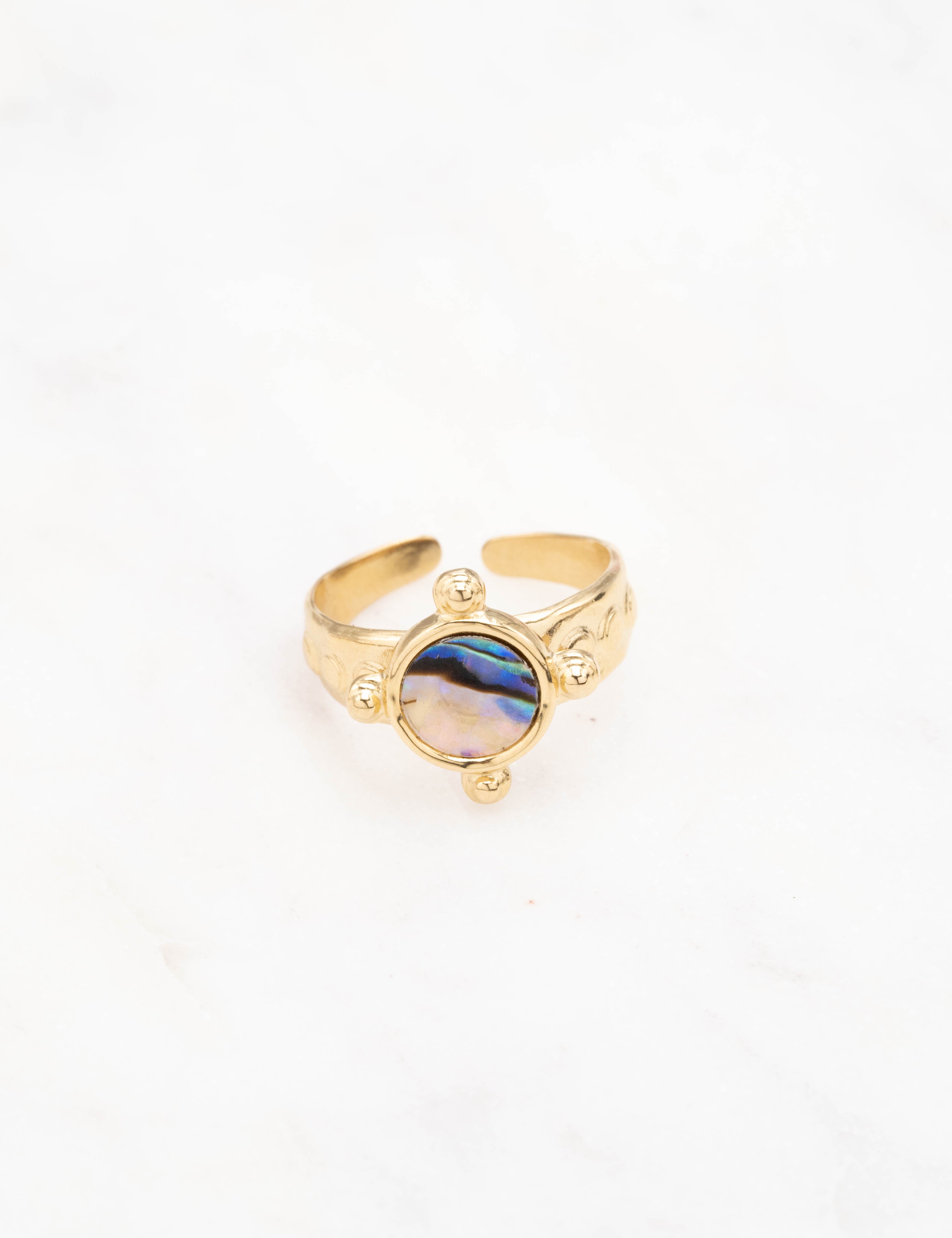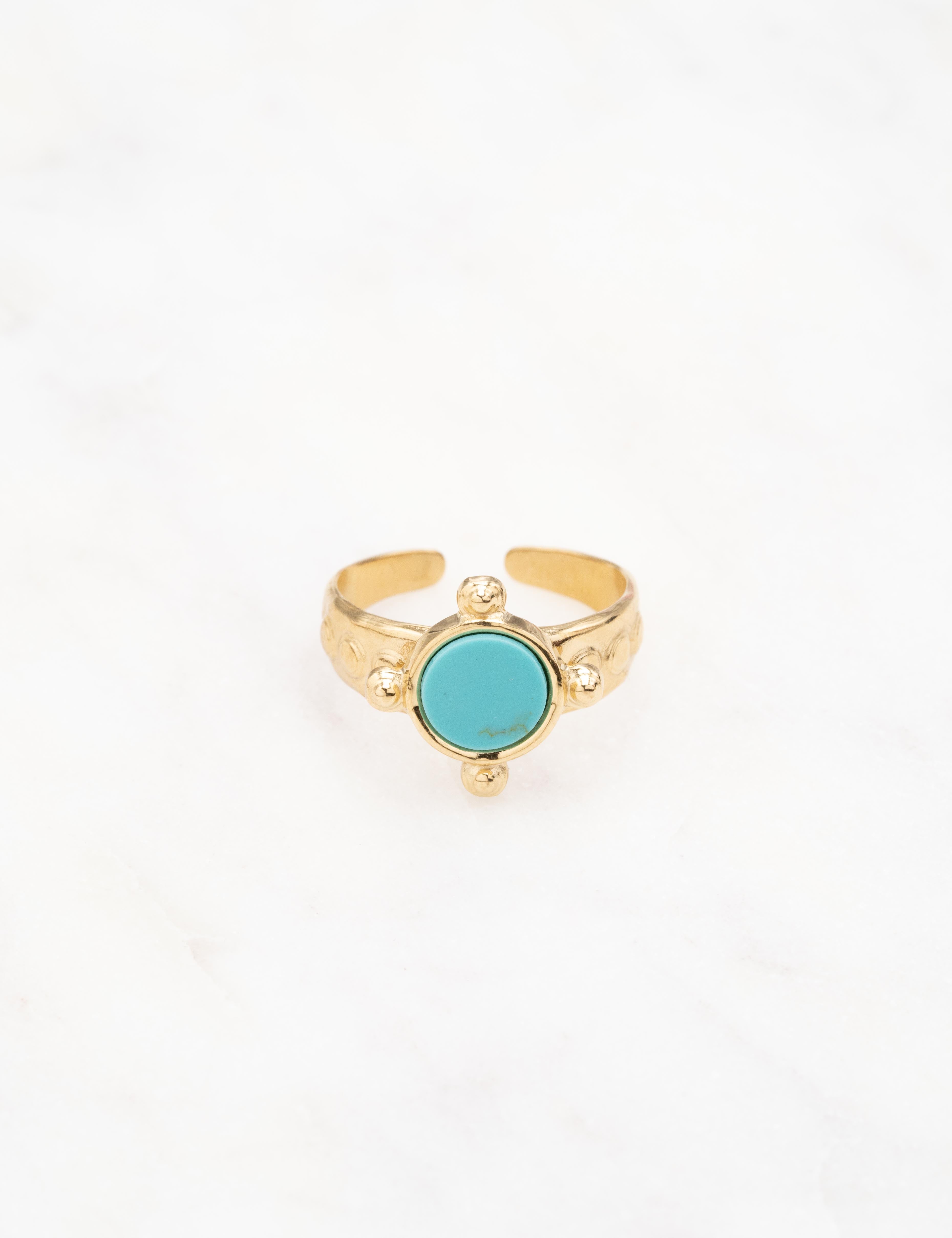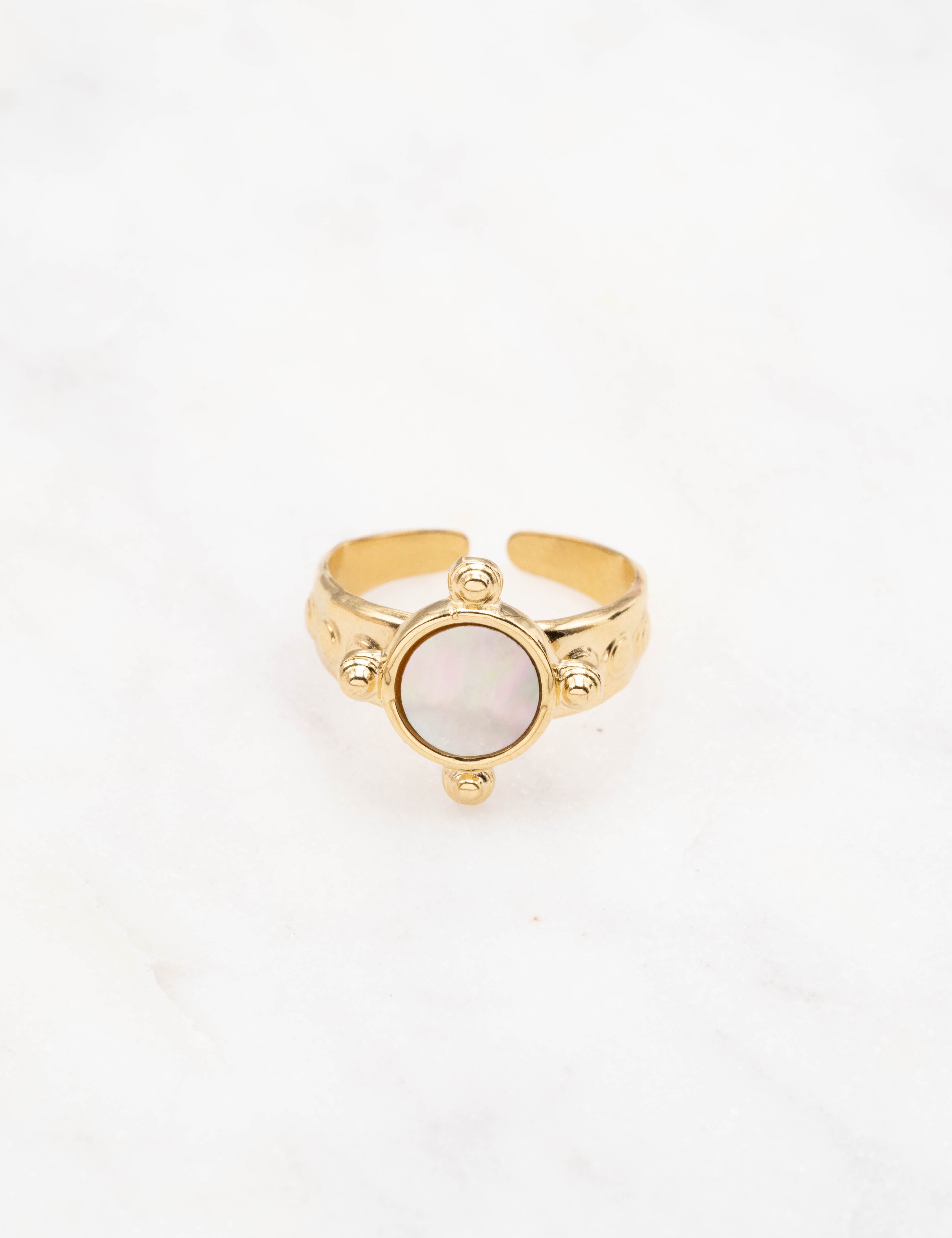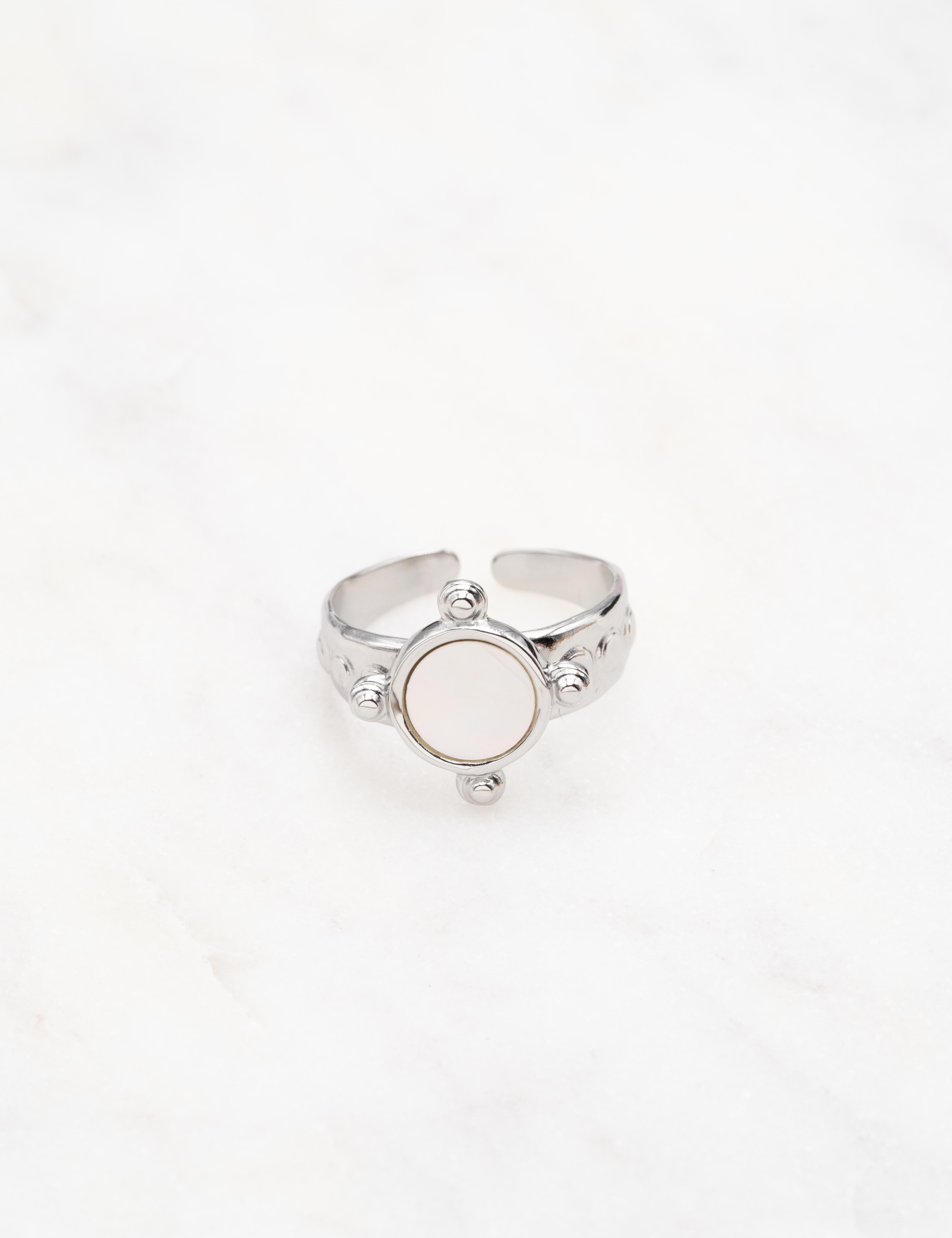 Bague ajustable graphique composée d'une pièce ronde ornée d'une pierre naturelle.