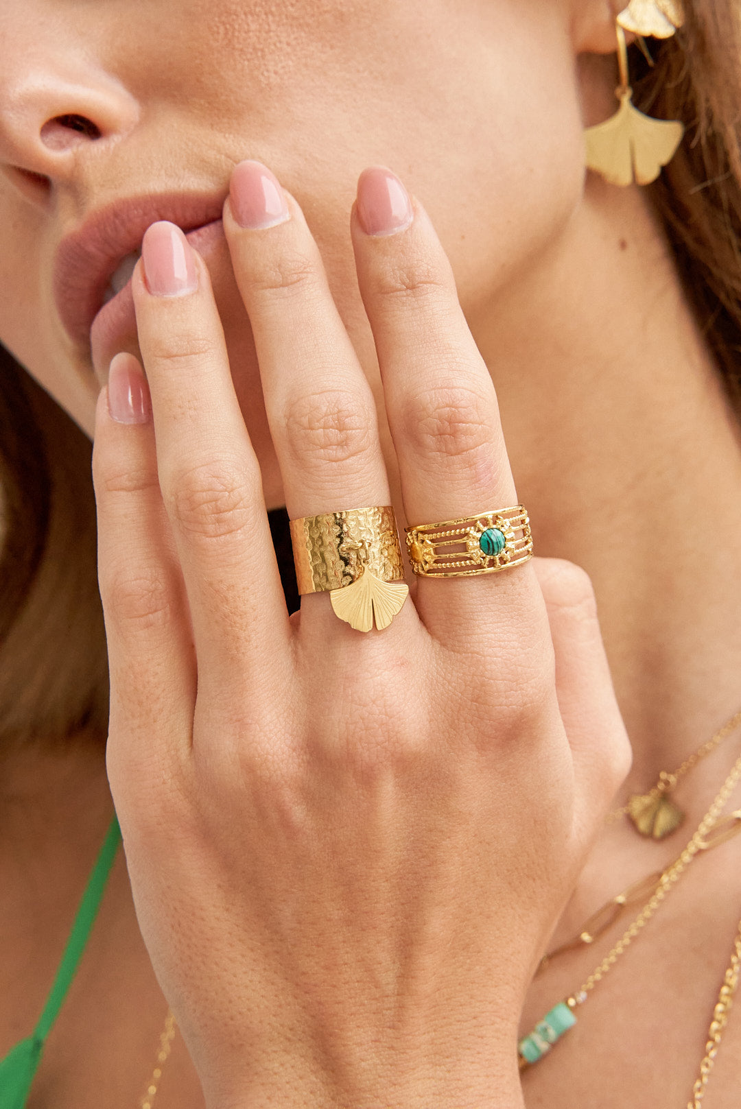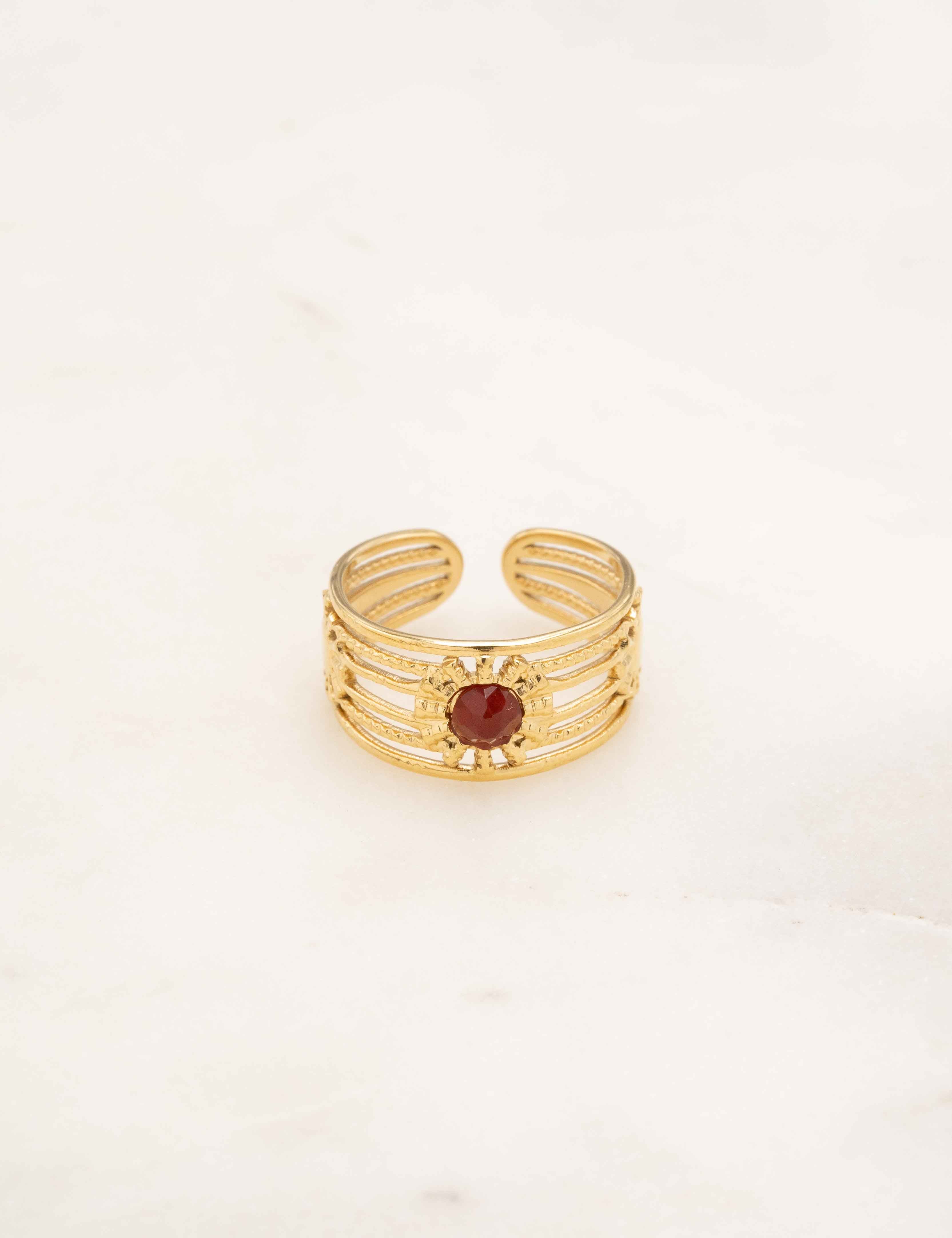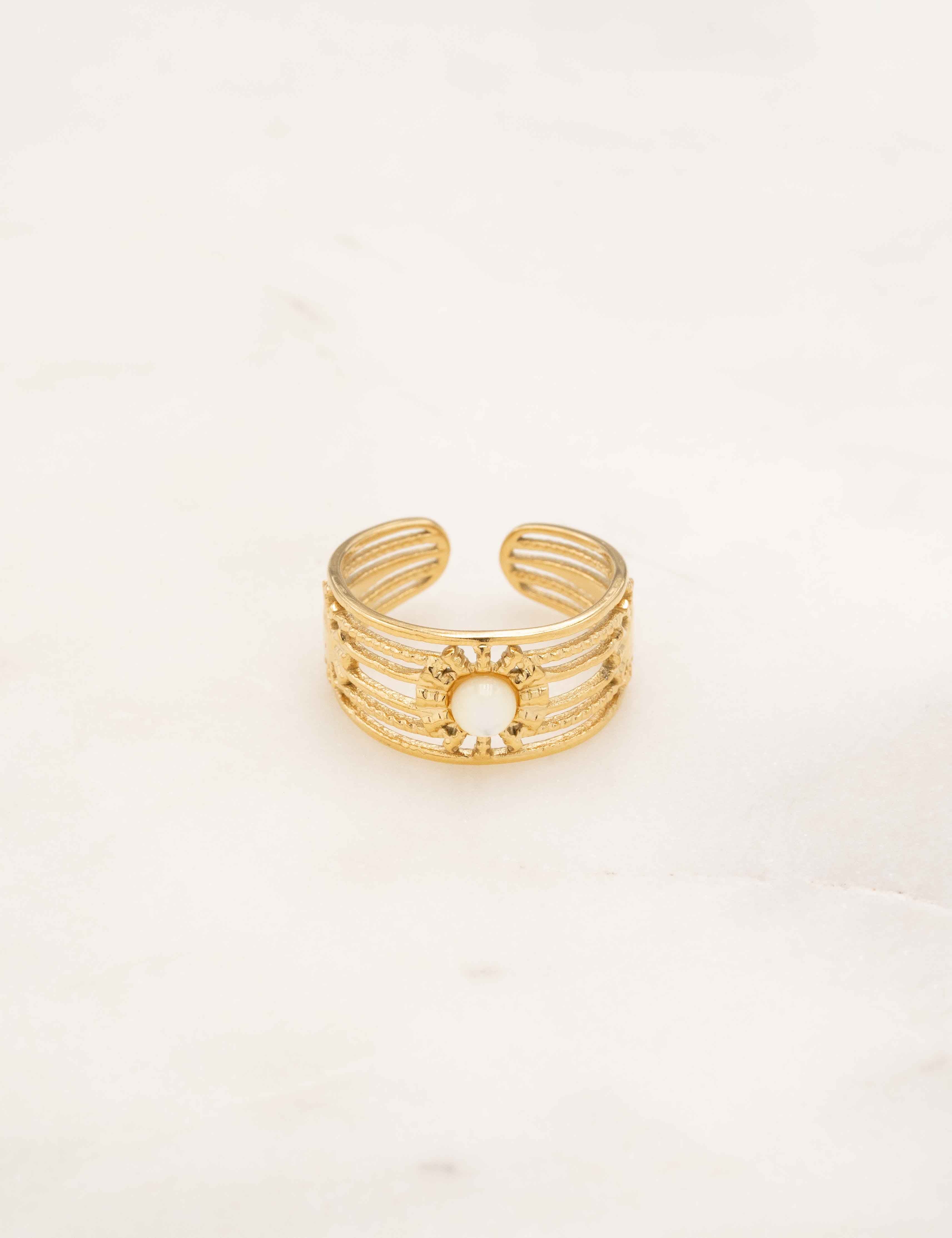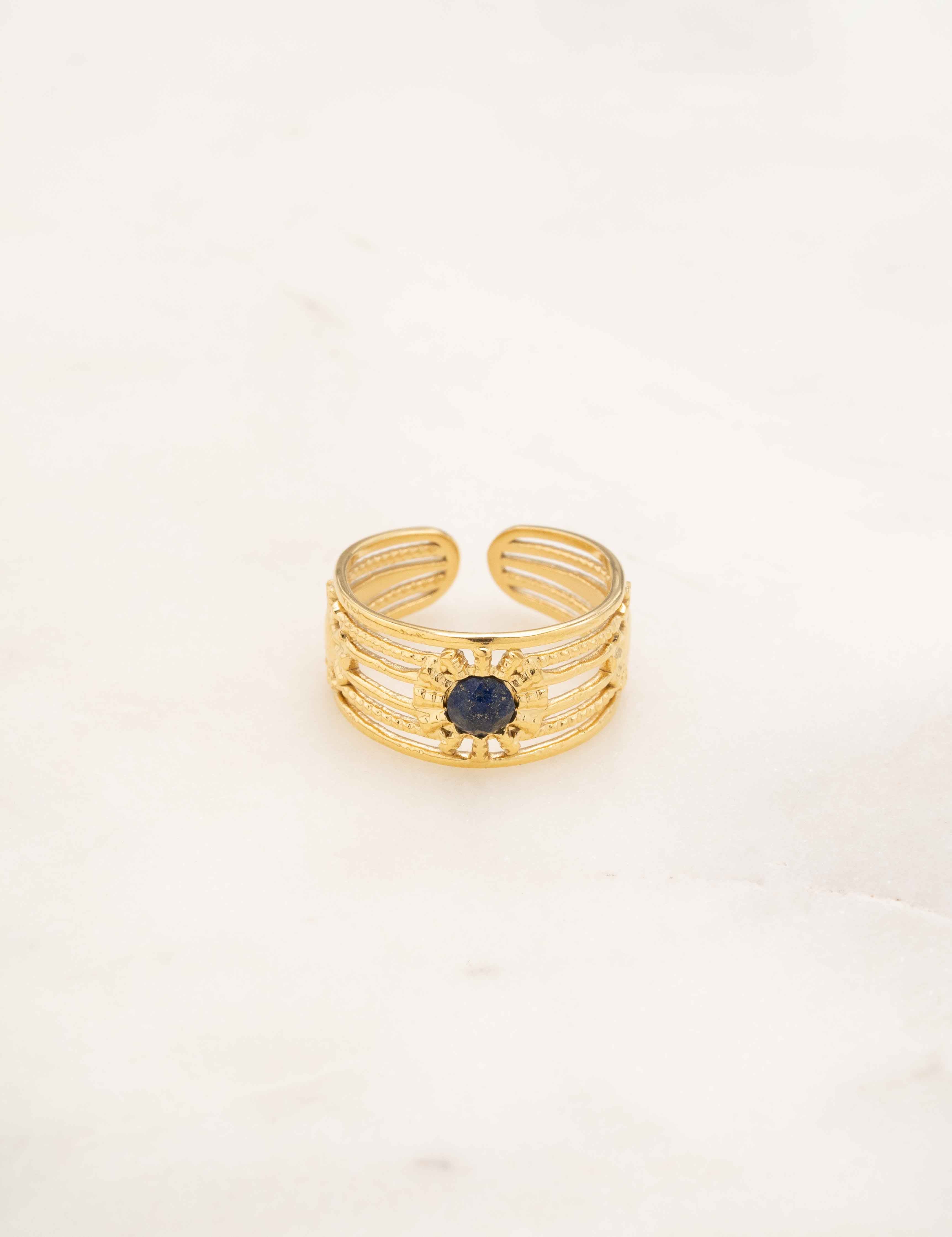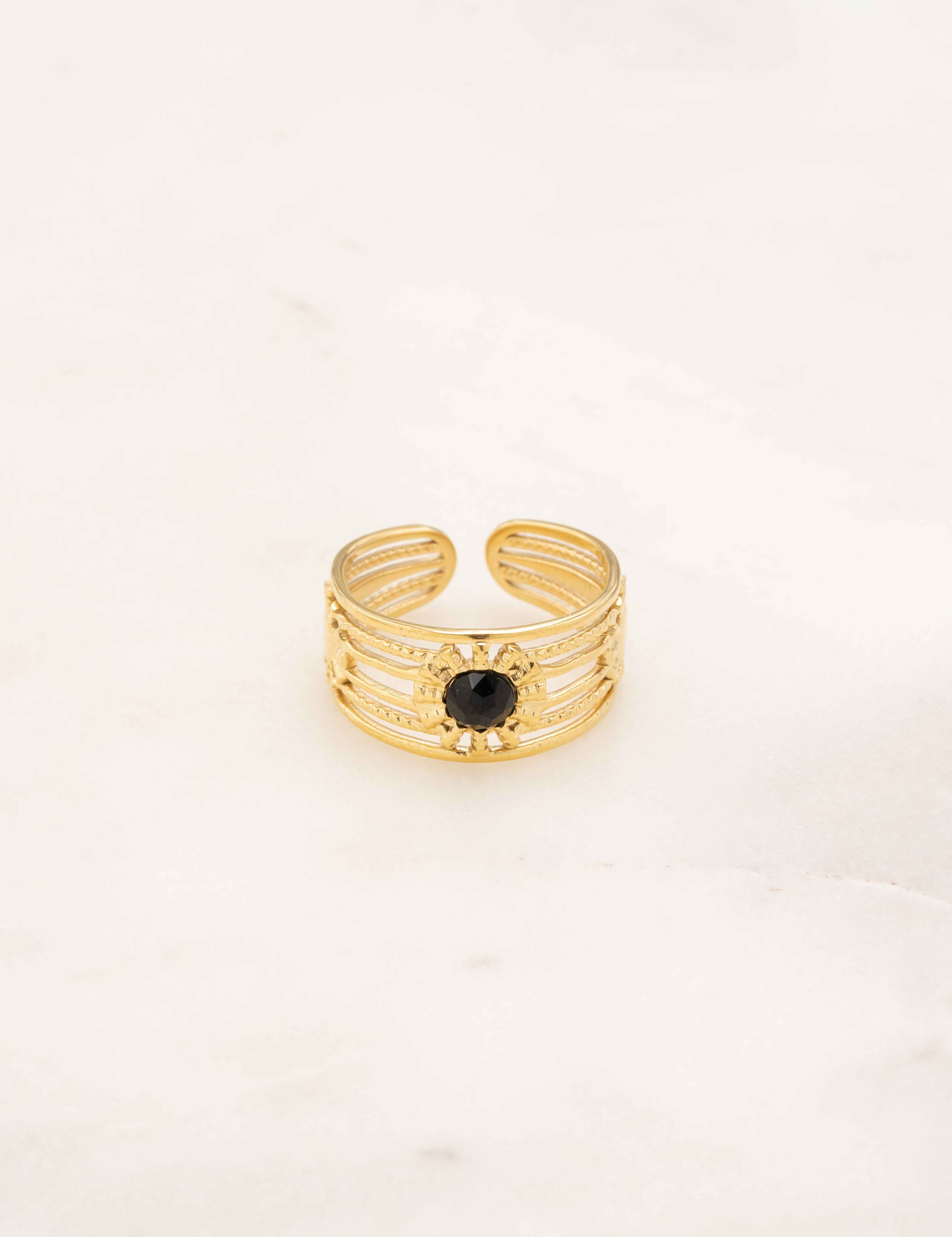 Bague ajustable graphique multirangs avec un motif solaire central serti d'une pierre naturelle.