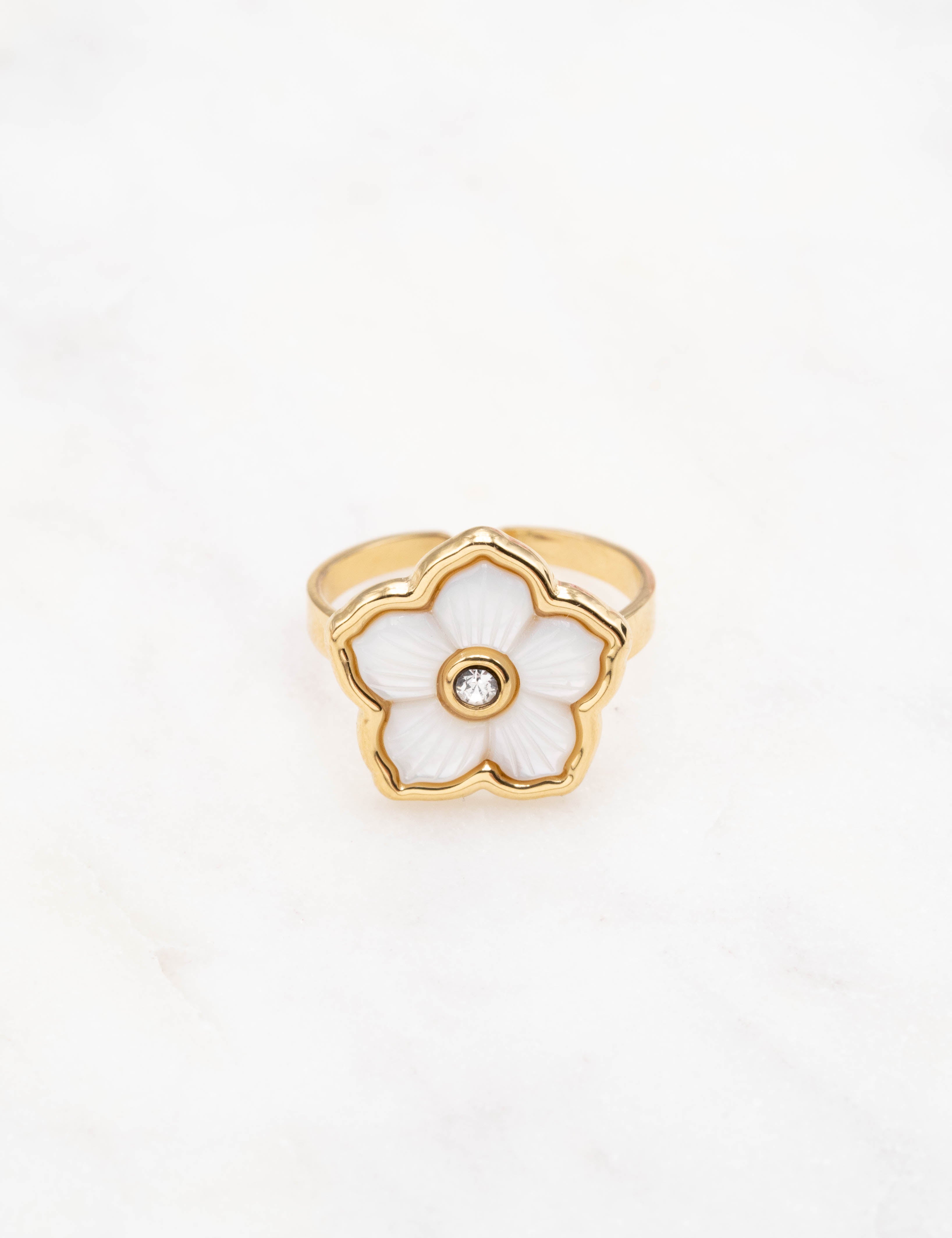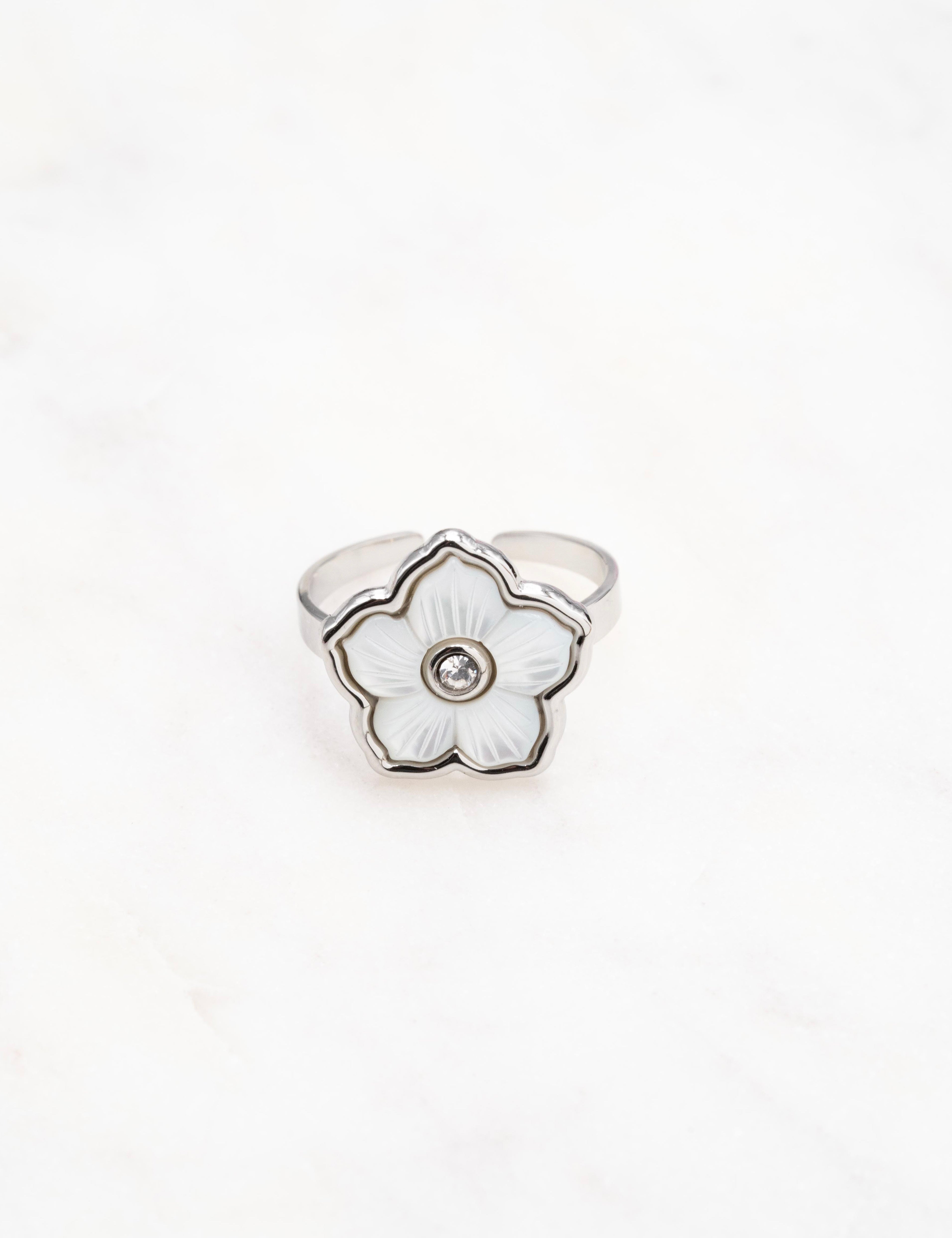 Bague ajustable composée d'une fleur ornée de nacre et d'un strass.
