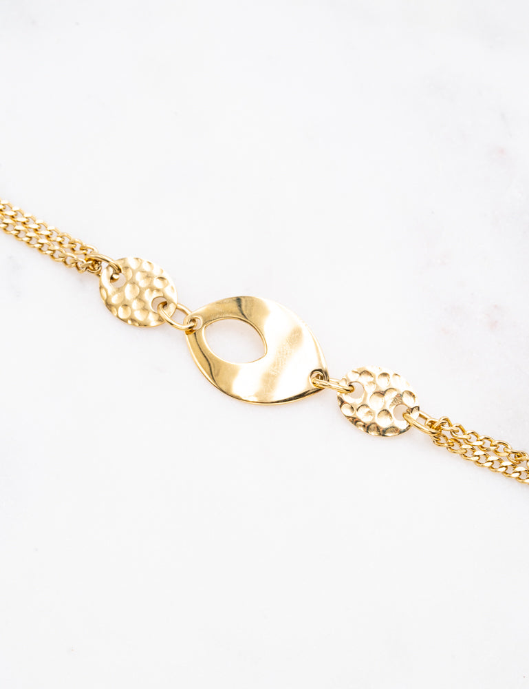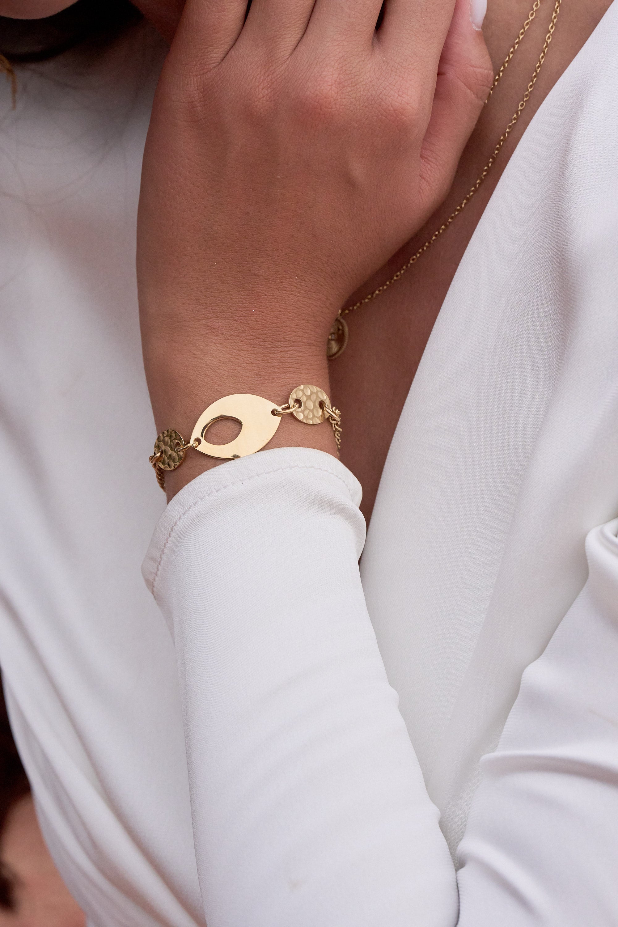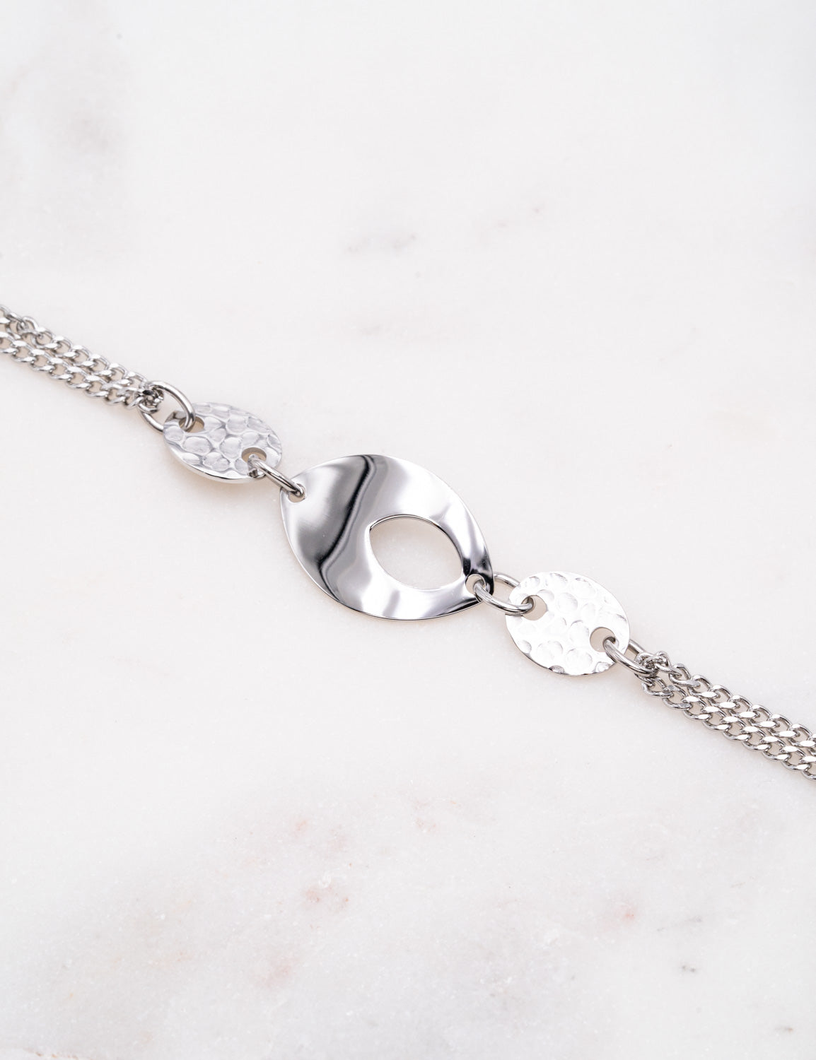 Bracelet réglable en maille avec un jeu de pièces graphiques texturées, lisses et ajourées. Fermoir mousqueton et chainette de réglage.