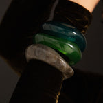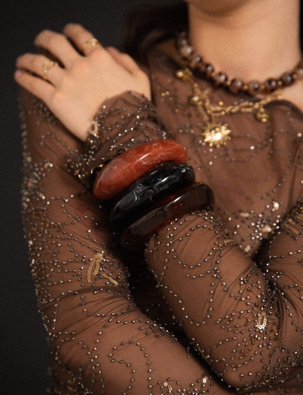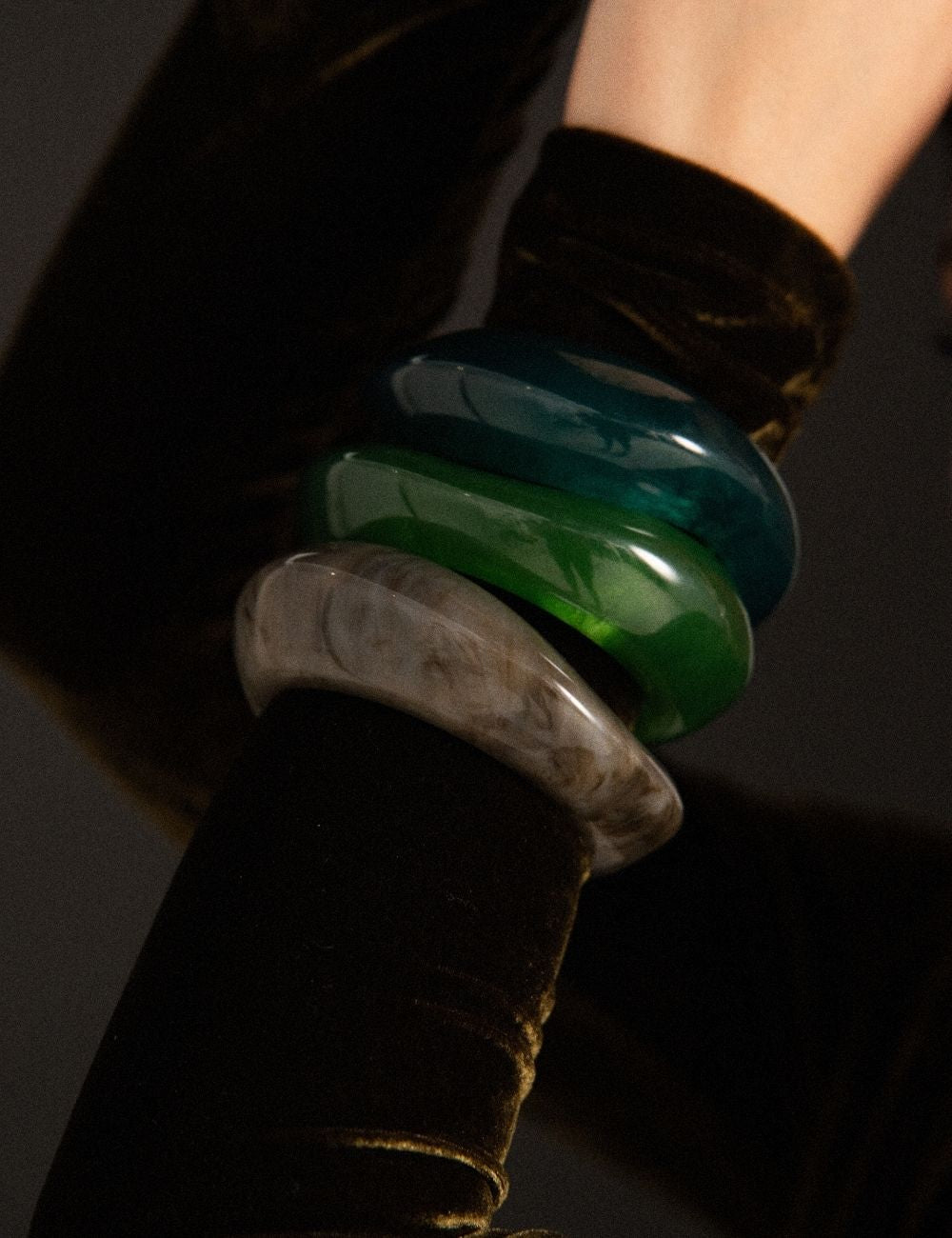 Notes : le bracelet n'est pas malléable (Design rigide, Sans fermeture). Les couleurs en acétate diffèrent d'une pièce à l'autre. Il existe donc des variations de couleur. Les motifs sont aléatoires sur le jonc. Vendu à l'unité.