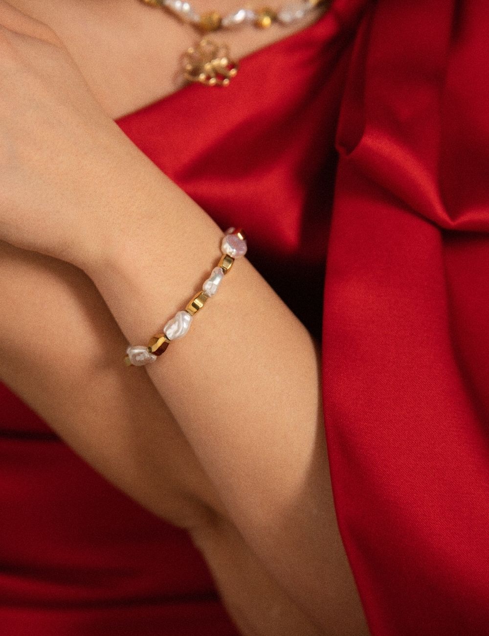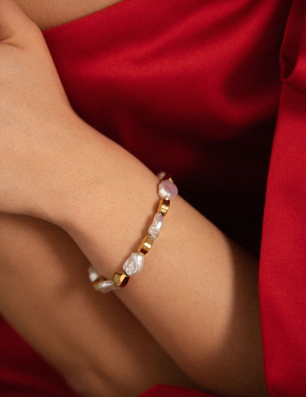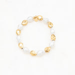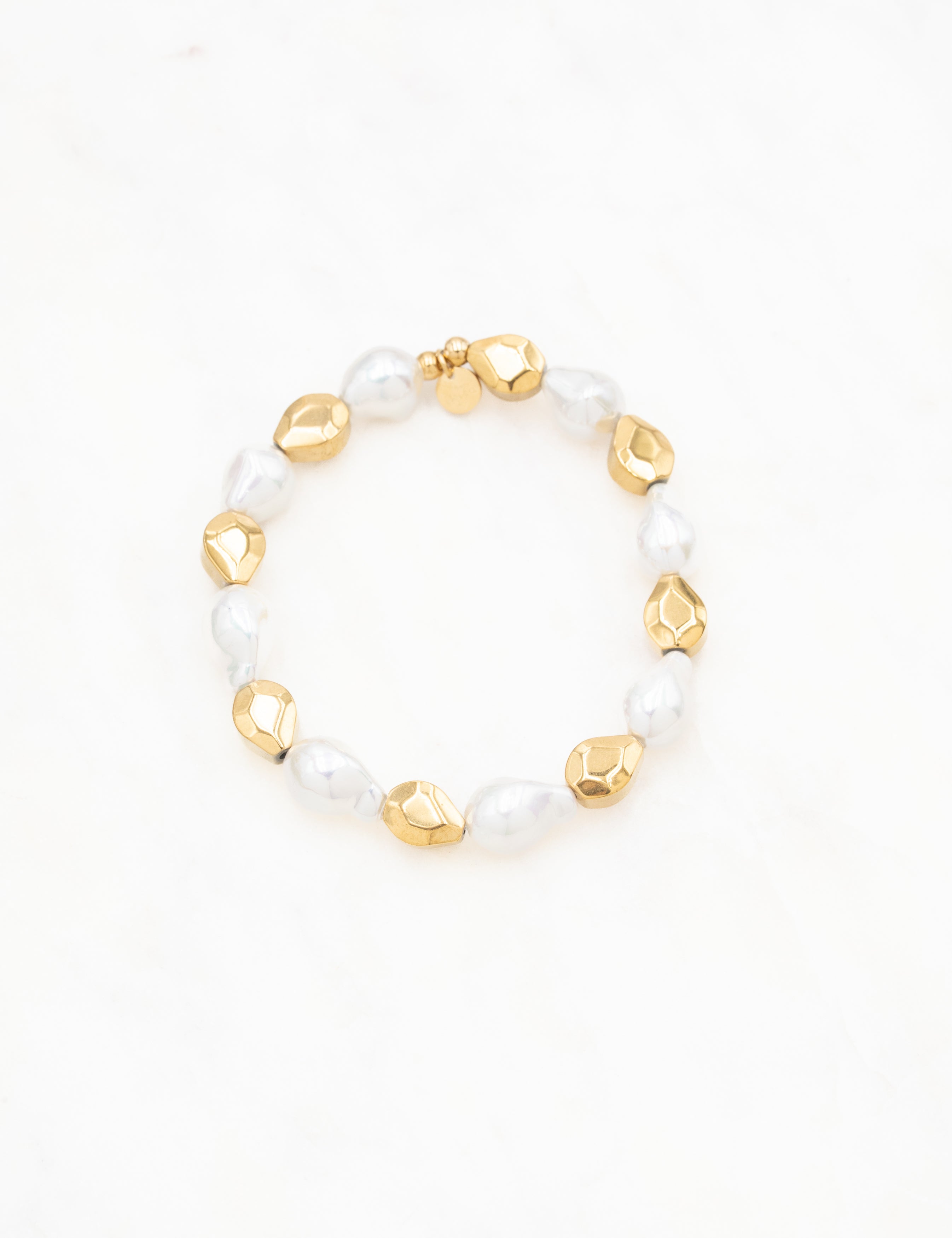 Bracelet élastique composé d'un joli enfilage de perles d'imitation texturées et de perles facetées.