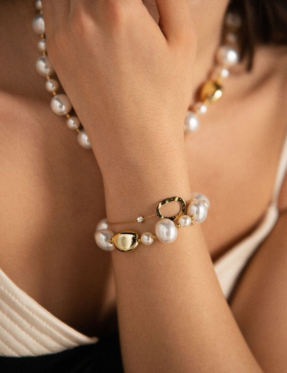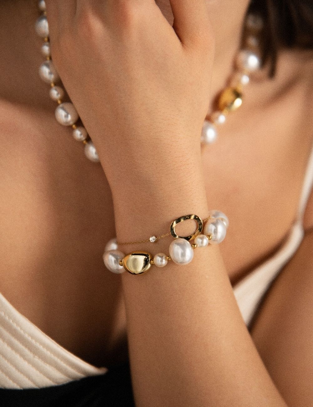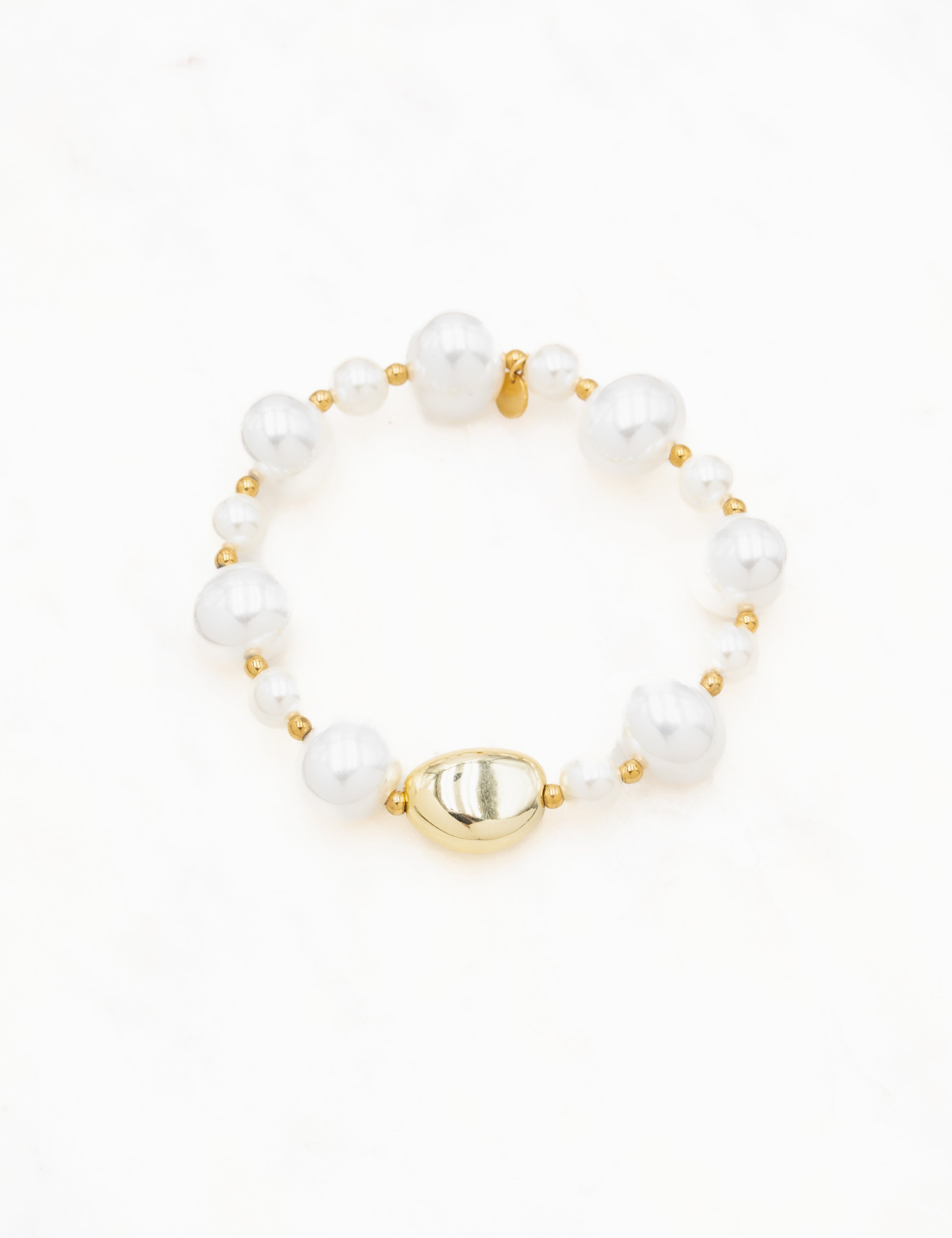Bracelet élastique composé d'un joli enfilage de perles d'imitation et de perles dorées.