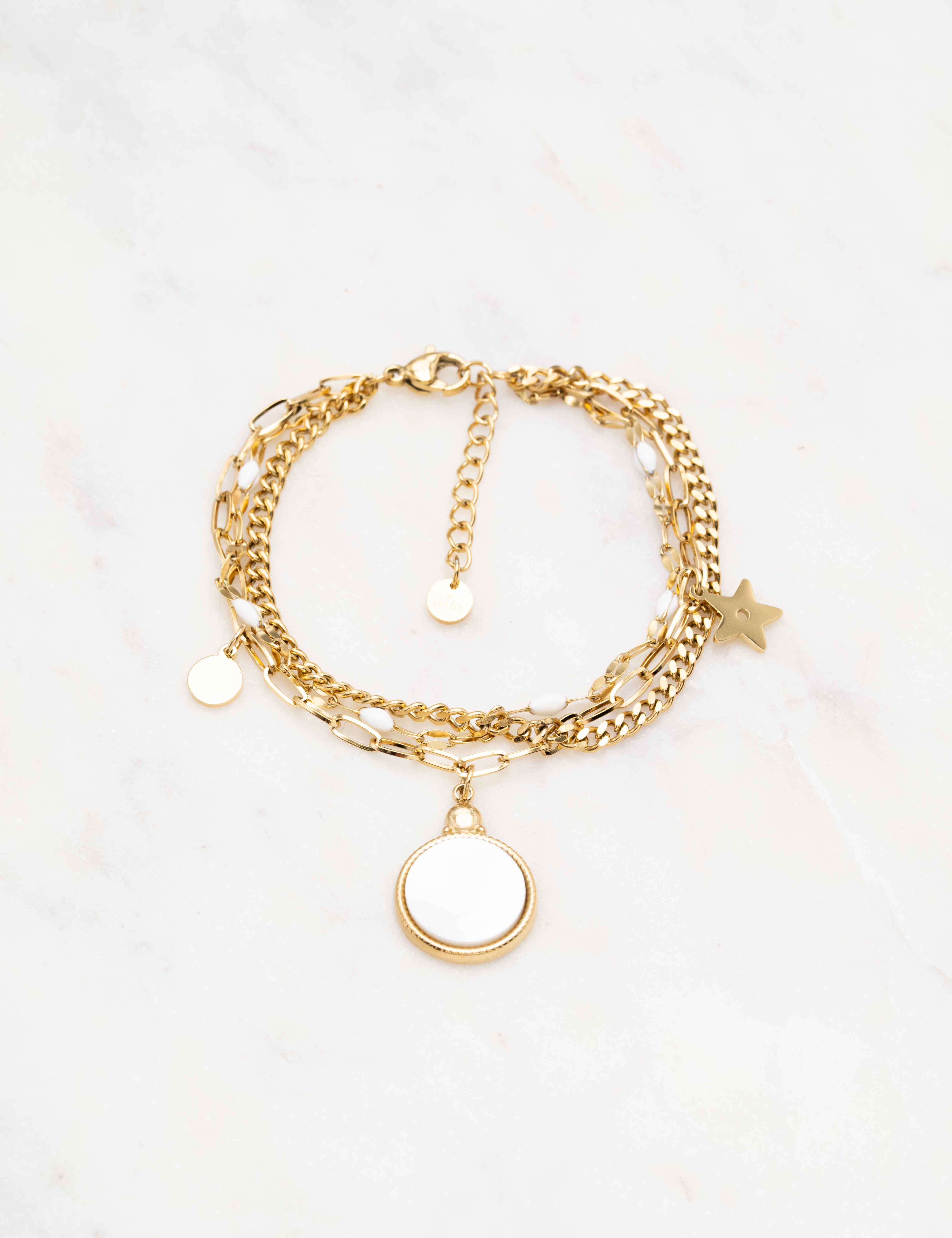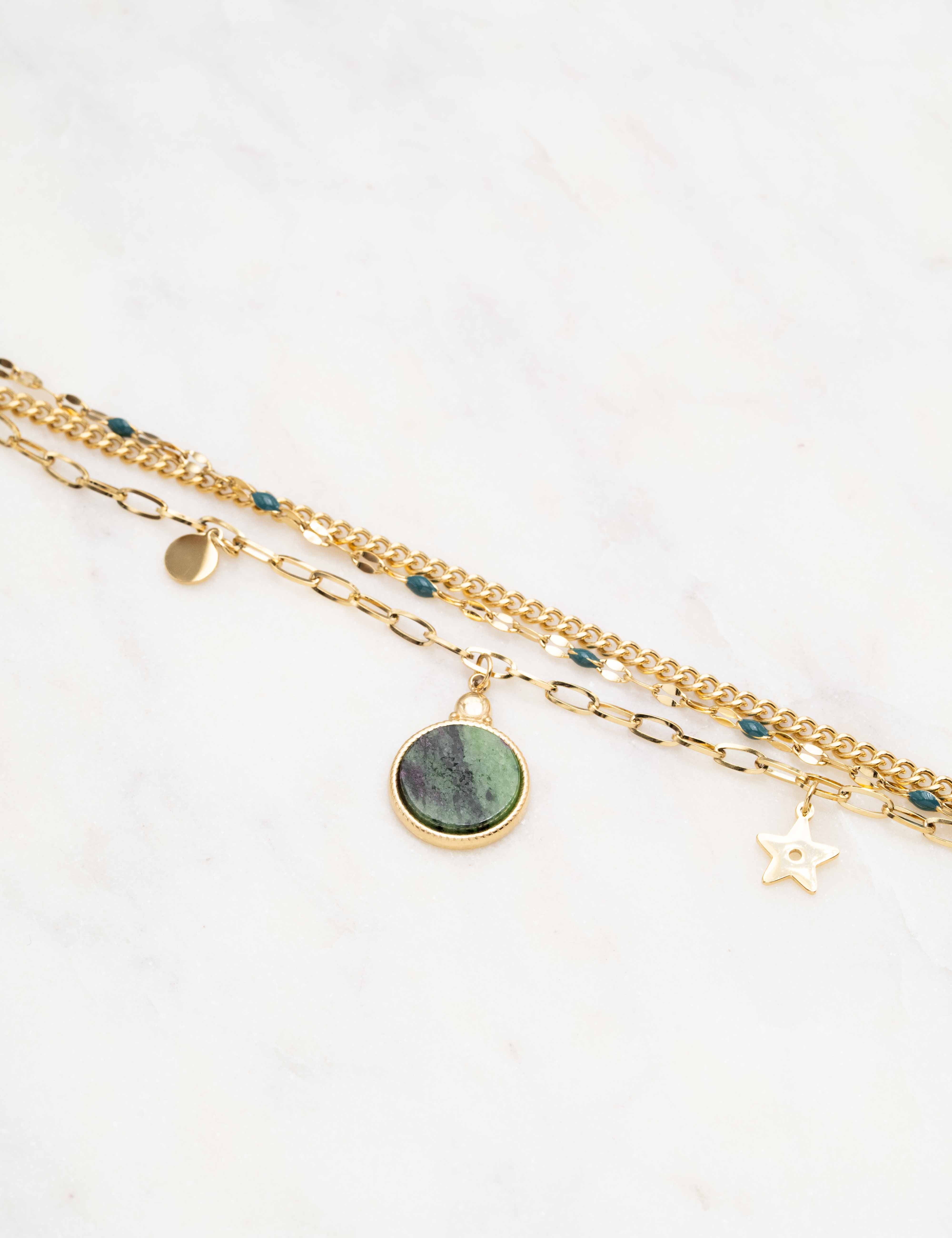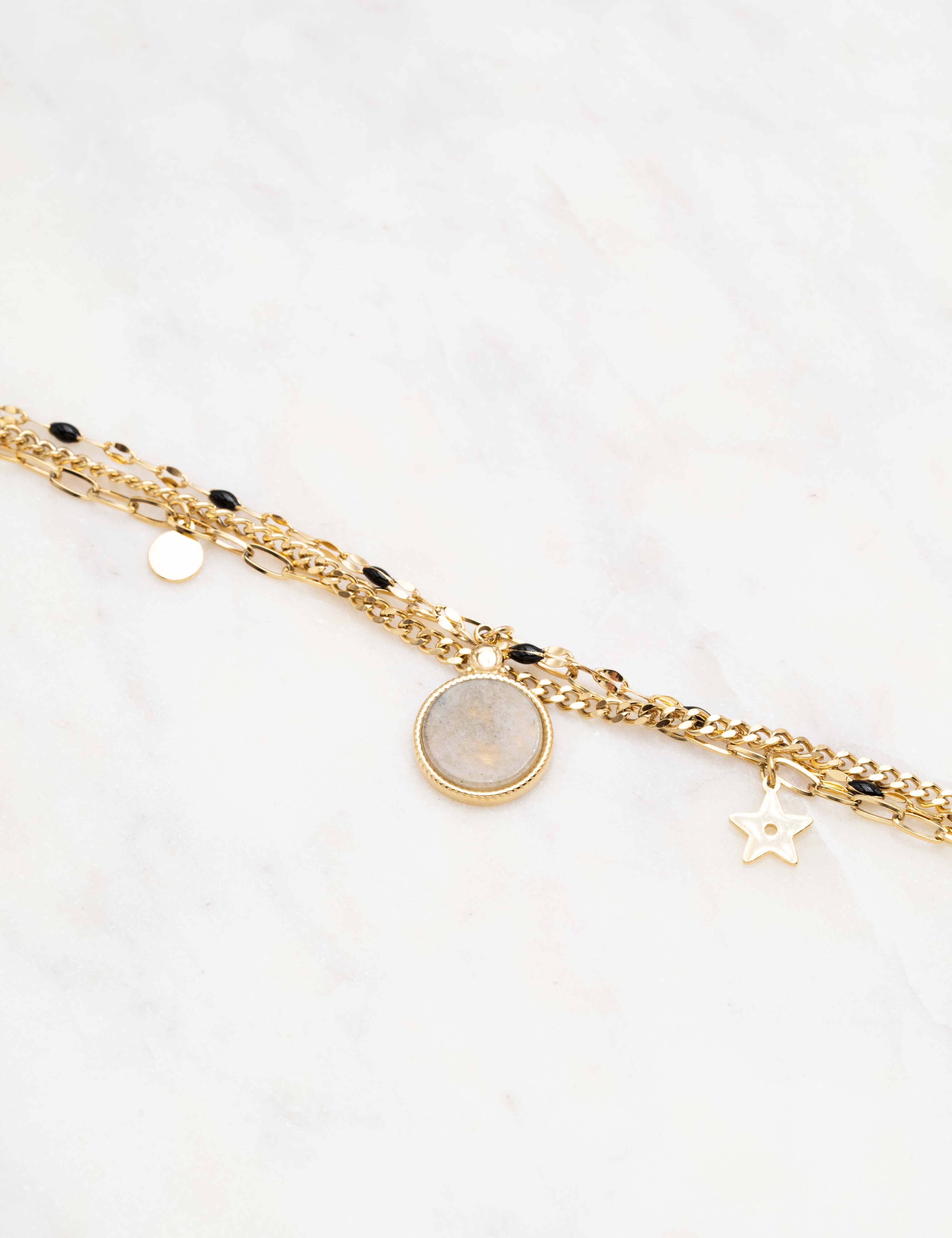 Bracelet réglable sur chaîne triple rangs avec maille composé de touches émaillées colorées, de 2 pampilles : ronde et étoile, et d'un pendentif rond orné d'une pierre naturelle.