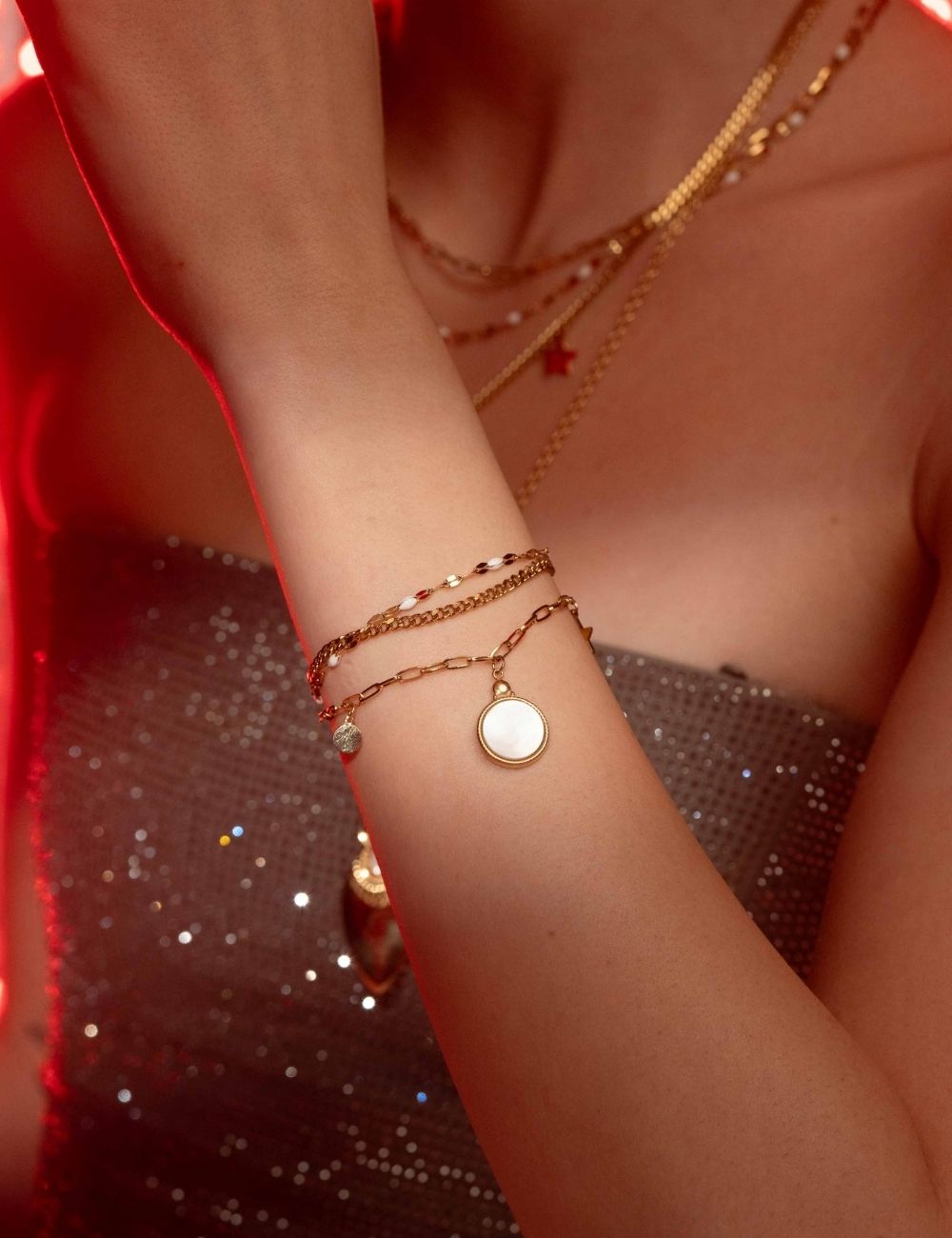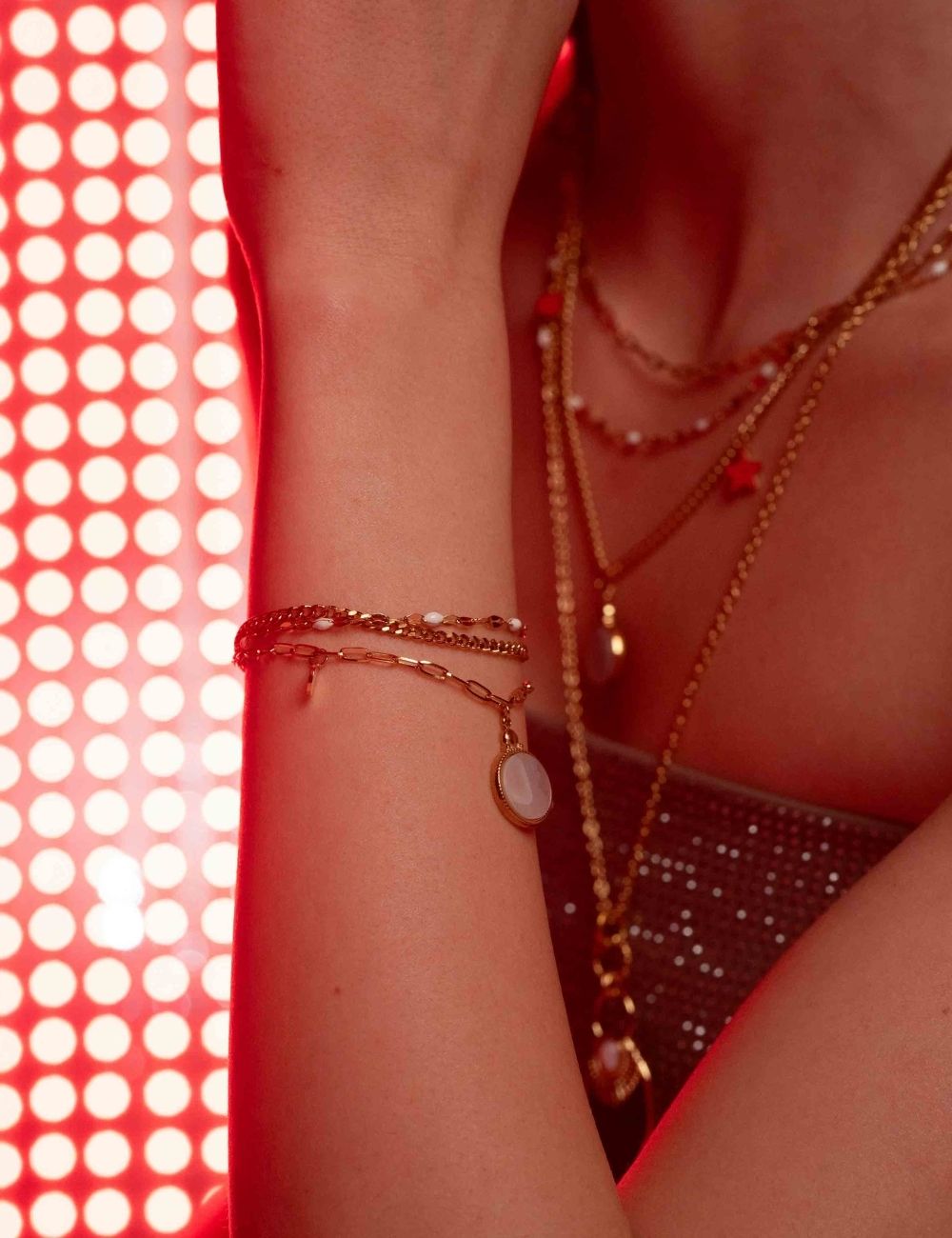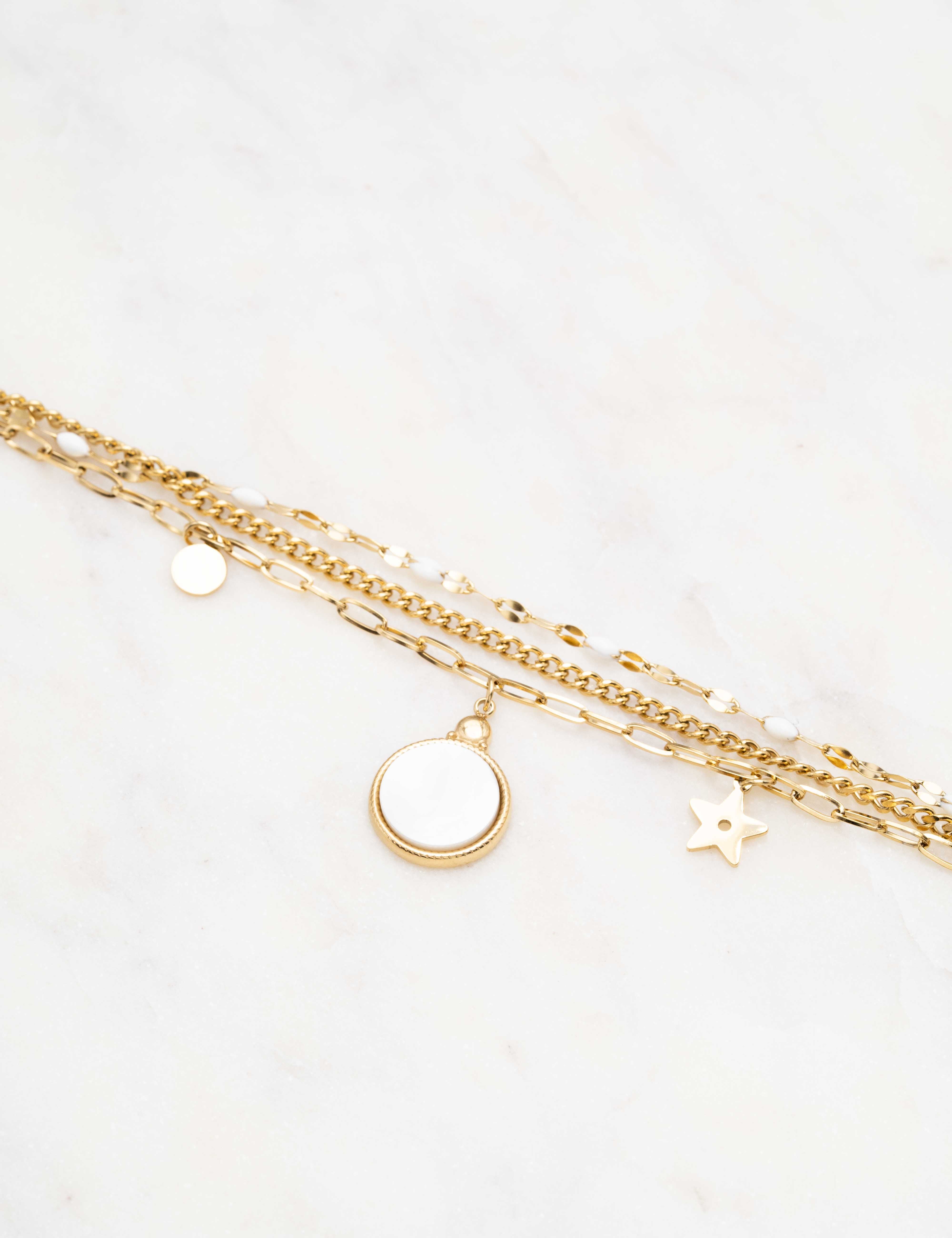 Bracelet réglable sur chaîne triple rangs avec maille composé de touches émaillées colorées, de 2 pampilles : ronde et étoile, et d'un pendentif rond orné d'une pierre naturelle.