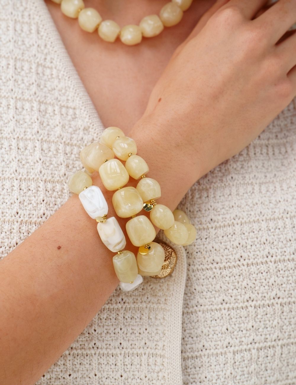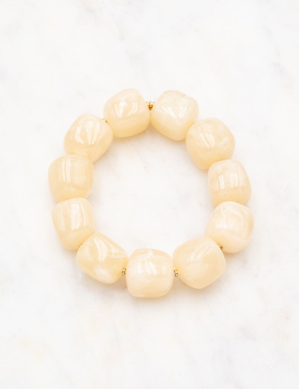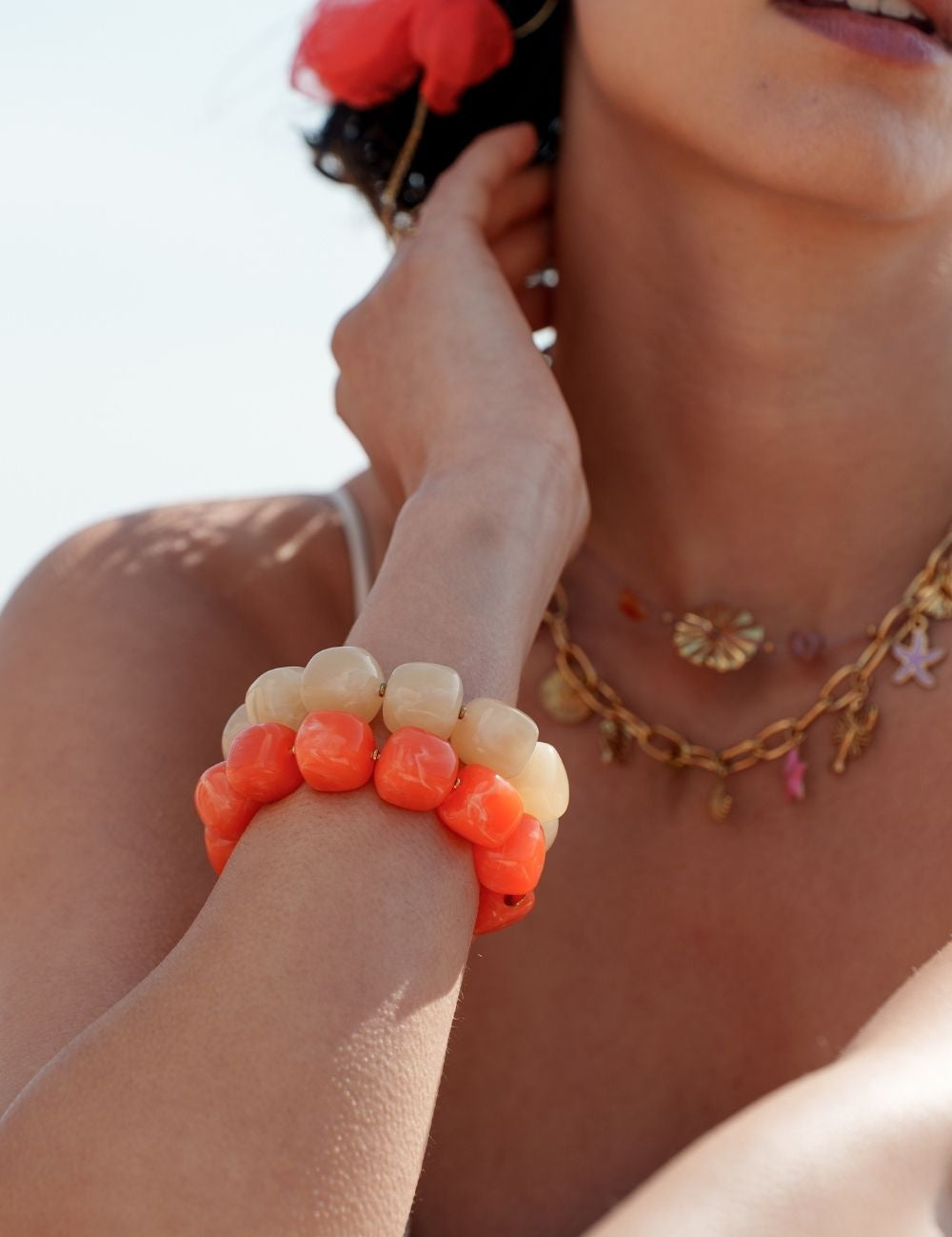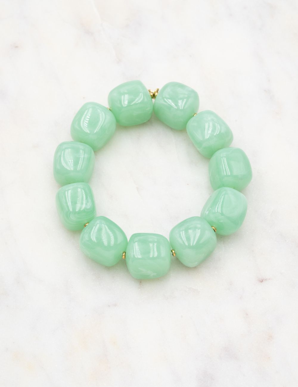 Bracelet élastique composé d'un enfilage de perles en résine colorée.