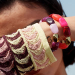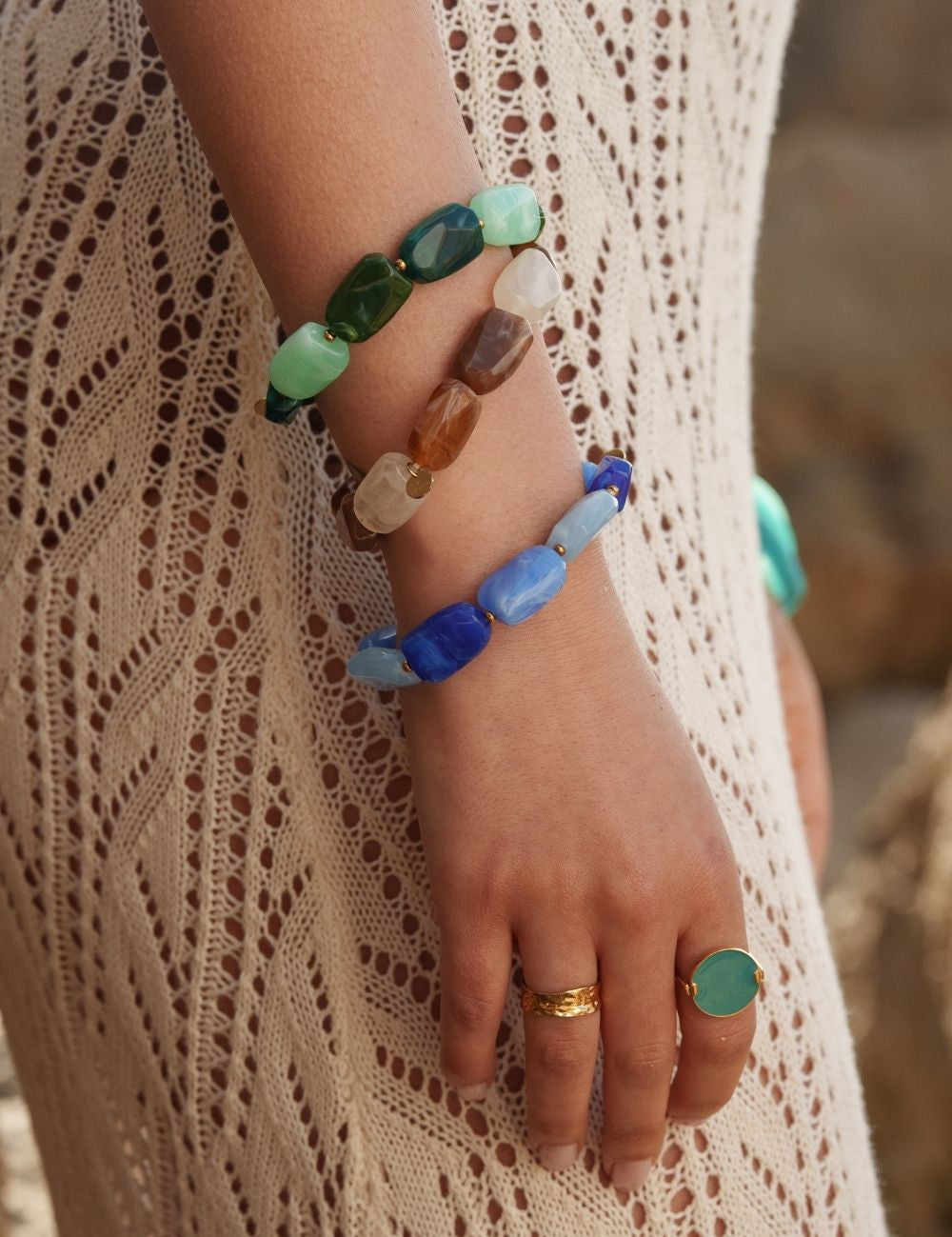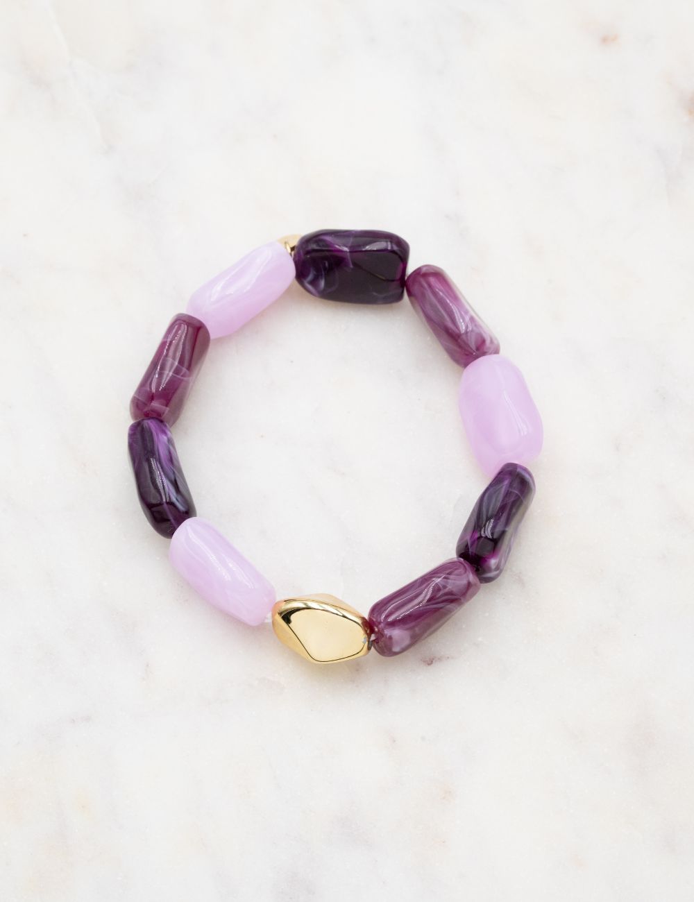 Bracelet élastique composé d'un enfilage de perles en résine colorée et une perle graphique dorée en acier inoxydable.