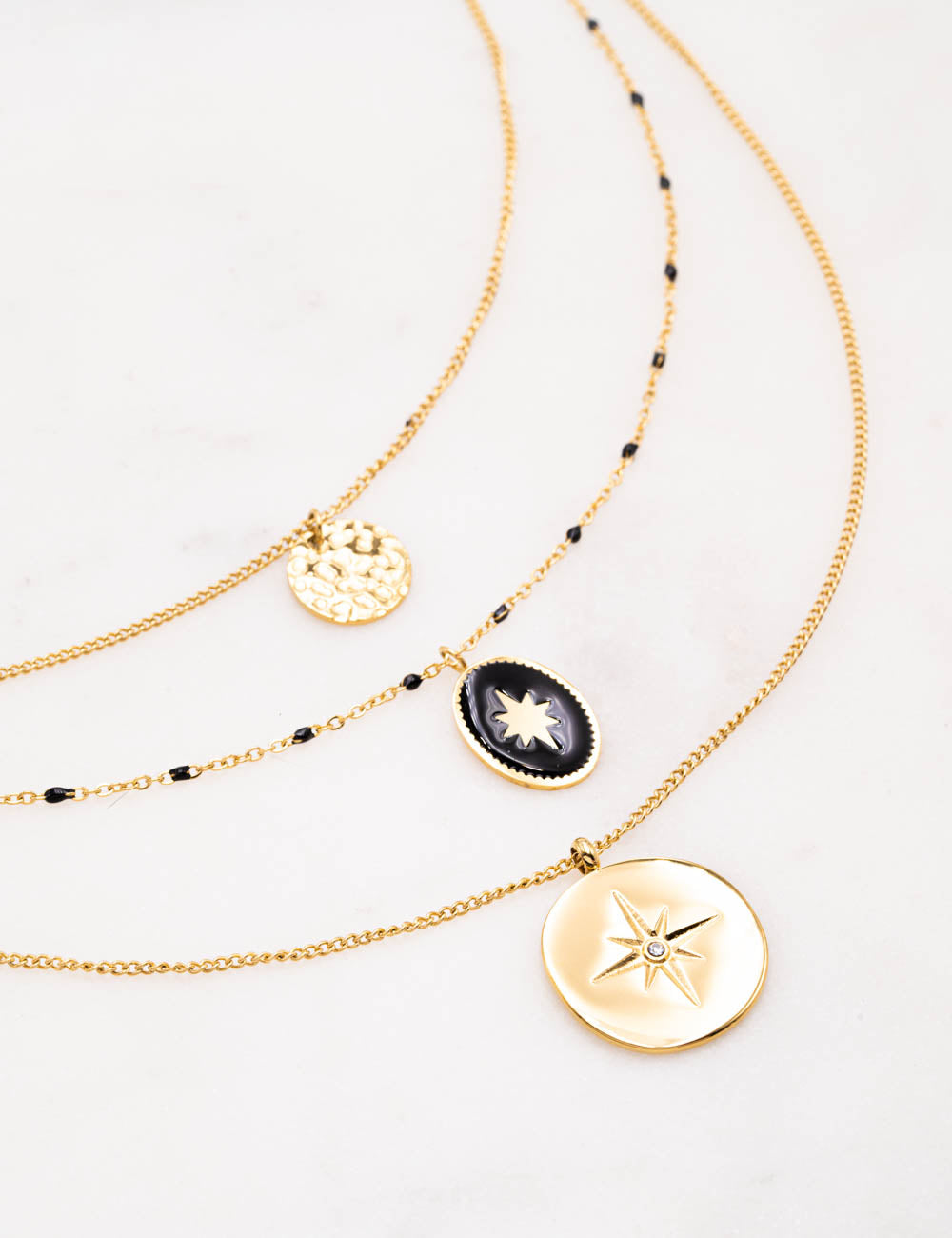 Collier réglable sur chaine 3 rangs orné d'une chaine avec touches émaillées, d'un pendant étoilé strassé et d'une pièce émaillée avec une étoile. Fermoir mousqueton et chainette de réglage.