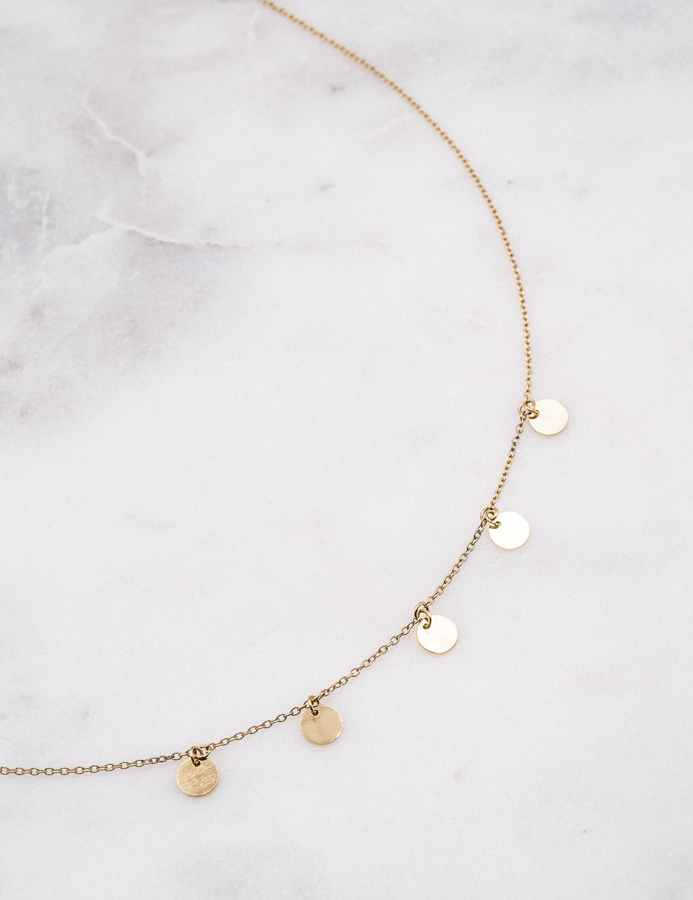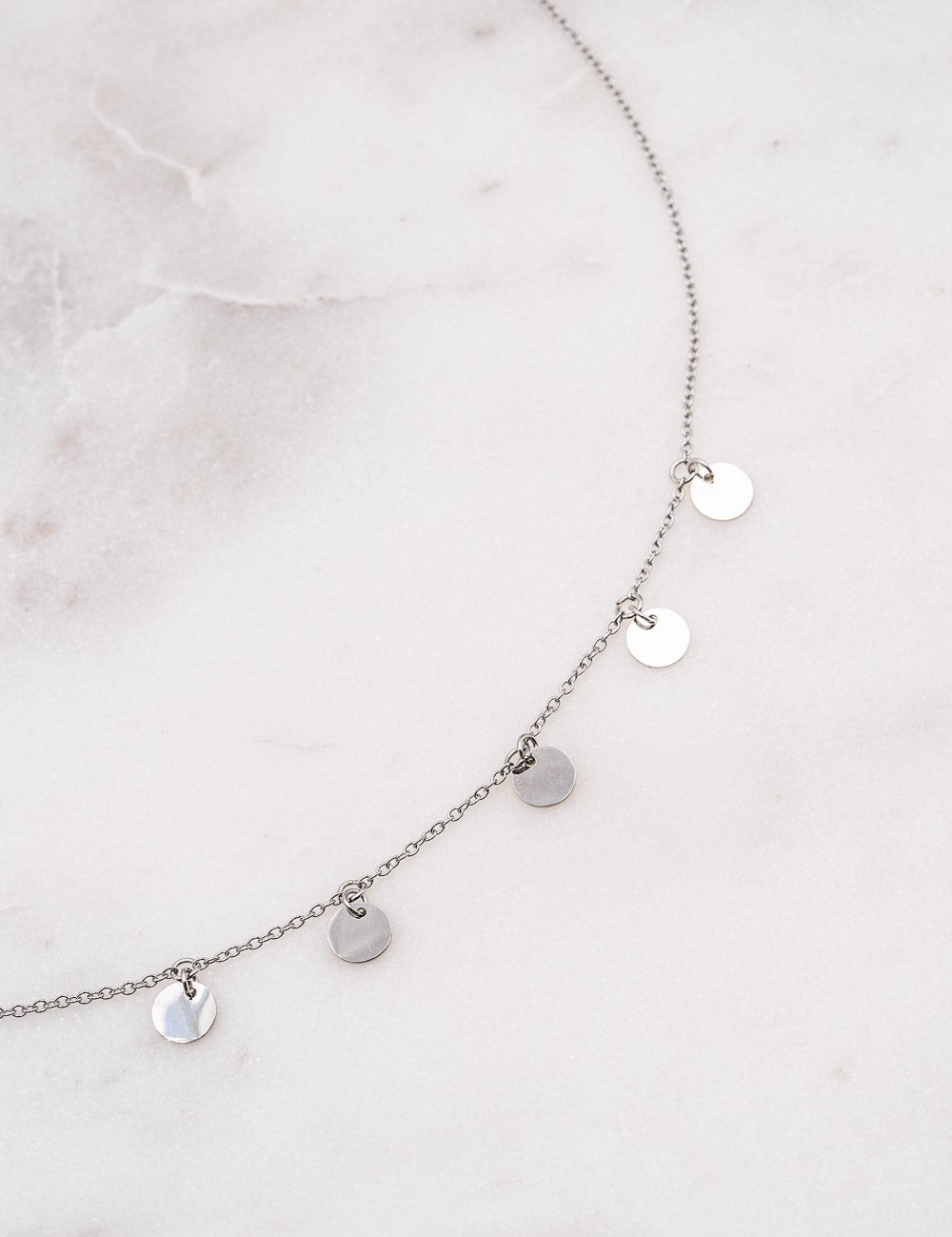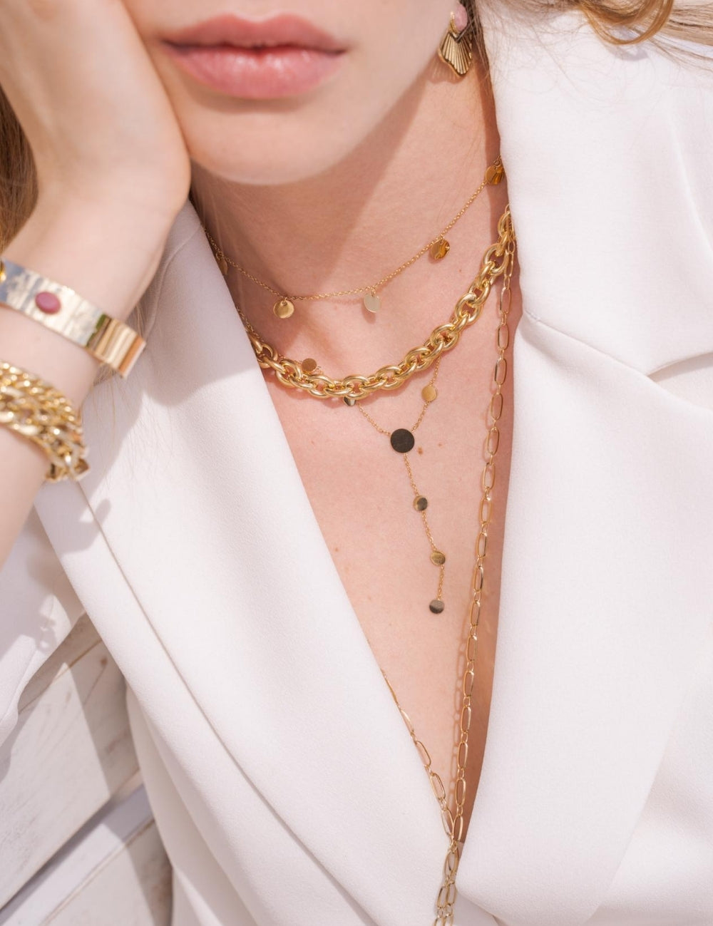 Collier sur chaîne composé de pampilles avec fermoir mousqueton et chaîne de réglage.
