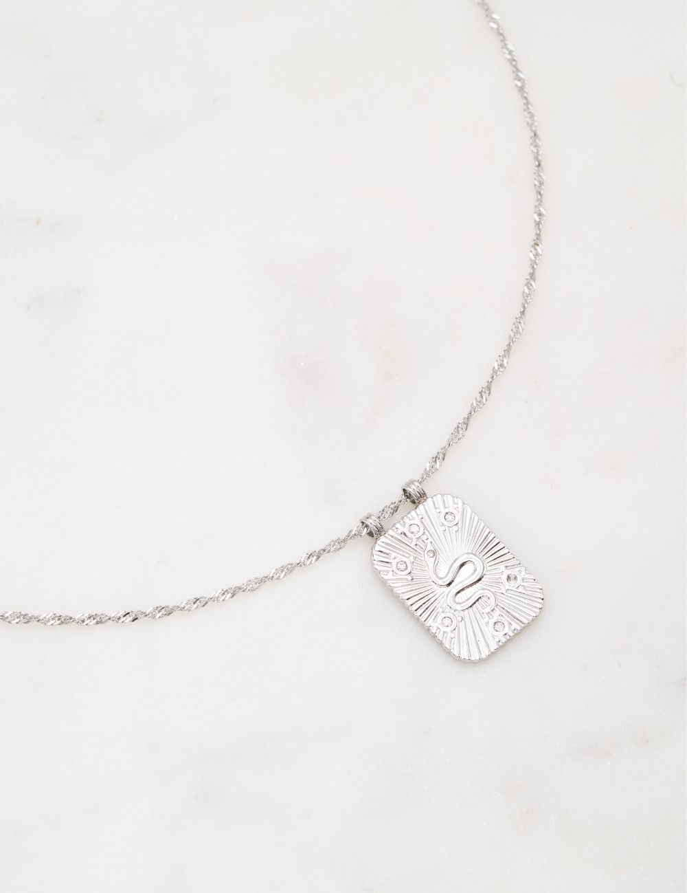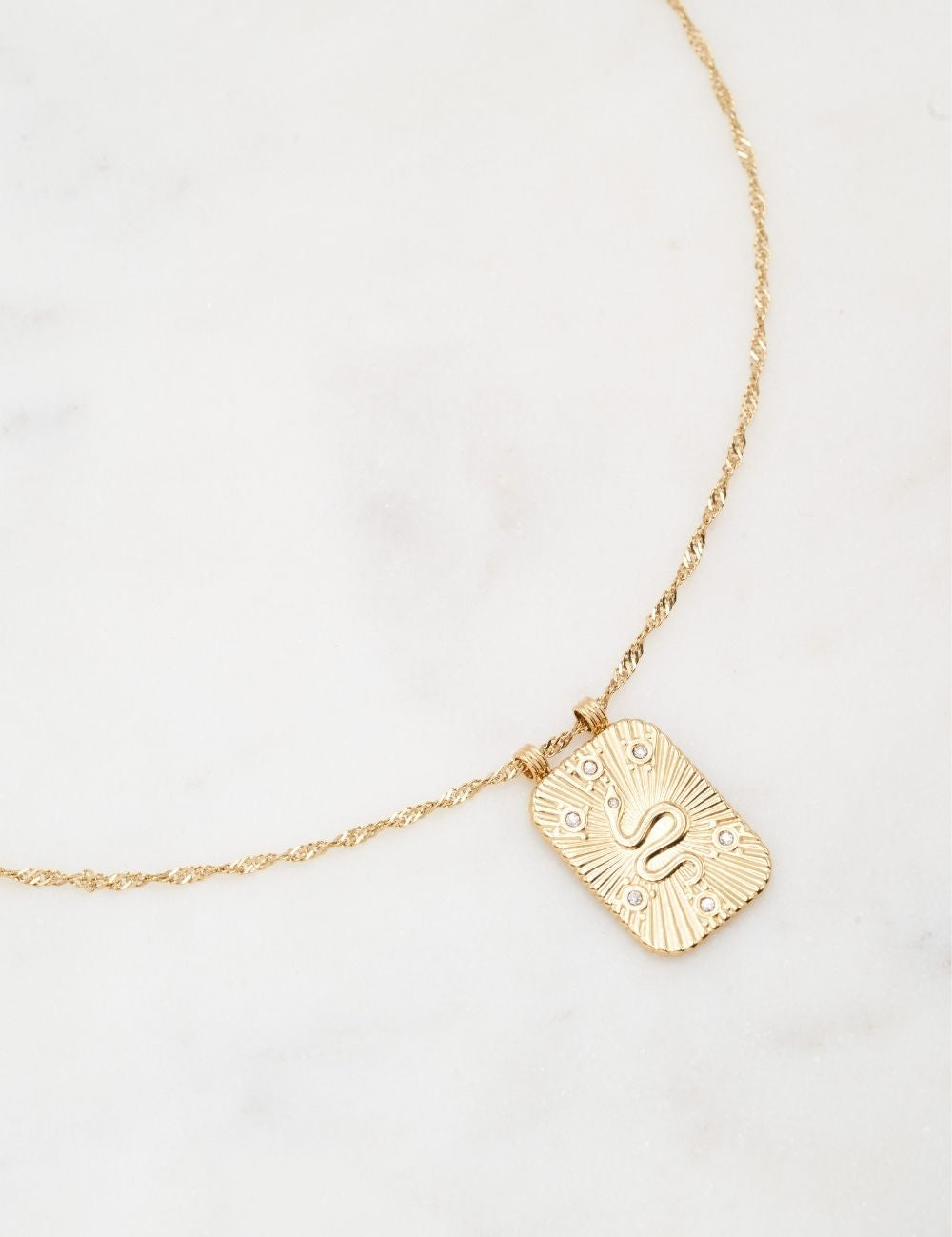 Collier sur chaine réglable avec un pendant texturé avec un motif de serpent gravé et serti de strass. Fermoir mousqueton et chainette de réglage.
