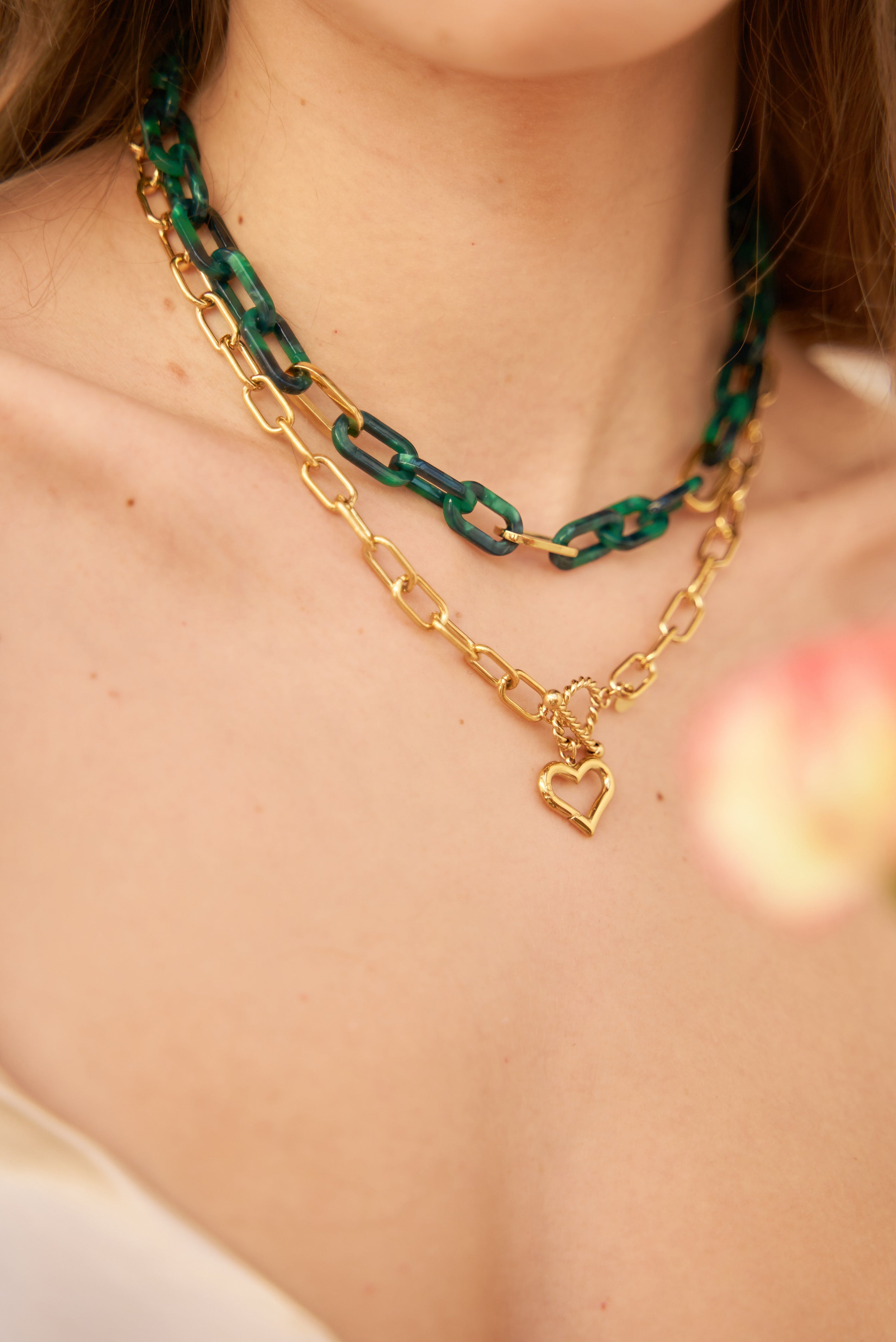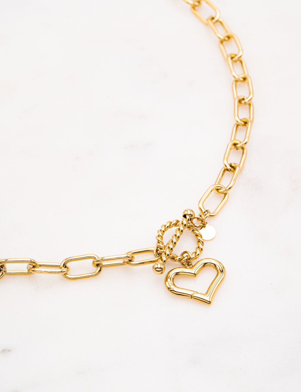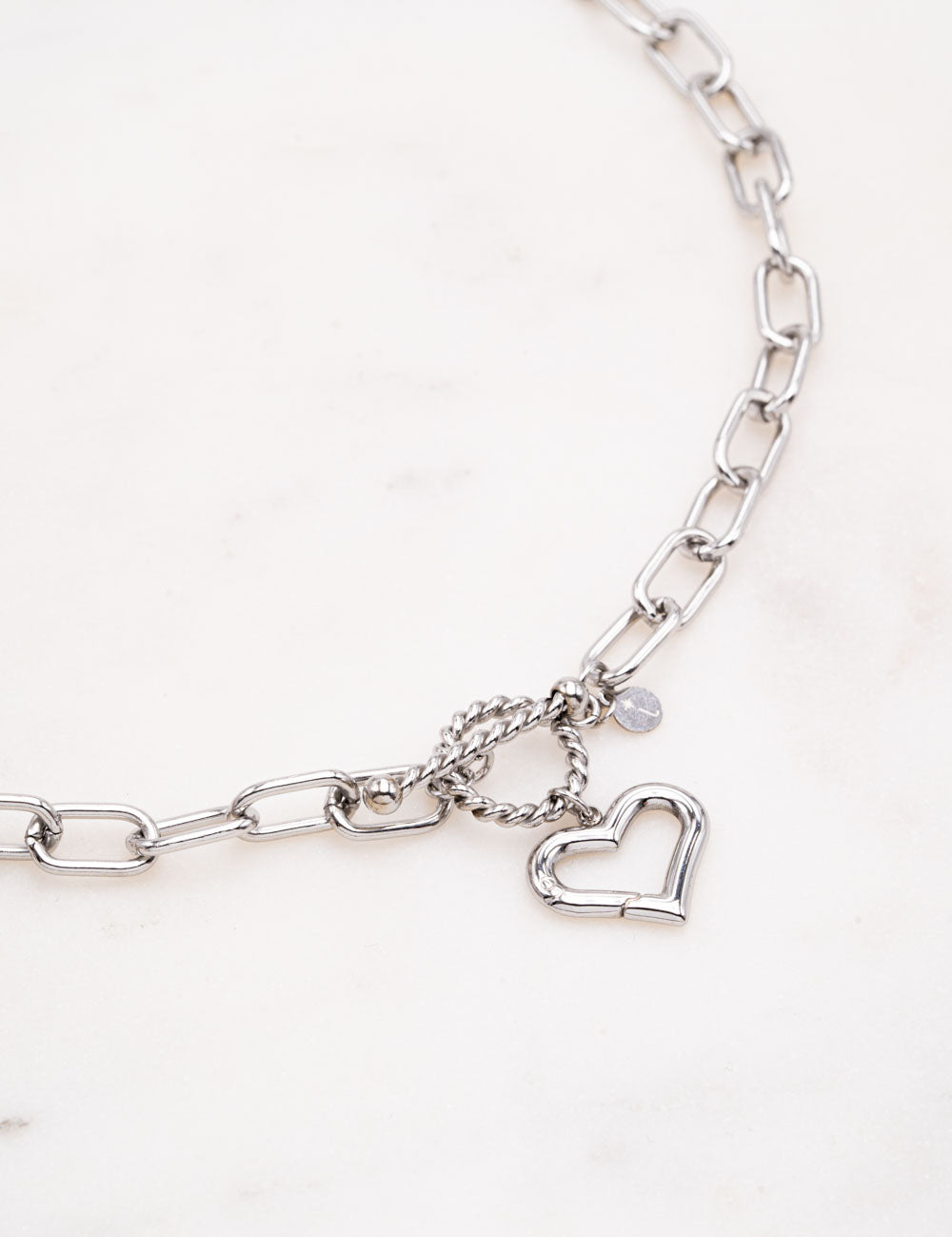 Collier sur chaine à maillons composé d'un pendant en forme de coeur. Fermoir  toggle (T) effet torsadé.