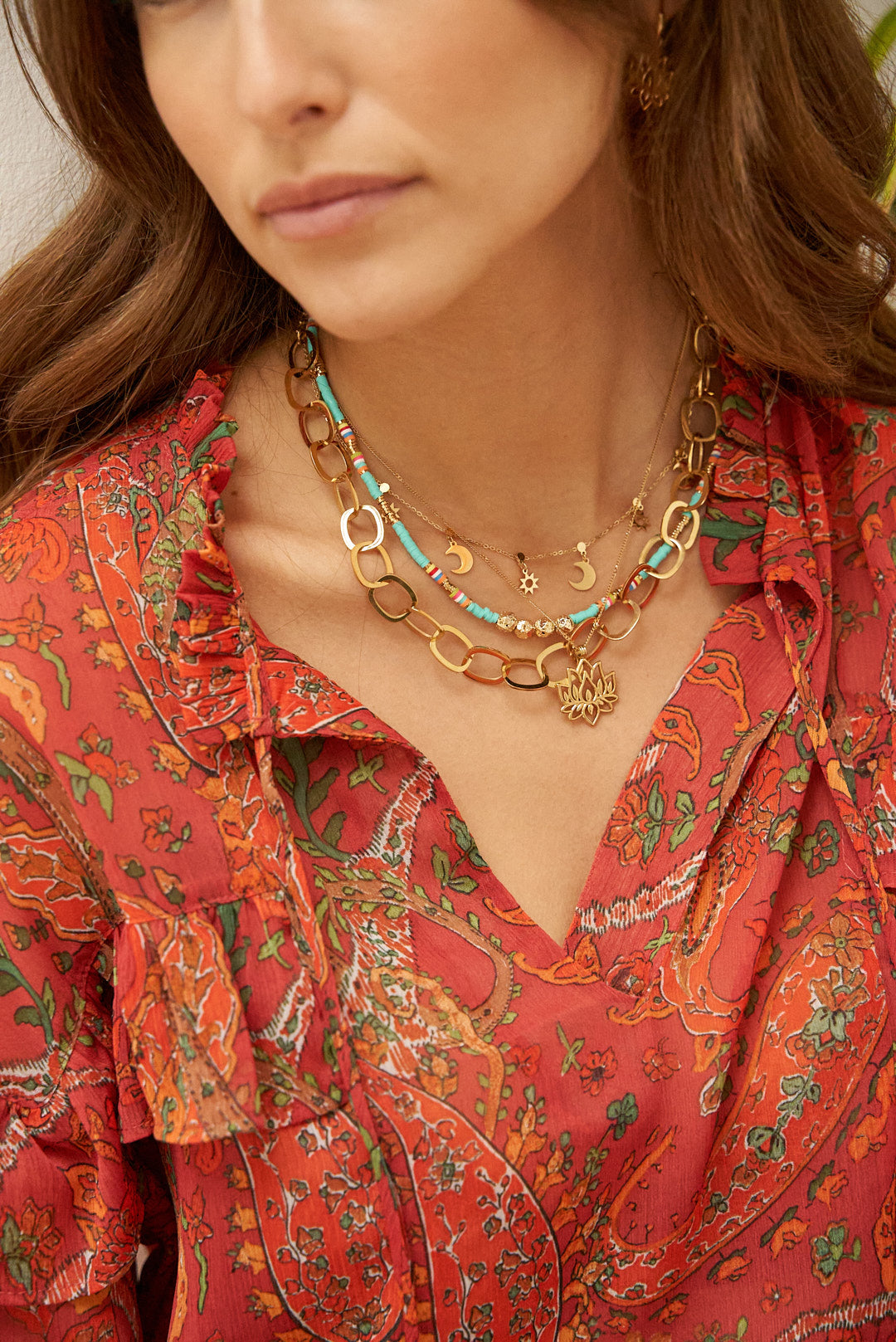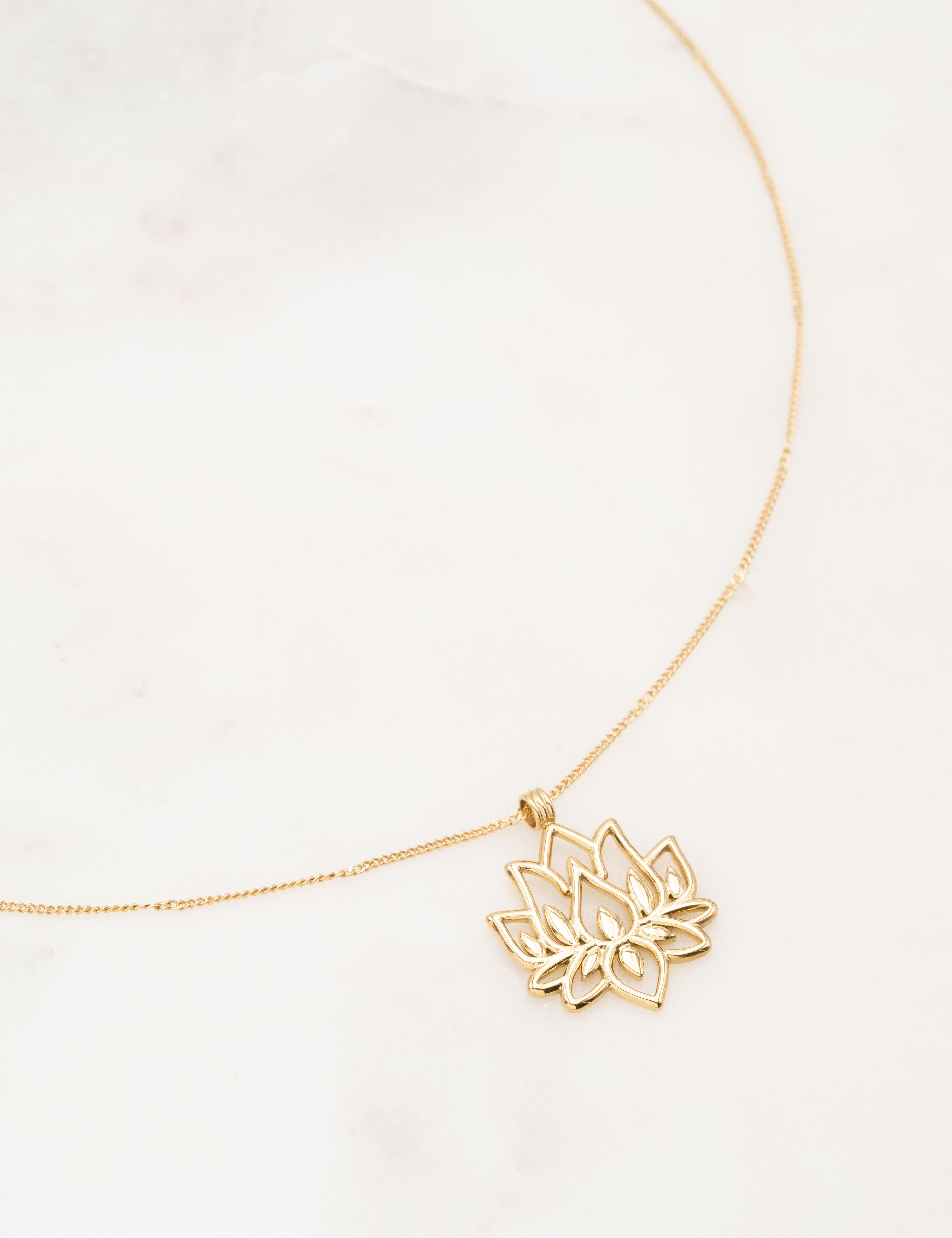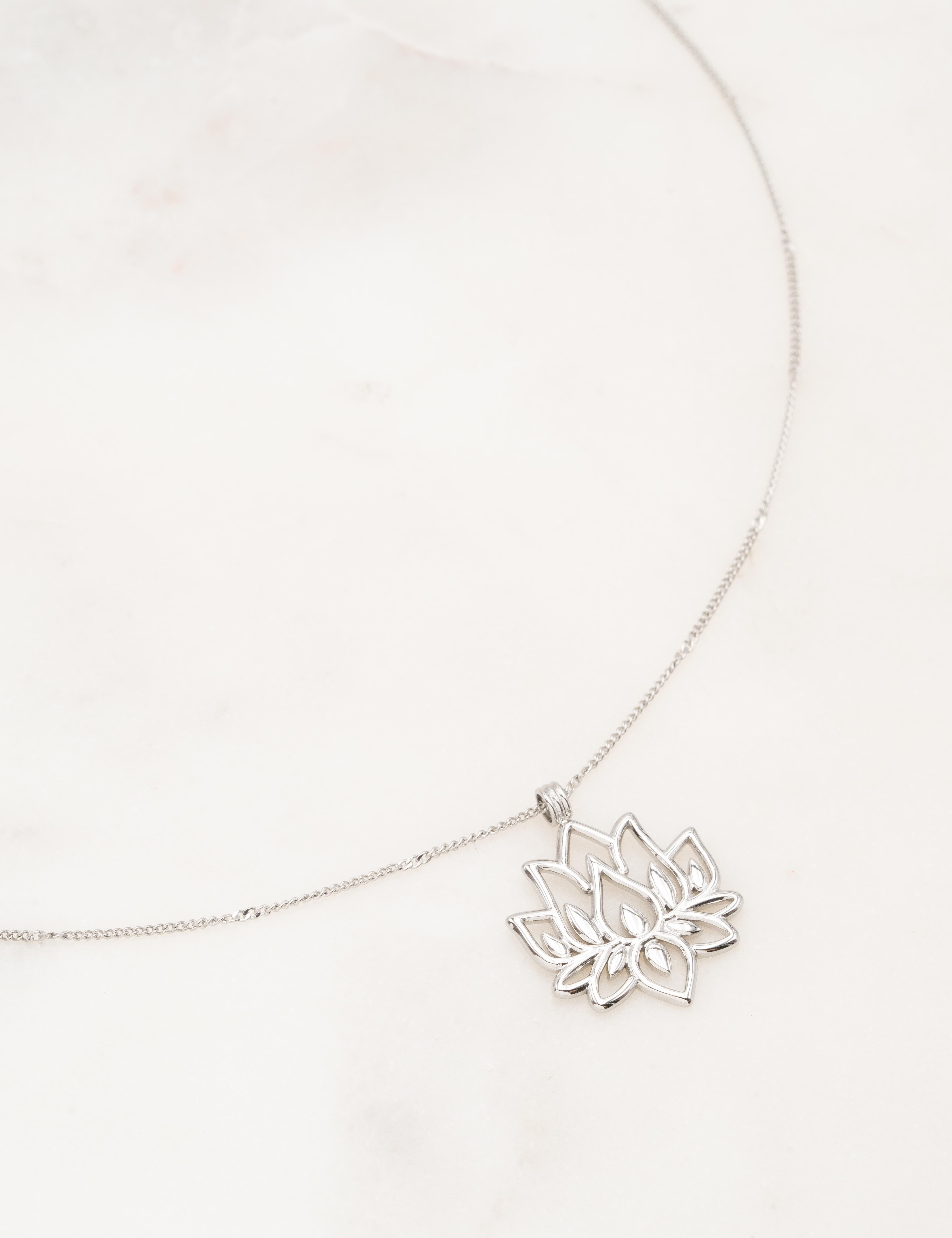 Collier sur chaine réglable composé d'un pendant graphique ajouré au motif fleur de lotus. Fermoir mousqueton et chainette de réglage