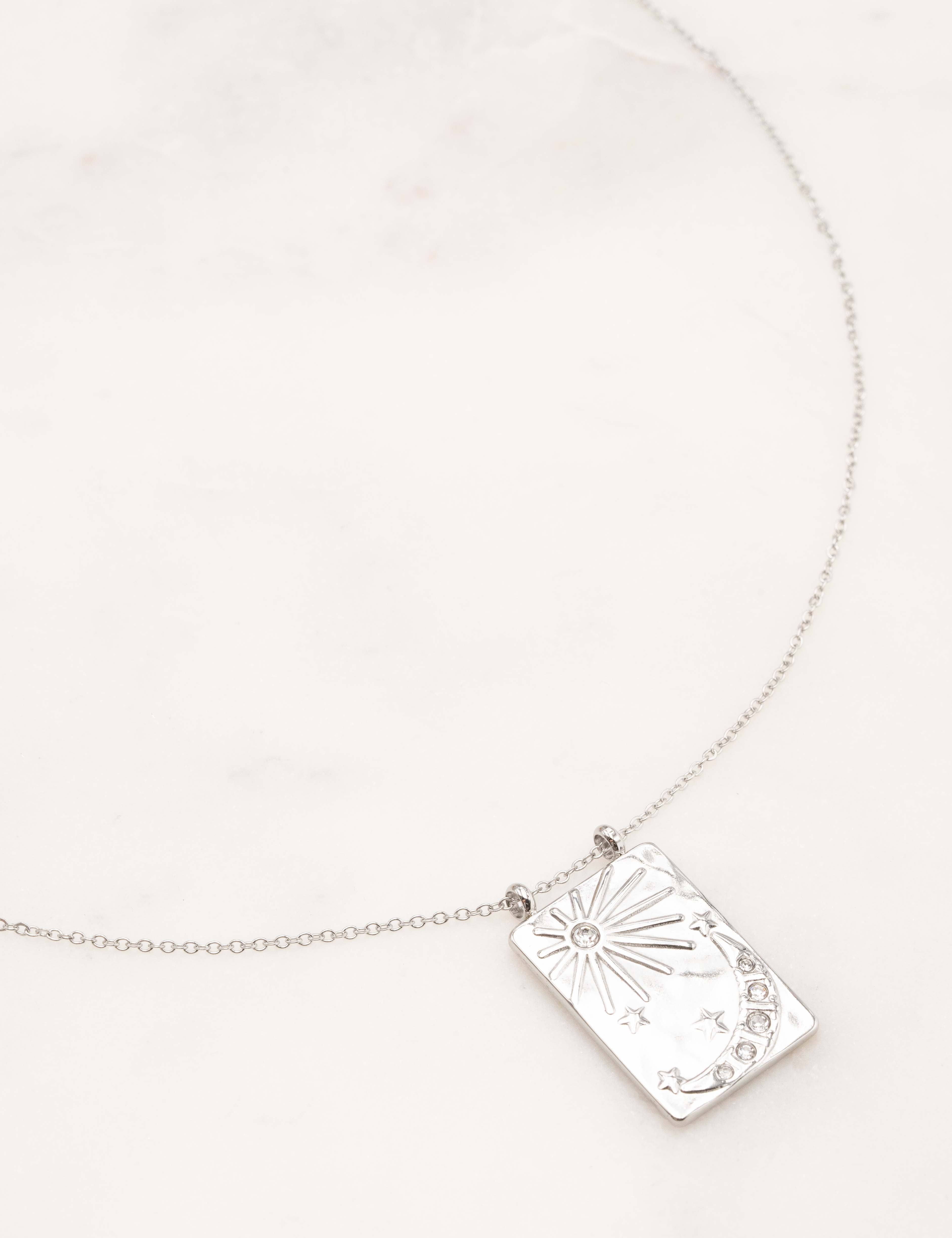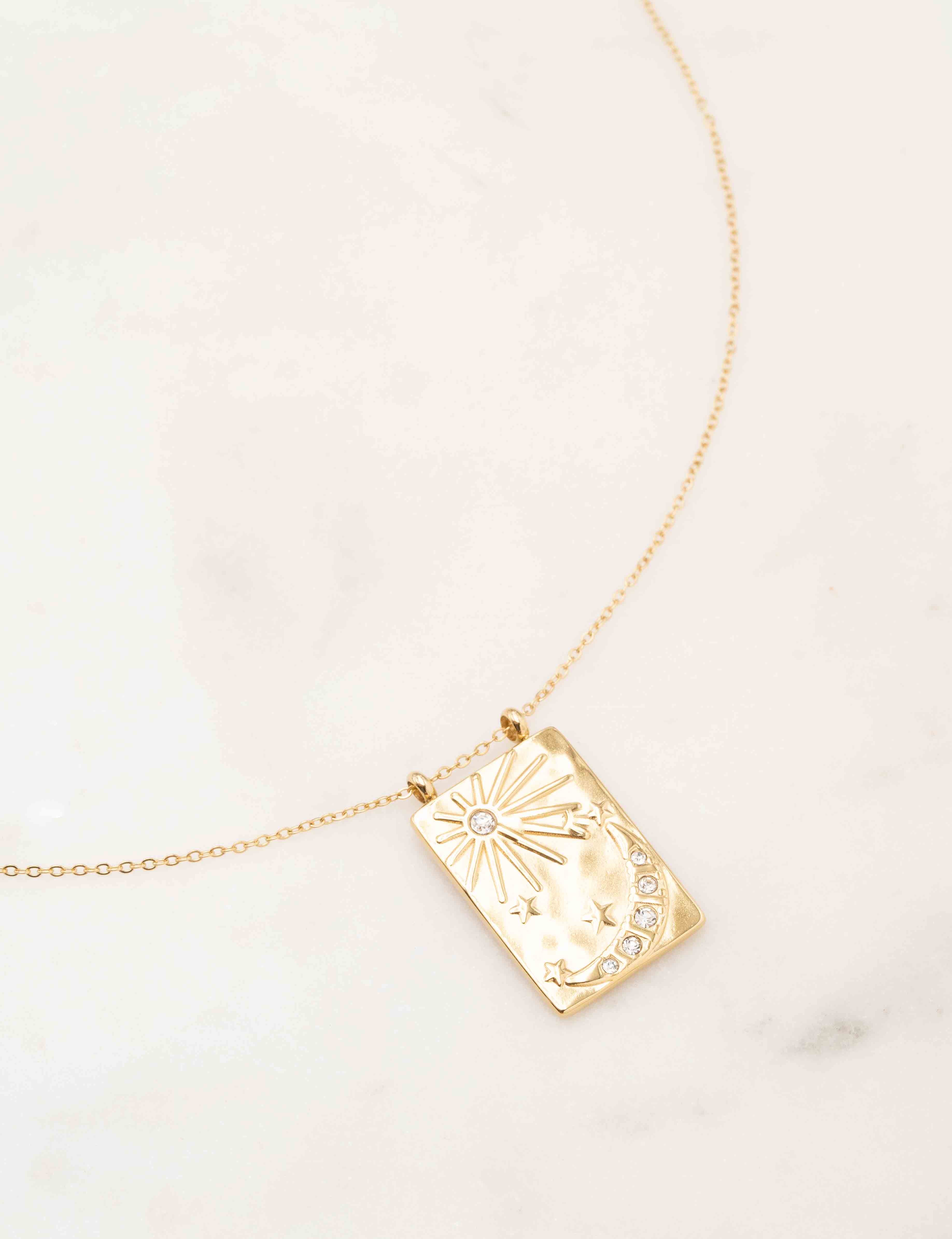 Collier réglable composé d'un pendant au motif étoilé et lunaire sertis de strass. Fermoir mousqueton et chainette de réglage.
