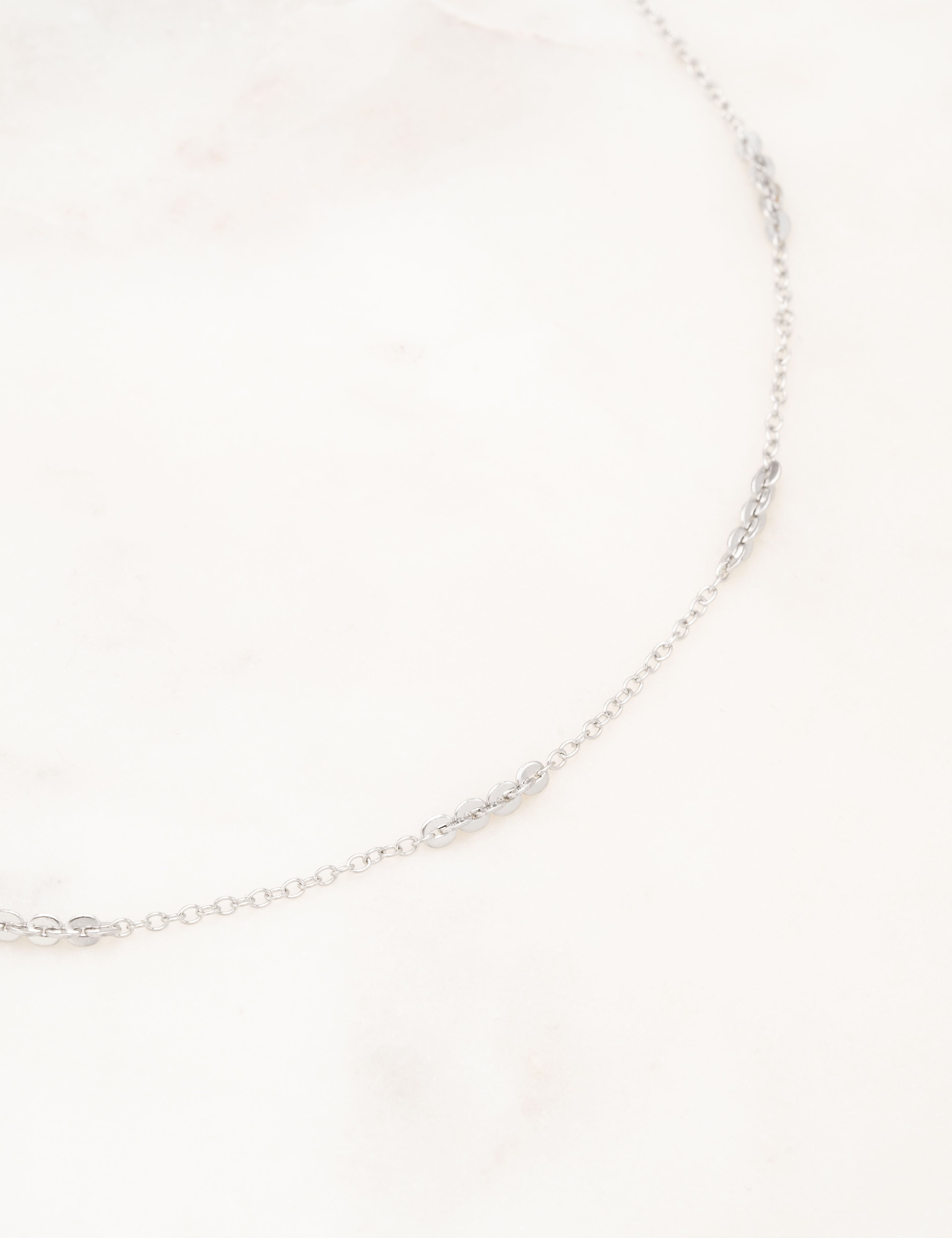 Collier type sautoir réglable sur chaine minimaliste avec un jeu d'empiècements de maillons graphiques. Fermoir mousqueton et chainette de réglage.