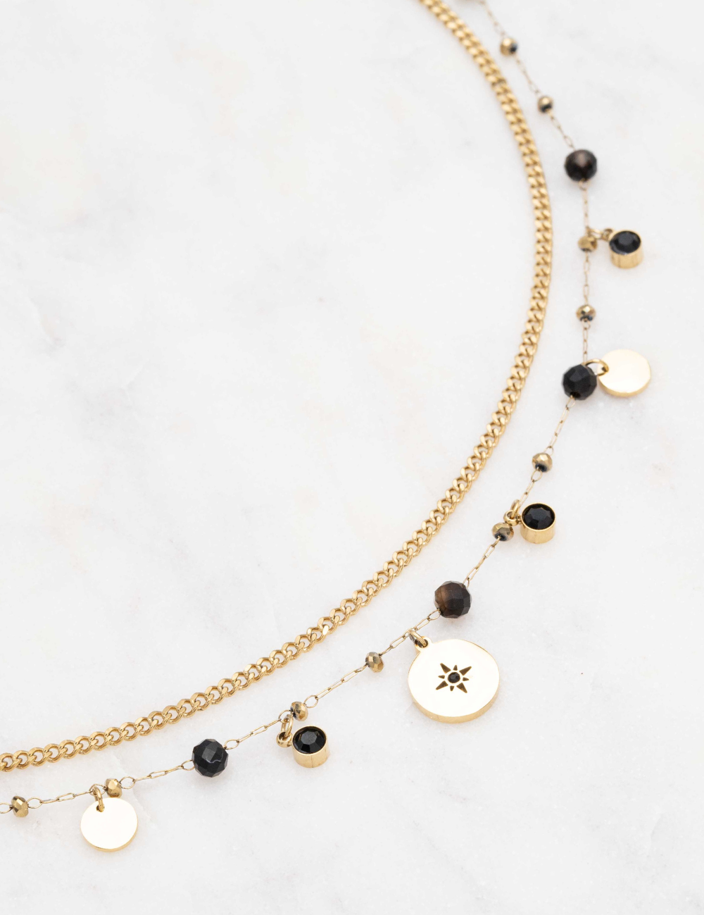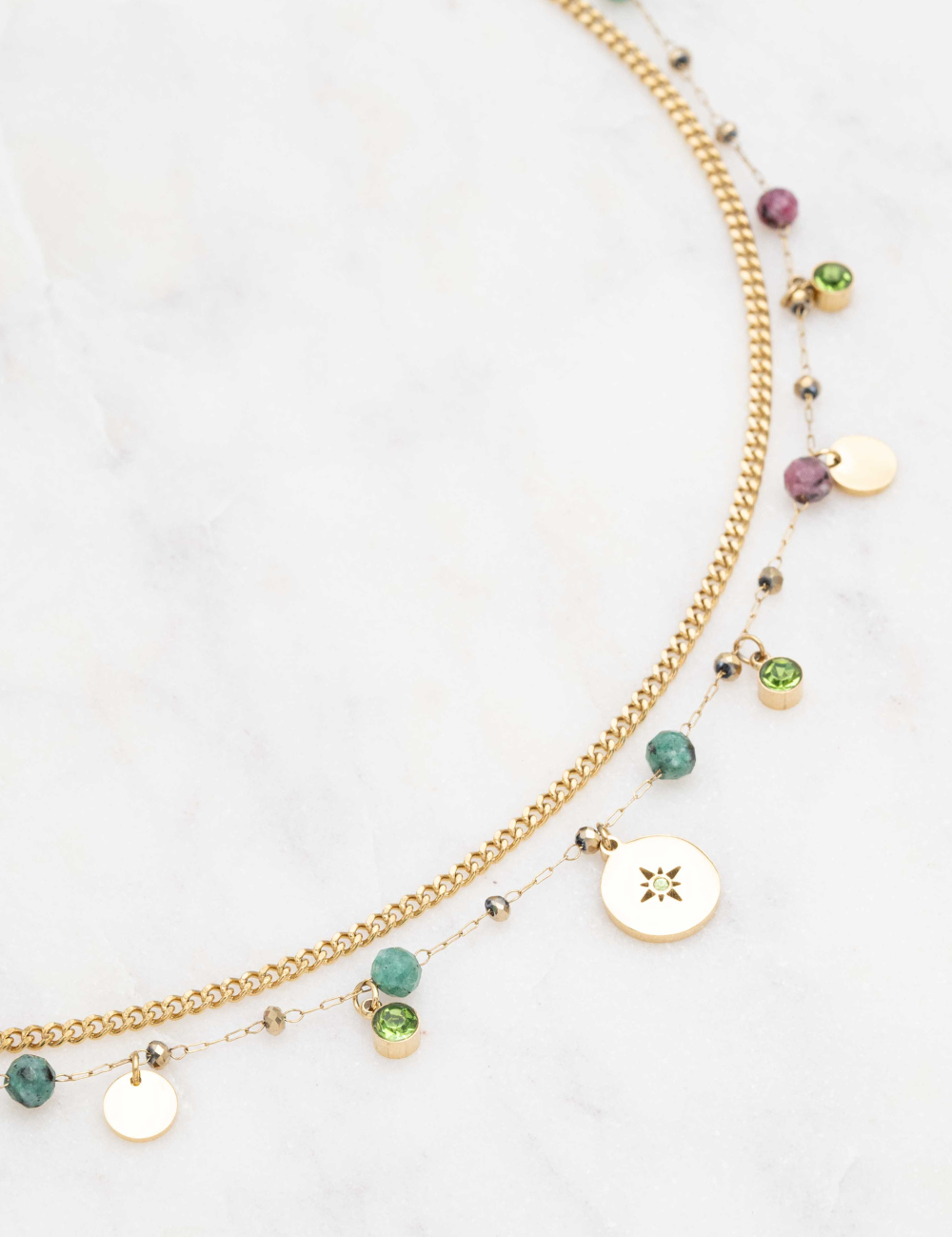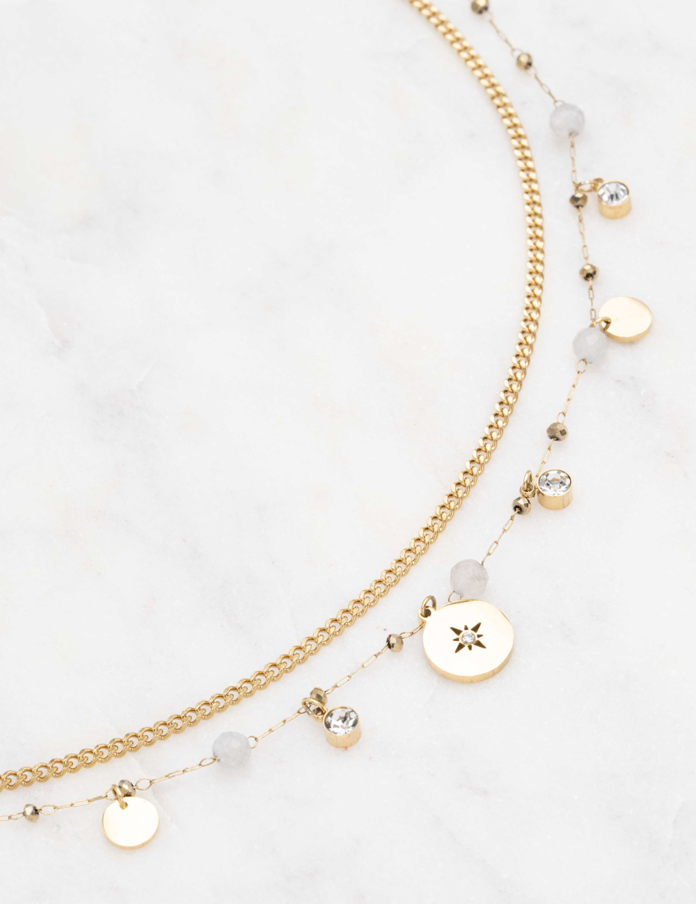 Collier réglable sur chaîne double rangs composé d'une chaine maille et une chaine ornée de pampilles rondes, de strass et de perles en pierres naturelles.
