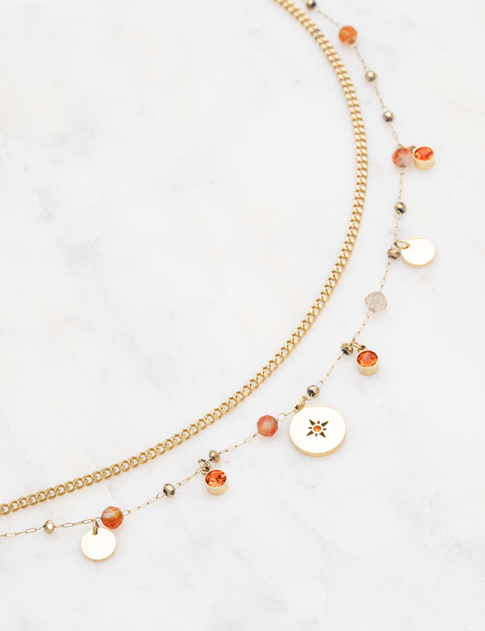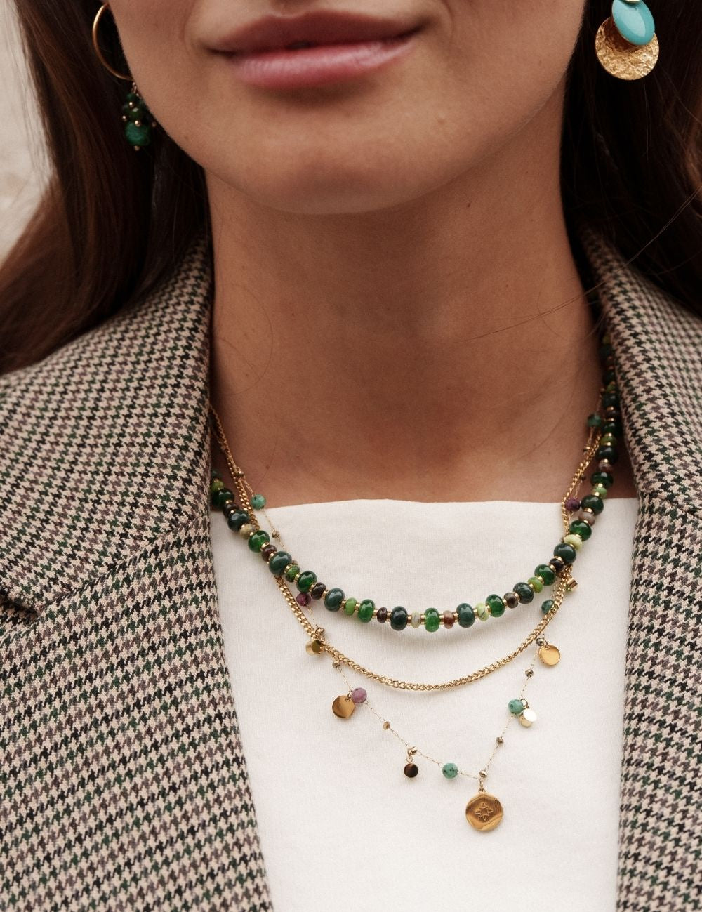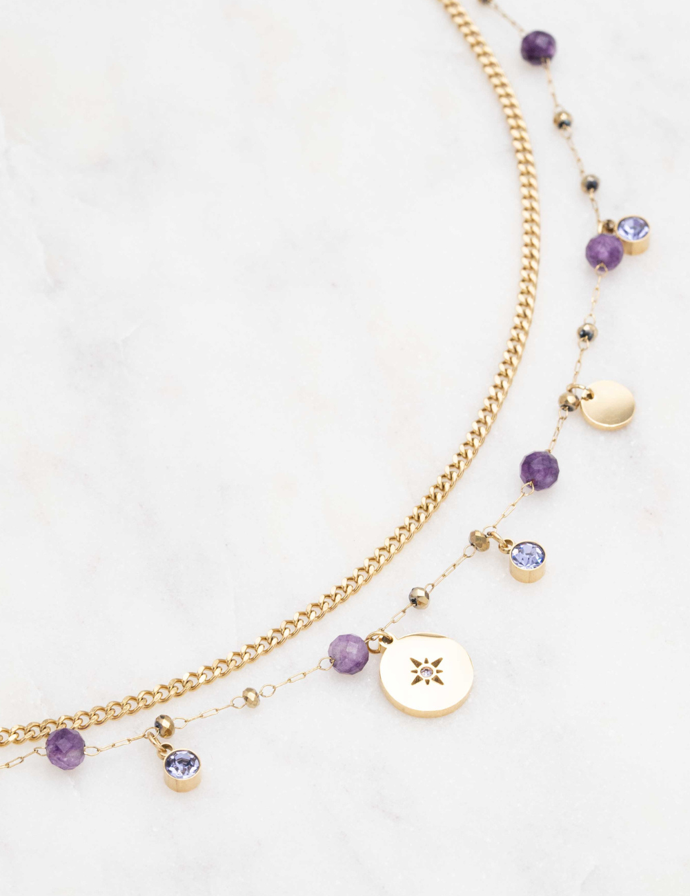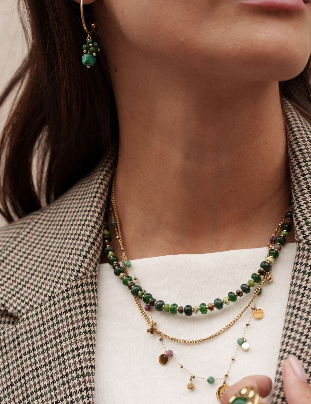 Collier réglable sur chaîne double rangs composé d'une chaine maille et une chaine ornée de pampilles rondes, de strass et de perles en pierres naturelles.