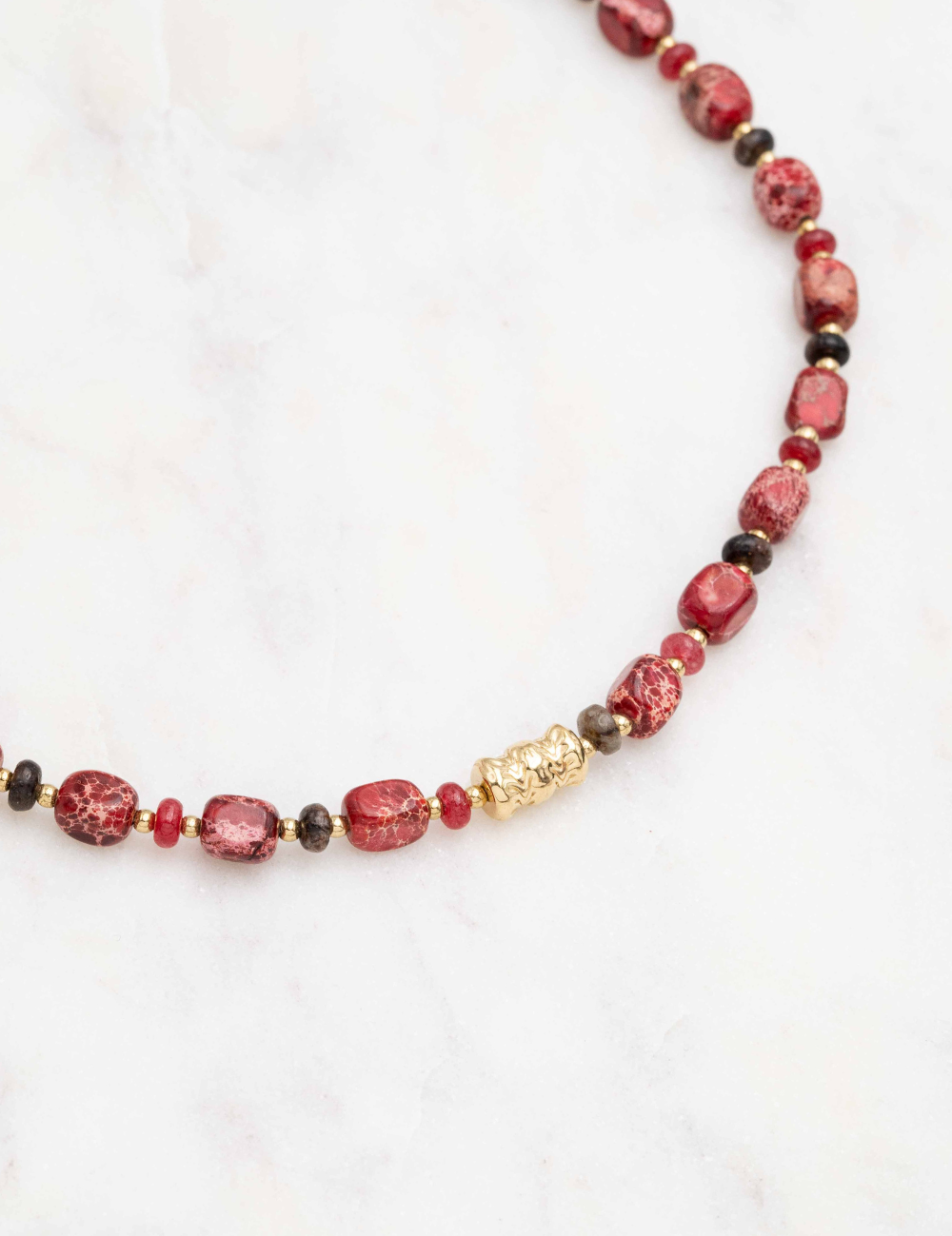 • Les pierres naturelles utilisées: Howlite, Agate teintée, Oeil de tigre, Labradorite, Cornaline, Jaspe impérial.