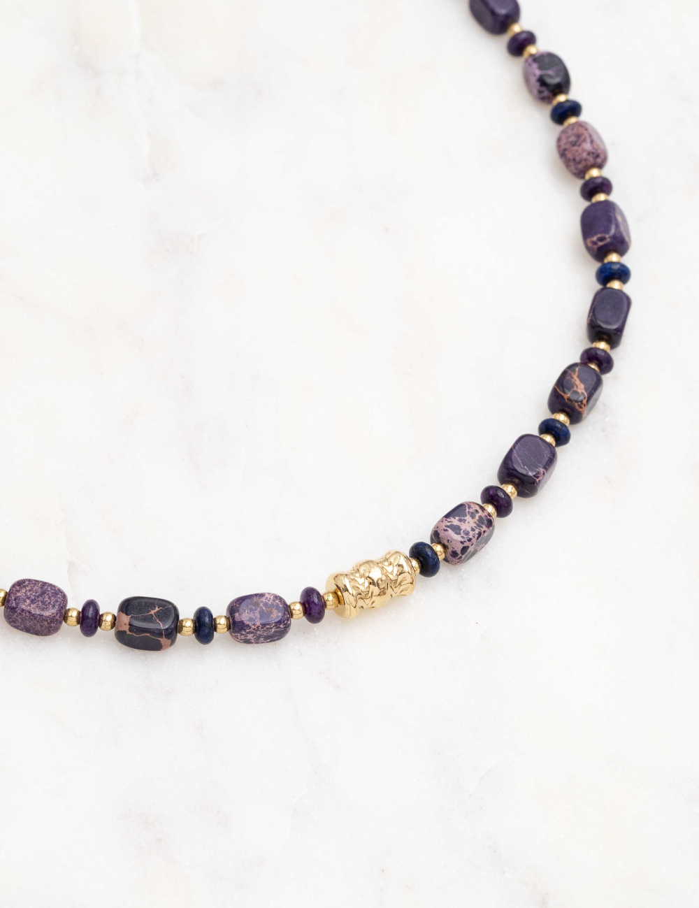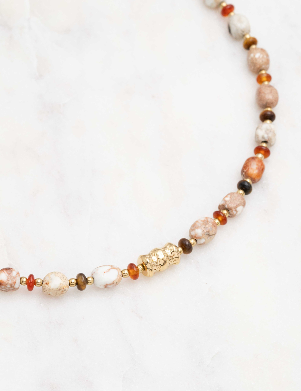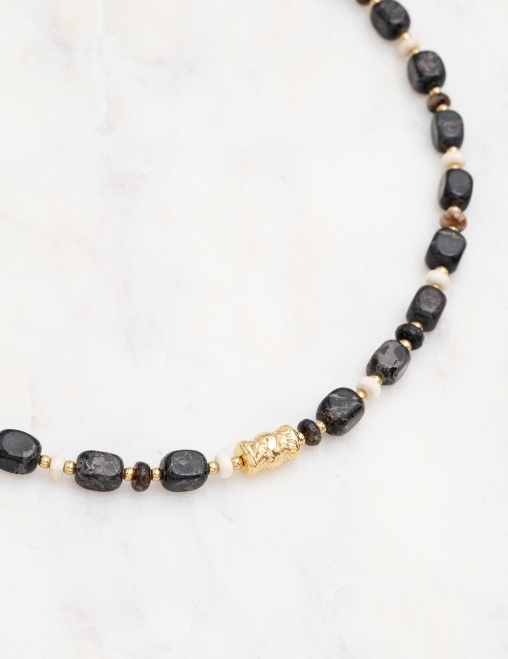 Collier réglable composé d'un joli enfilage de petites perles en acier, perle dorée martelée et pierres naturelles mélangées.