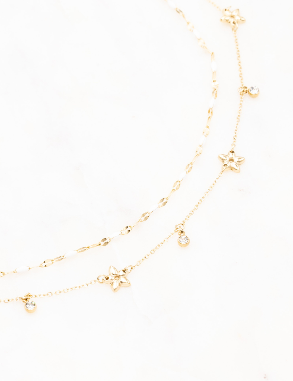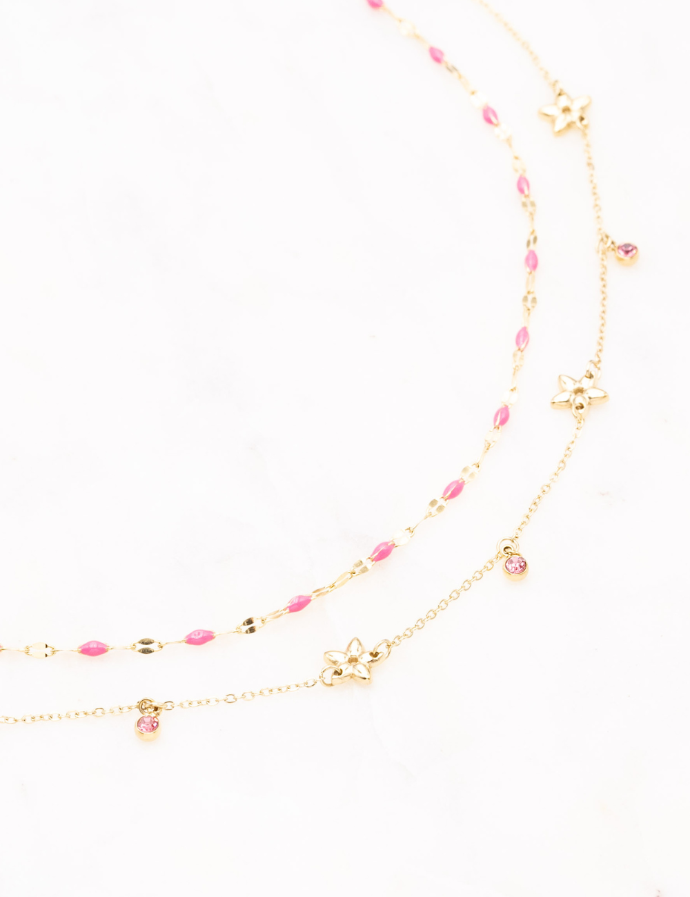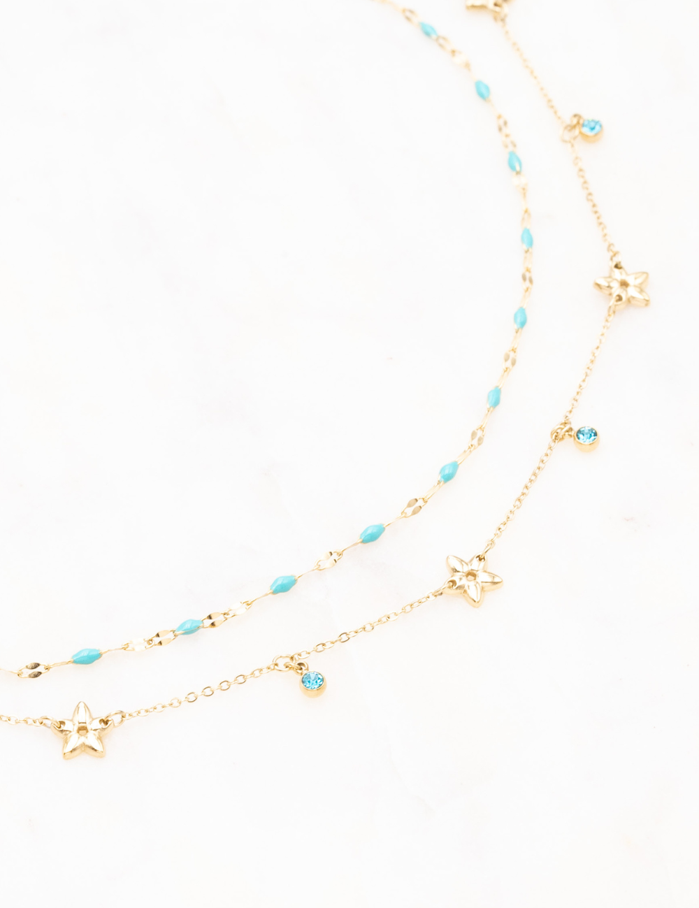 Collier réglable sur chaine double rangs composé de touches émaillées colorées, de pampilles étoilées et de pampilles rondes serties d'un strass.