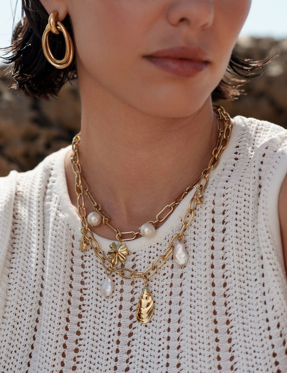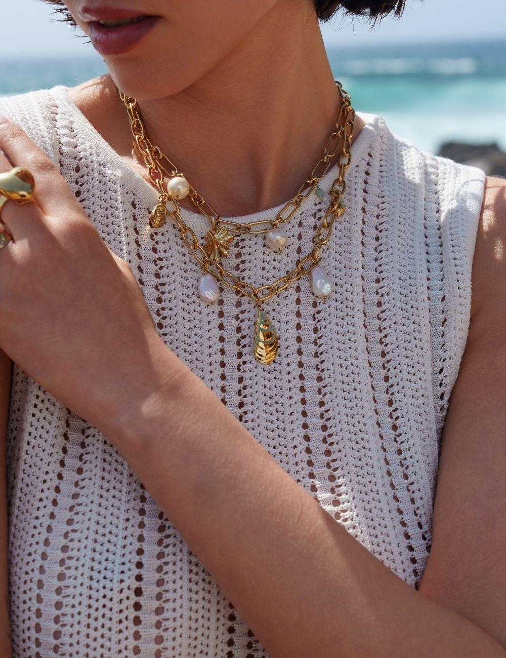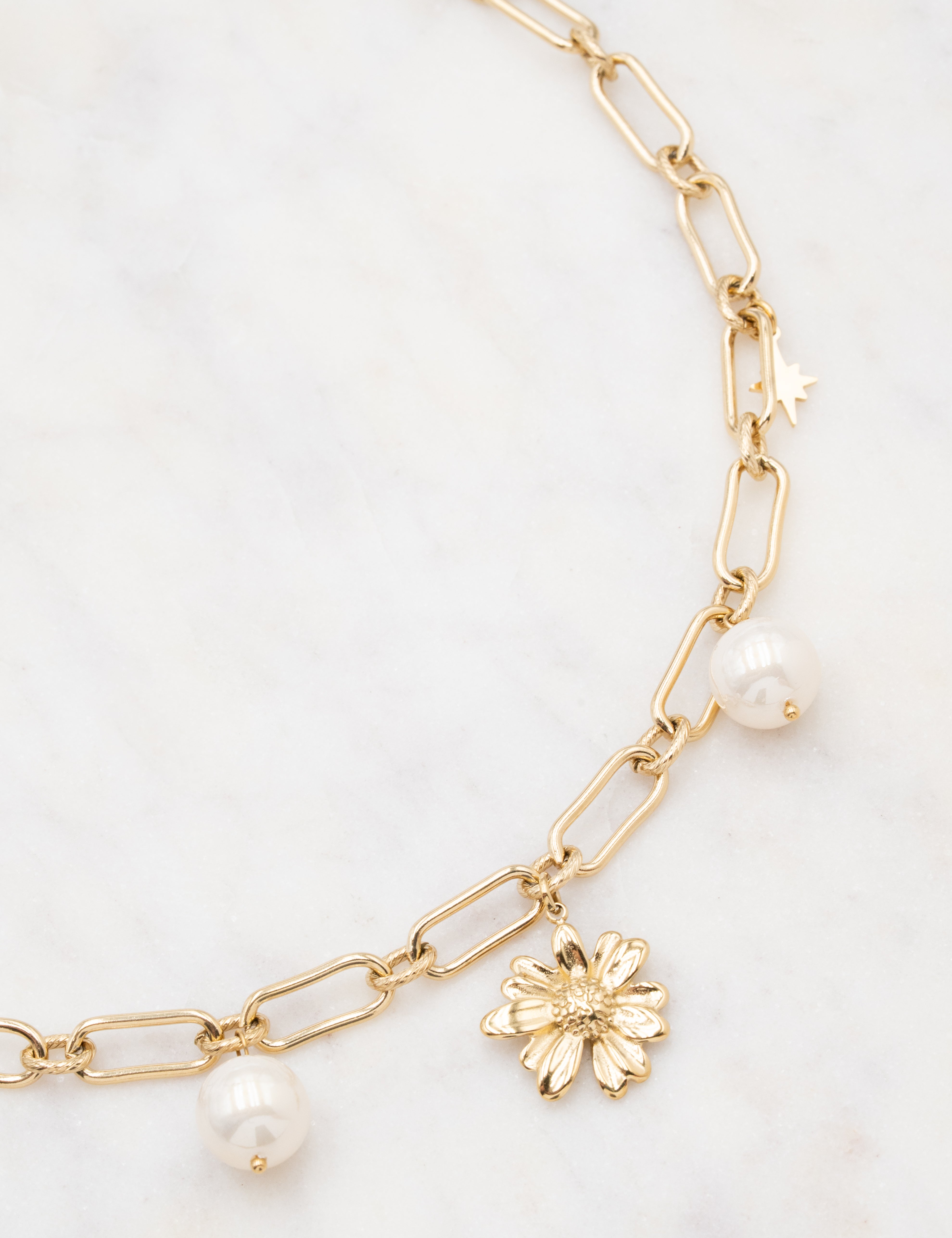 Collier réglable sur chaine maillons orné de plusieurs pampilles (deux perles en résine, deux pampilles étoilées et une pampille florale).