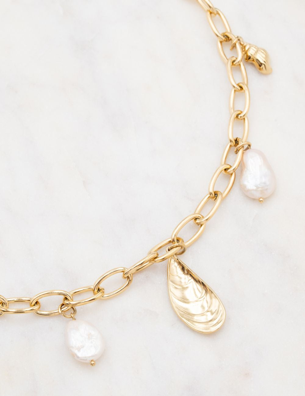 Collier réglable sur chaîne maillons orné de plusieurs pampilles coquillages et de perles d'eau douce.