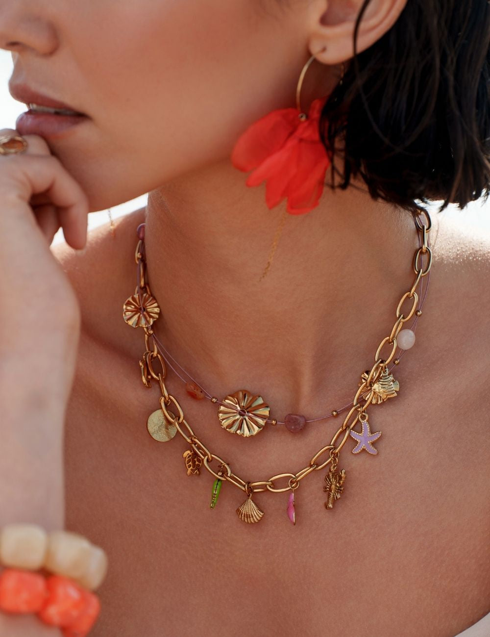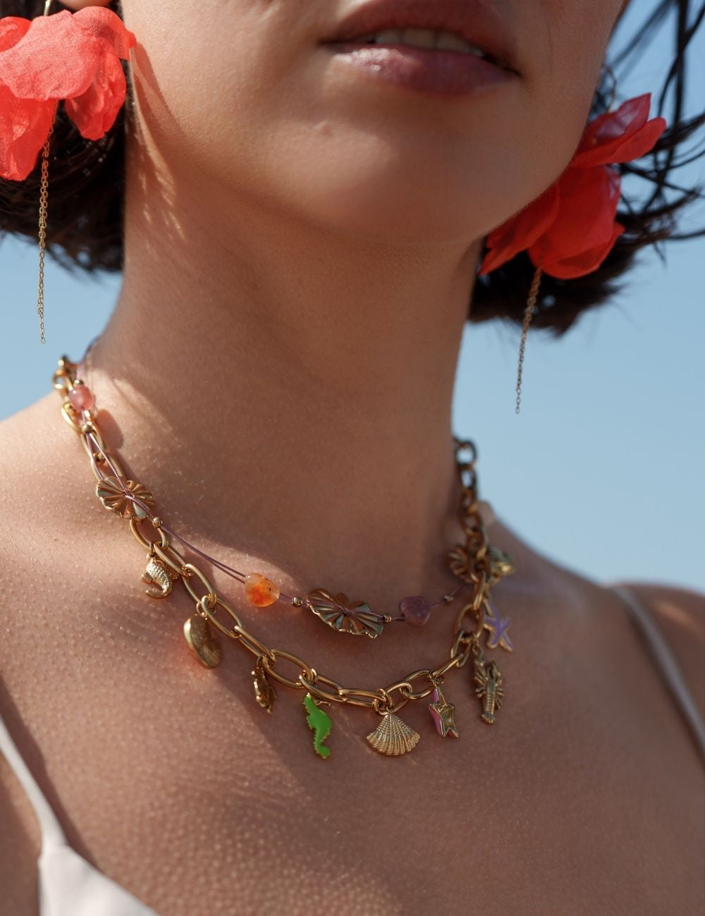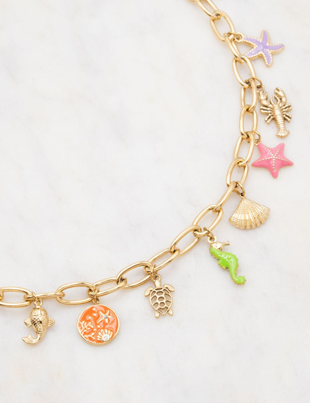 Collier réglable sur chaîne maillons orné de plusieurs pampilles dans le thème aquatique (poisson, homard, hippocampe, étoile de mer, tortue de mer, coquillage) en acier inoxydable et rehaussé par des touches  d'émail coloré.