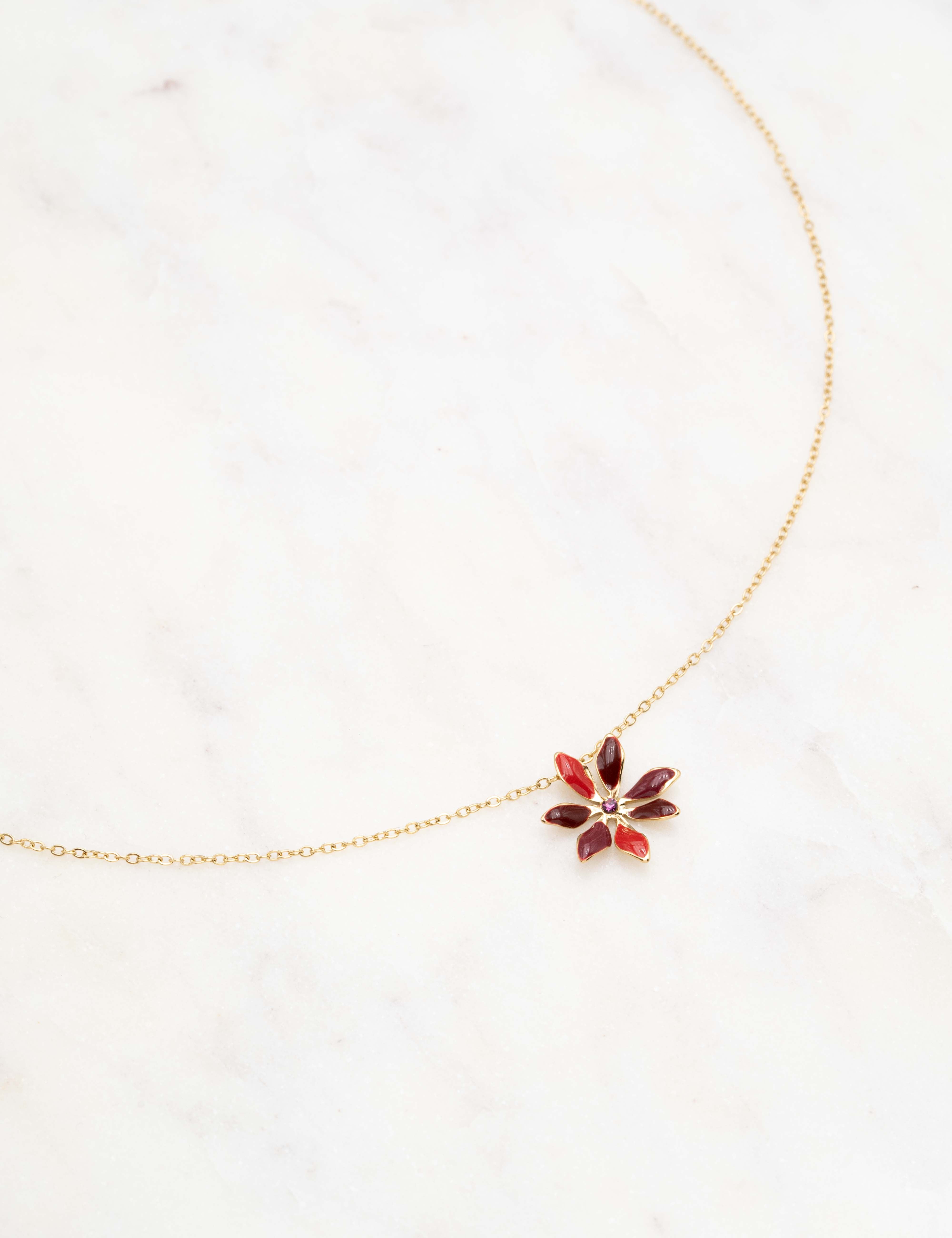 Collier réglable sur chaîne composé d'un pendentif au motif floral émaillé coloré et orné d'un strass.